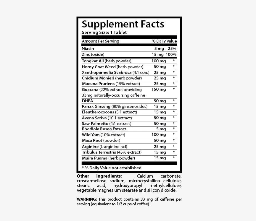UNLEASH -V- POWER MALE ENHANCEMENT STRENGTH & DESIRE Manufactured For Health Solution Prime Made in USA 1 Bottle 30 Tablets Benefits: Sexual performance booster Men's Sexual Disorders care Improving Sexual desire Increases Testosterone level Improves Fertility in Men UNLEASH-V-POWER and sex life. Your age, health, and how you feel about your relationship can all have an impact on your sexual life. In some situations, supplements might help. But you need to look at the big picture first. Don’t be shy about telling your doctor what’s going on. Before trying an herb or a supplement, think about what you can add or subtract from your life: exercise, weight loss, treating a condition. These can all help. Most of the attention about sex and supplements focuses on men. But what might work for a man doesn’t necessarily work for a woman. Both sexes have options. No woman will like a man who is not confident in himself. Male confidence greatly depends on their sexual performance, as well as on the size of their sexual organ. Doubting yourself is not a good way to please a woman. For this reason, there are many sexual performance boosters on the modern market. The UNLEASH-V-POWER is one of the most popular product in our shop of natural supplements. The list of the product's ingredients includes: L-arginine L-arginine is a nonessential amino acid that may play an important role in the care of cardiovascular health. It has been promoted as a growth stimulant and as a care for sexual disorders in men. Panax Ginseng Ginseng is beneficial for the sexual health in men. Ginseng may improve the firmness of erection and also the overall thickness of erection. This is because of the production of nitric oxide in the body. It is also generally used for enhancing concentration, thinking, physical stamina, memory and athletic endurance. It can be somewhat beneficial for care of depression. Maca Root (Lepidium Meyenii) Maca root powder is high in protein and carbs and rich in a number of nutrients, including vitamin C, copper and iron. It also contains many bioactive plant compounds. Maca has been heavily marketed as being effective at improving sexual desire and Care the Libido in Men and Women. Maca increases sex drive in both men and women. It may Increase Fertility in Men. When it comes to male fertility, sperm quality and quantity is very important. Maca can increase sperm production and improve sperm quality, thereby enhancing fertility in men. Maca can improve symptoms of menopause, including hot flashes and disrupted sleep at night. Maca may also improve your mental well-being and mood by reducing depression and , especially in menopausal women. Maca root powder is a popular supplement among bodybuilders and athletes. Supplementing with Maca may improve exercise performance, particularly during endurance events. Horny Goat Weed/Epimedium This herb is considered to be an herbal aphrodisiac and is able to stimulate blood flow in the human body. Tongkat Ali inhibiting the action of Sex Hormone Binding Globulin and as a result can increase the levels of testosterone. Probably, this is the only active ingredient that may be helpful in some way. Horny goat weed contains chemicals which might help increase blood flow and improve sexual functions. It also contains phytoestrogens, chemicals that act somewhat like the female hormone estrogen, that might reduce bone loss in postmenopausal women. Horny Goat Weed/Epimedium This herb is considered to be an herbal aphrodisiac and is able to stimulate blood flow in the human body. Tongkat Ali inhibiting the action of Sex Hormone Binding Globulin and as a result can increase the levels of testosterone. Probably, this is the only active ingredient that may be helpful in some way. Horny goat weed contains chemicals which might help increase blood flow and improve sexual functions. It also contains phytoestrogens, chemicals that act somewhat like the female hormone estrogen, that might reduce bone loss in postmenopausal women. Tribulus Terrestris Tribulus Terrestris extract is aphrodisiac herb which is often used for sexual enhancement as added ingredient. It increases libido, amount of ejaculation may also be improved. This herb is also believed to improve fertility in men. Above mentioned and other Natural herbal ingredients of UNLEASH-V-POWER may provide important enhancement in your sexual health and performances. Supplement Facts: Niacin 5mg Zinc (oxide) 15mg Tongkat Ali (herb powder) 100mg Horny Goat Weed (herb powder) 50mg Xanthoparmelia Scabrosa (4:1 con.) 25mg Cnidium Monieri (herb powder) 25mg Mucuna Pruriens (15% extract) 25mg Guarana (22% extract providing 33mg naturally-occurring ca?eine) 150mg DHEA 50mg Panax Ginseng (80% ginsenosides) 15mg Eleutherococous (5:1 extract) 15mg Avena Sativa (10:1 extract) 50mg Saw Palmetto (4:1 extract) 50mg Rhodiola Rosea Extract 5mg Wild Yam (10% extract) 100mg Maca Root (powder) 50mg Arginine (L-arginine hcl) 25mg Tribulus Terrestris (45% extract) 15mg Muira Puama (herb powder) 15mg Other Ingredients: Calcium carbonate, croscarmeliose sodium, microcrystallina cellulose, stearic acid, hydroxypropyl methylcellulose, vegetable magnesium stearate and silicon dioxide Serving Size: 1 Tablet, Servings Per Container: 30 SUGGESTED USE : As a dietary supplement, take one (1) tablet with 8 oz. of water daily, or as directed by a health care professional WARNING : This product contains 33 mg of caffeine per serving (equivalent to 1/3 cups of coffee). CAUTION : Do not exceed recommended dose. Pregnant or nursing mothers, children under the age of 18 and individuals with a known medical condition should consult a physician before using this or any dietary supplement. KEEP OUT OF THE REACH OF CHILDREN. DO NOT USE IF SAFETY SEAL IS DAMAGED OR MISSING. STORE IN A COOL, DRY PLACE. *These statements have not been evaluated by the Food and Drug Administration. This product is not intended to diagnose, treat, or prevent any disease. PREMIUM
