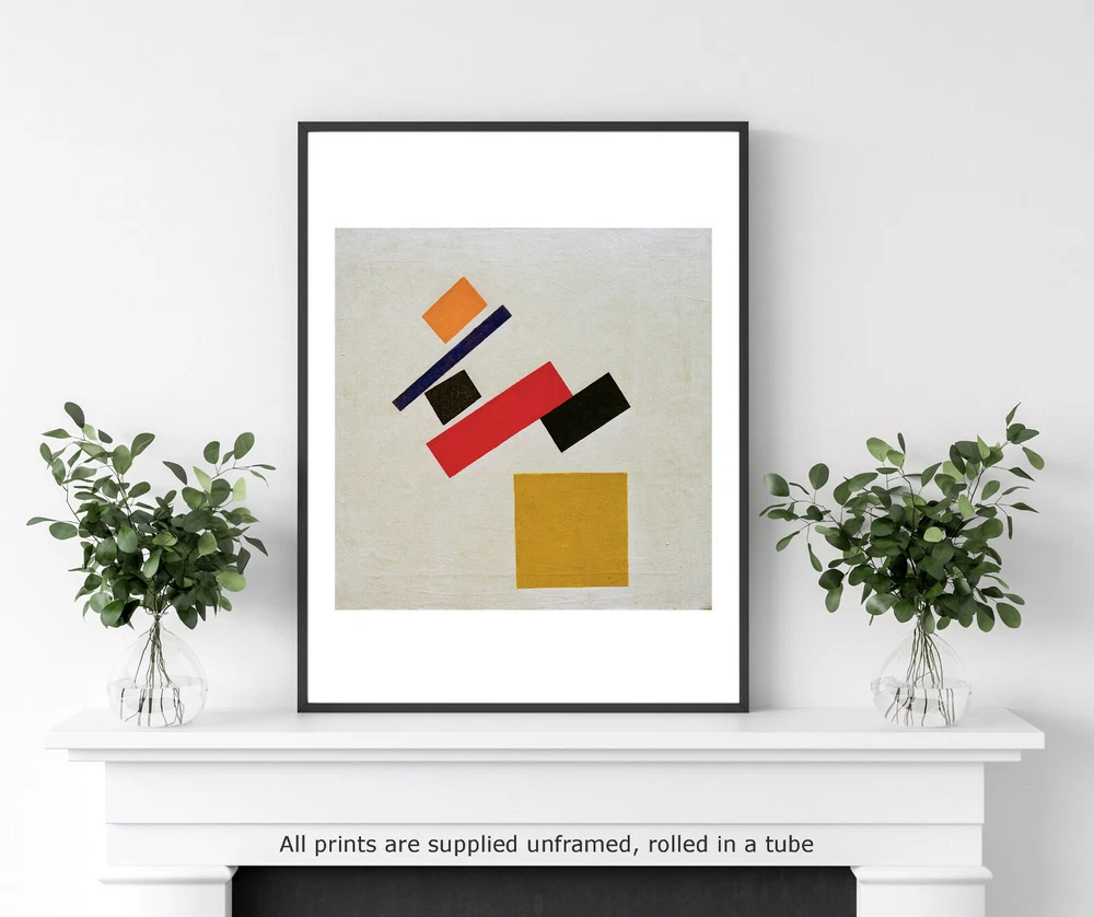 Suprematism by Kasimir Malevich fine art giclee print poster wall art WITH BORDER Choice of 17 standard sizes, unframed, printed to order and hand-finished in our studio. Browse our shop here: https://www.ebay.co.uk/str/anysizeprintsuk#tab0 Image size – please note! The sizes in the menu above are the paper sizes NOT the image sizes. Images are SMALLER to allow for the border. Image sizes vary a lot, and borders may not be even. Please contact me if you’d like to know the exact size of the border before ordering. Paper / media Choose from 4 different fine art media: Matte art paper 230 gsm. Popular standard option, with a smooth white matte surface. Colours are superb on this cost-effective choice. Satin lustre 260 gsm. For those who prefer a satin sheen on a heavier, smooth white paper. Stunningly vivid colour rendering! Canvas matte 350 gsm. Cotton canvas for that authentic fine art look. Canvas is supplied in a tube (not stretched). Frame it like a standard print. Fine art textured 300 gsm. The luxury option, with a subtle cream / off-white textured surface, like watercolour paper. This heavyweight paper is gorgeous! Ink We use a full set of water-based vegan archival inks to ensure fade resistance and longevity. Every care is taken over print and paper quality. Custom sizes If you would like your picture without a border, or in a specific size, please contact me with the dimensions you require and I will send you a custom layout at no extra charge. Price will be to the nearest standard size. Licensed art All our prints are fully licensed and come with a discreet copyright line on the bottom left border, small enough to be hidden in the rebate of the frame. Packaging Prints are carefully rolled into a strong cardboard tube with sealed end caps. Exception: the smallest 3 sizes (6x8in, 8x10in, A4) go in flat hard-backed envelopes. Delivery ALWAYS TRACKED! (We never use untracked standard services). In the UK - we use various couriers, depending on size of item and current courier performance, with a standard 3-day delivery. Outside the UK, various couriers depending on current performance, transit time 2-4 weeks depending on location. Free picture search If you can’t find the picture you are looking for, let me do the searching for you. I have access to many 1000’s of images, too many to list on ebay. There is no charge for this service Returns Please contact me if there are any problems with your order and I will do my best to help. On the rare occasion that a print arrives damaged, there is no need to return it, just send a photo of the damage and I will send a free replacement.