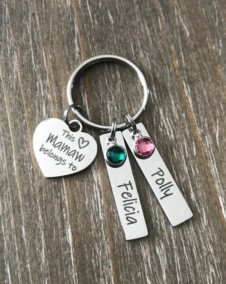 Listing is for Completed custom Name Keychain, Keychain includes heart charm with your choice of wording ( Up to 24 Characters ) and custom Bar Name charms with your choice of Names engraved ( up to 11 characters, capital letters count as 2 characters each ) and birthstones. Custom bar charms are 1 1/4" Stainless Steel heart charm is 3/4 Stainless Steel Key ring is 1" Stainless Steel Keychain will come in Gift box ready to Gift :) *IMPORTANT* Please be sure to include Names and Birth months in notes to seller during check out or in messages, if wording not requested this will come with This Mamaw belongs to :) Stainless Steel doesn't need polished, will not tarnish and doesn't stain the surrounding skin. It's properties are hypoallergenic for those with metal allergies. Please be sure to check messages after purchase in case of any questions I may have so your order is not slowed :)