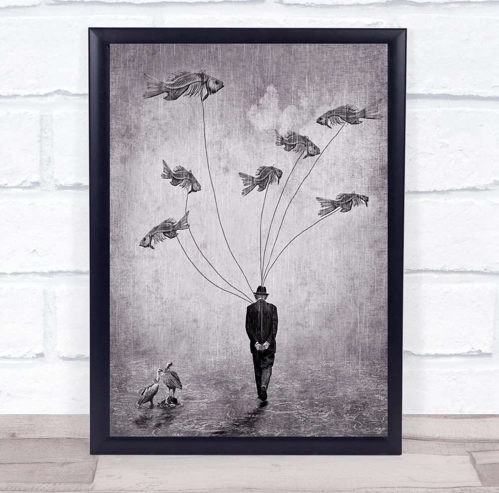 Man Monochrome Rain Rainy Cloudy Walk Walking Behind Back Fish Wall Art Print
