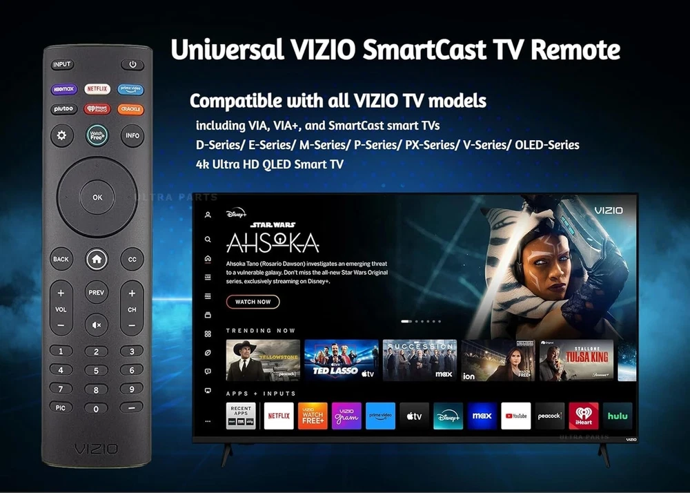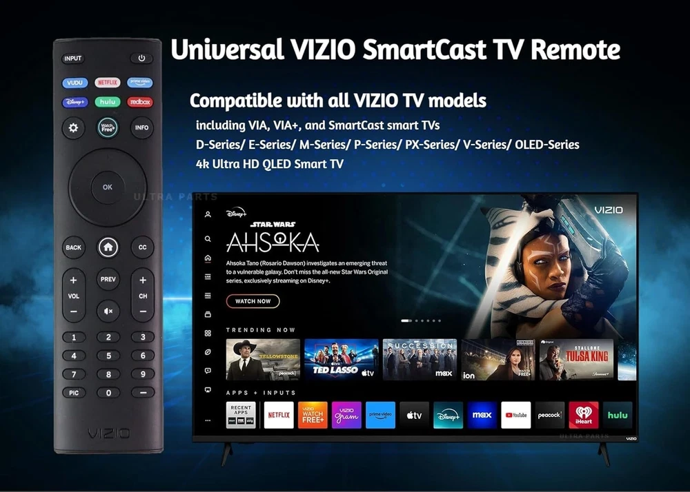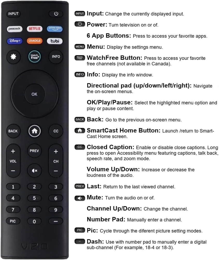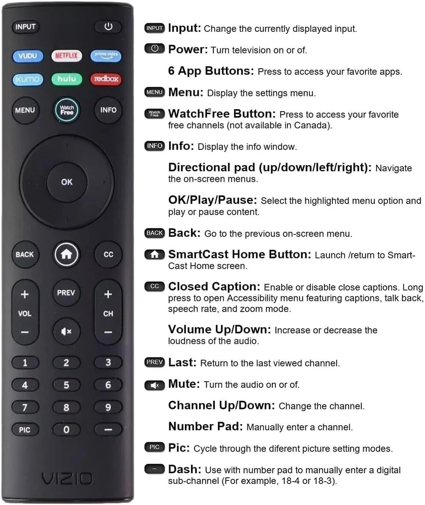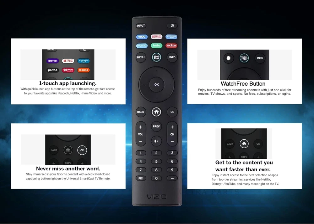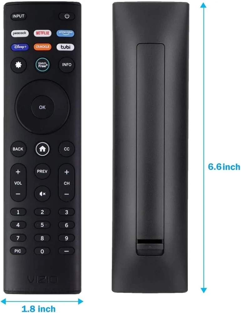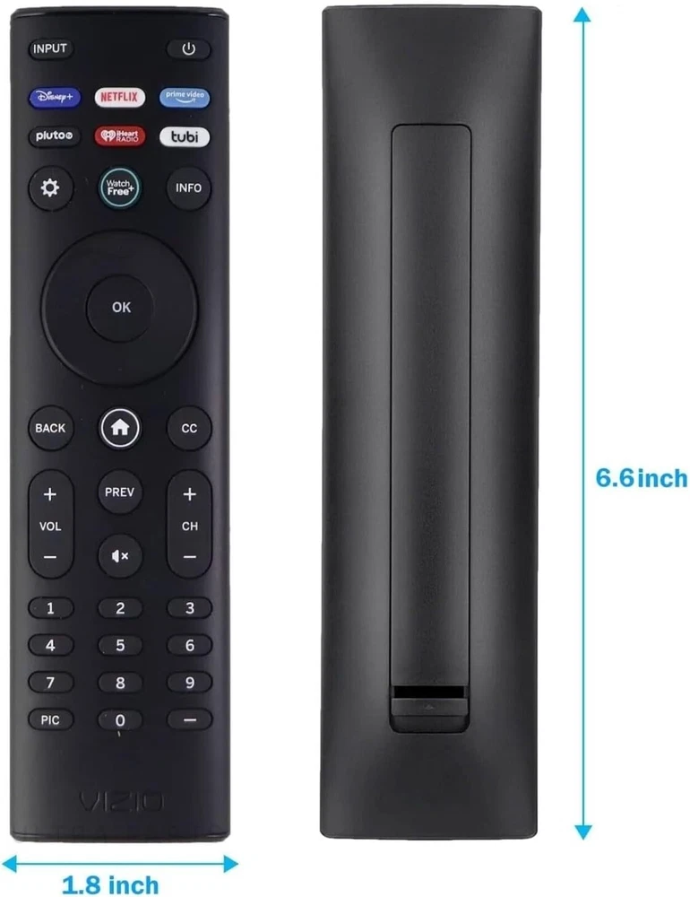 OEM Replacement Remote Control XRT140 fits for All VIZIO LED LCD HD UHD HDR Smartcast 4K 3D Smart TVs, including D-Series, E-Series, M-Series, P-Series, PX-Series, V-Series, OLED-Series with 6 Shortcut APP Keys. Compatibility: Full HD 4K-Series: VHD32M-0807 VHD24M-0810 VFD32M-0807 VFD40M-0810 VFD43M-0804 V4K43M-0801 V4K50M-0807 V4K55M-0801 V4K65M-0804 V4K70M-0801 V4K75M-0804 V4K86C-0804 D-Series: D24h-J09 D24F-F1 D24F-G9 D24H-G9 D32h-J09 D32F-F1 D32F-G4 D32H-F0 D32H-F1 D32H-F4 D39F-F0 D39F-F1 D40F-F1 D40F-G9 D43-F1 D43F-F1 D43F-F2 D43FX-F4 D48F-F0 D50-F1 D50-F501 D50F-F1 D50X-G9 D55-F2 D55X-G1 D60-F3 D65-F1 D65X-G4 D70-F3 D24F-G1 D32F-G1 D32H-G9 E-Series: E32-D1 E32H-D1 E40-D0 E43-D2 E43-E2 E43-F1 E43U-D2 E48-D0 E48U-D0 E49U-D1 E50-D1 E50-E1 E50-E3 E50-F2 E50U-D2 E50X-E1 E55-D0 E55-E1 E55-E2 E55-F0 E55-F1 E55U-D0 E55U-D2 E60E-3 E60-E3 E60-F3 E60U-D3 E65-D0 E65-D1 E65-E0 E65-E1 E65-E3 E65-F0 E65-F1 E65U-D1 E65U-D3 E70-D3 E70-E3 E70-F3 E70U-D3 E75-E16 E75-E3 E75-F1 E75-F2 E80-E3 E80-F3 E80U-DE M-Series: M50-D1 M50-E1 M55-D0 M55-E0 M55-F0 M60-D1 M65-D0 M437-G0 M507-G1 M557-G0 M558-G1 M657-G0 M658-G1 M65-E0 M65-F0 M70-D3 M70-E3 M70-F0 M70-F3 M75-E1 M80-D3 M43Q6-J04 M43Q6M-K04 M50Q6-J01 M50QXM-K01 M55Q6-J01 M65Q6-J09 M65Q6M-K04 M75Q6-J03 P/PX-Series: P50-C1 P55-C1 P55-E1 P55-F1 P55RED-F1 P65-C1 P65-C1 P65-E1 P65-F1 P75-C1 P75-E1 P75-F1 P659-G1 P759-G1 PX65-G1 PX75-G1 PQ65-F1 V-Series: V405-G9 V435-G0 V435-G1 V436-G1 V555-G1 V556-G1 V585-G1 V605-G3 V655-G9 V656-G4 V705-G1 V705-G3 V755-G4 V505-G9 V435-J01 V435M-K04 V505-J09 V505M-K09 V555-J01 V585-J01 V655-J09 V655M-K04 V655M-K03 V705-J01 V705-J03 V755-J04 OLED-series: VQD43M-0801 M55Q6-L4 M65Q6-L4 M75Q6-L4 VQP65C-84 VQP75C-84 OLED65-H1 OLED55-H1 Product Description Compatible Brand: VIZIO Smartcast 4K 3D Smart TVs Remote Feature Shortcuts. Upgrade Chip, Durable Lifespan, High Quality, and Stable Performance. Designed for easy replacement and operation. Color: Black Material: ABS Material. Stability and Safety: Better viewing experience, Easy to pair, and made from premium quality materials for long-lasting durability. Package Content: 1 x IR Remote Control (Batteries and Instruction Manual are not included).