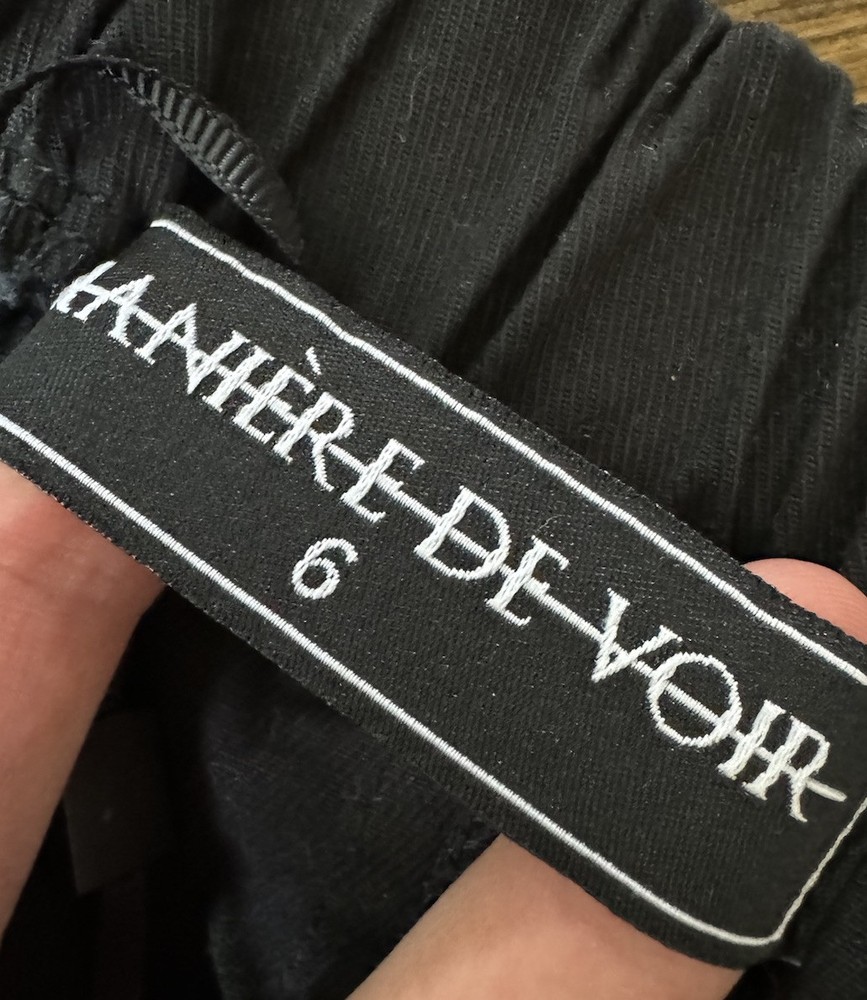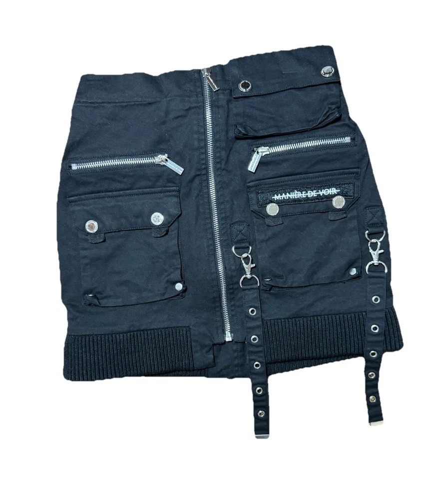 This Maniere De Voir Mini Skirt in size 6 is a stylish piece with a streetwear and gothic-inspired design. The skirt features a solid black color with studded accents and various hardware details like buttons, buckles, and zippers, giving it a unique and edgy look. Made from a combination of elastane and cotton, it offers a comfortable fit with a mid-rise waist and convenient pockets. The canvas fabric adds to its durability, making it a versatile piece for a bold and trendy wardrobe. EUC Size 6 Waist 24" Length 14"
