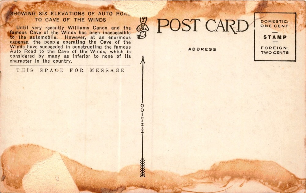 The postcard depicts six elevations of the Auto Road to the Cave of the Winds in Manitou, Colorado. The Cave of the Winds and Williams Canon were previously inaccessible by automobile until the construction of the Auto Road. The road was built at great expense by the operators of the Cave of the Winds and is now considered a remarkable feat, offering access to a natural wonder.