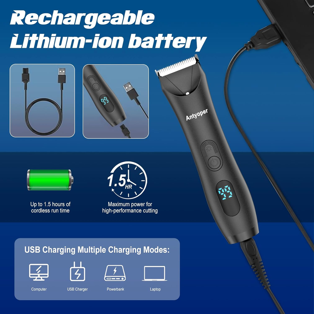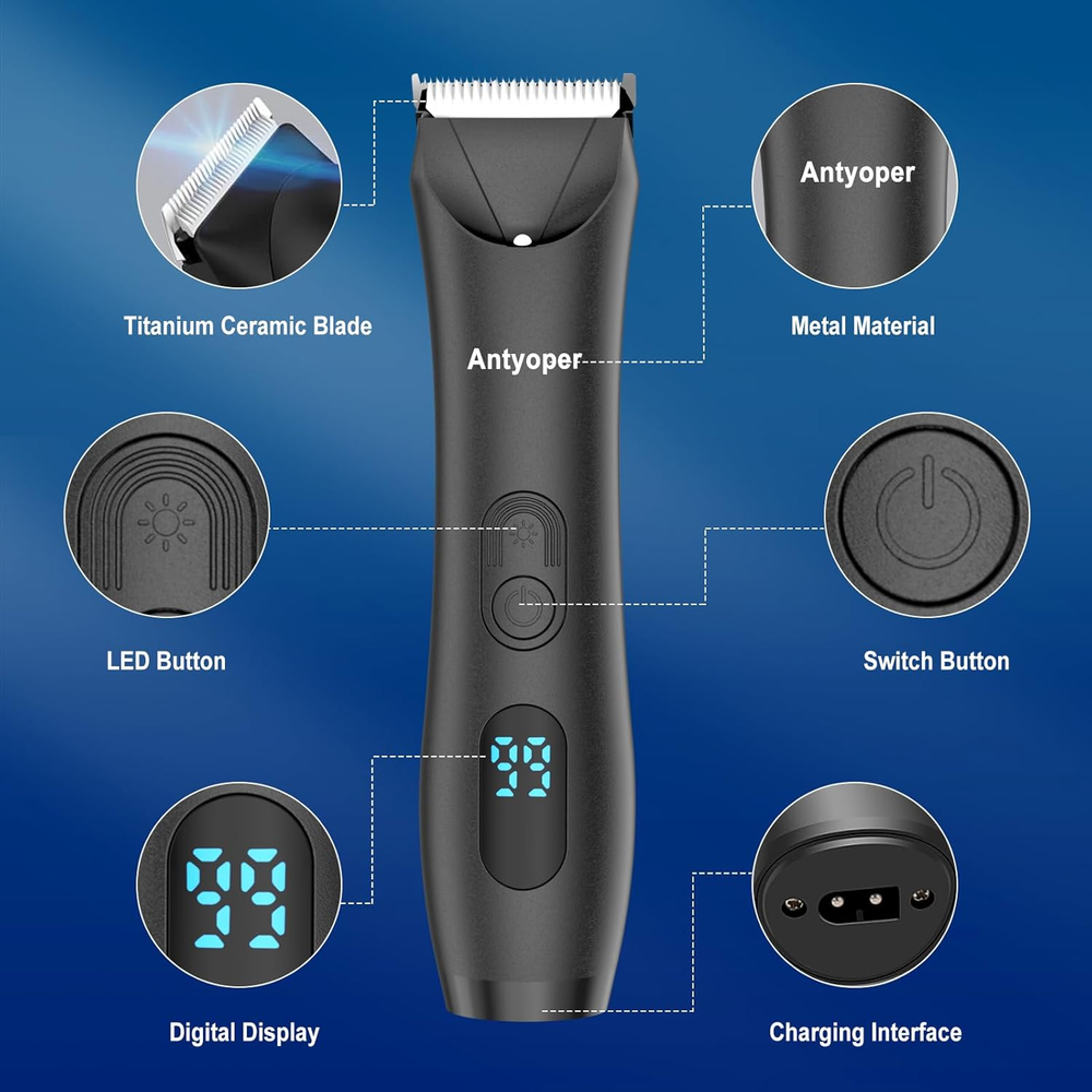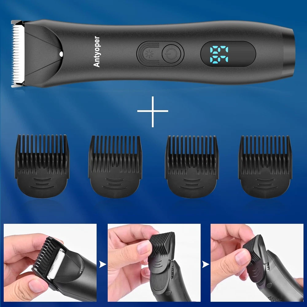 Special Care: Our Antyoper electric groin & body mens grooming kit allowing you to shave or trim any length of hair in all body zones, including the most sensitive ones. The LED light design provides precision in any direction, wet or dry, making it easily portable. Its hypoallergenic ceramic blades avoid irritation and allow you to shave with confidence. Stretch out your skin and cut slowly and steadily for the best results, and experience a new level of comfort and care. Ergonomic Design and Waterproof: The sleek design of our trimmer for men/women helps you grip it easily even when it's wet. It's waterproof, allowing you to use it in the shower or bath for easy trimming and cleanup. Perfect for trimming back hair, chest hair, pubic hair, bikini hair, and underarm hair, this electric trimmer will quickly become your go-to grooming tool. Long-Lasting and Rechargeable Dock: The built-in battery is rechargeable via USB and provides up to 120 minutes of run-time when charged for about 1.5 hours. It's a durable and reliable choice for all your grooming needs. Featuring electric trimmer guards with four lengths (3mm, 6mm, 9mm, 12mm), it suits any trimming preference. Waterproof: It's easier to trim in the shower, as the water washes away your trimmings, makes it easier to cut Back hair/Chest hair/Pubic hair. It's ideal to get one that can survive a splash whether you shave in or out of the shower. Confidence-Boosting Grooming: Tend to your own bodily gardens with ease and feel confident and presentable every day. Use the groin hair trimmer for a smoother, more comfortable shave that releases your natural charm. Get ready for every date, job interview, or special occasion with ease, knowing you look and feel your best. Product Description