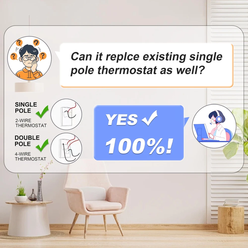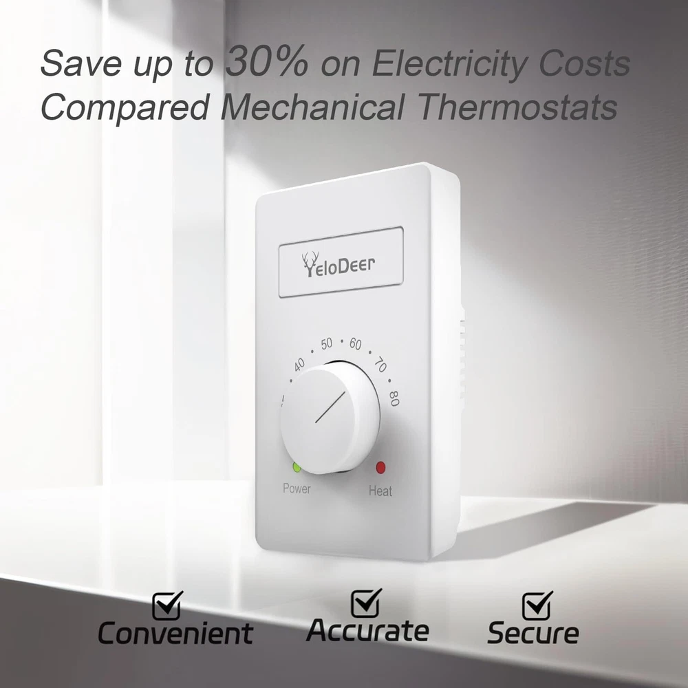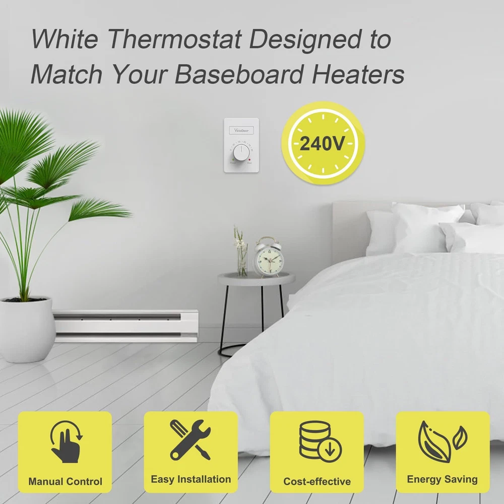 Stylish Design: Our white thermostat is designed to match your baseboard heater, with a thin, light, and delicate design that sits flush against the wall. The large knob allows easy adjustment to all temperatures, making it the perfect addition to your home heating system Superior Accuracy: Our electronic thermostat offers much higher accuracy compared to traditional mechanical baseboard thermostat, ensuring precise temperature control for your 240 v, Max. 4800 W heating system Extended Range: Our thermostat can be wired to 240 v and offers a control range of temperature from 40 °F to 80 °F (4.4 °C to 26.7 °C), providing customizable comfort for your home User-Friendly Manual Control: Our non-programmable thermostat is designed for easy use, with a user-friendly interface that everyone can easily set and adjust the temperature. Indicator lights clearly show the connection point and whether heating is taking place Easy Installation: Our thermostat comes complete with detailed installation instructions and is conveniently with baseboards, connectors, and fan-forced heaters, making it an ideal choice for your home heating needs