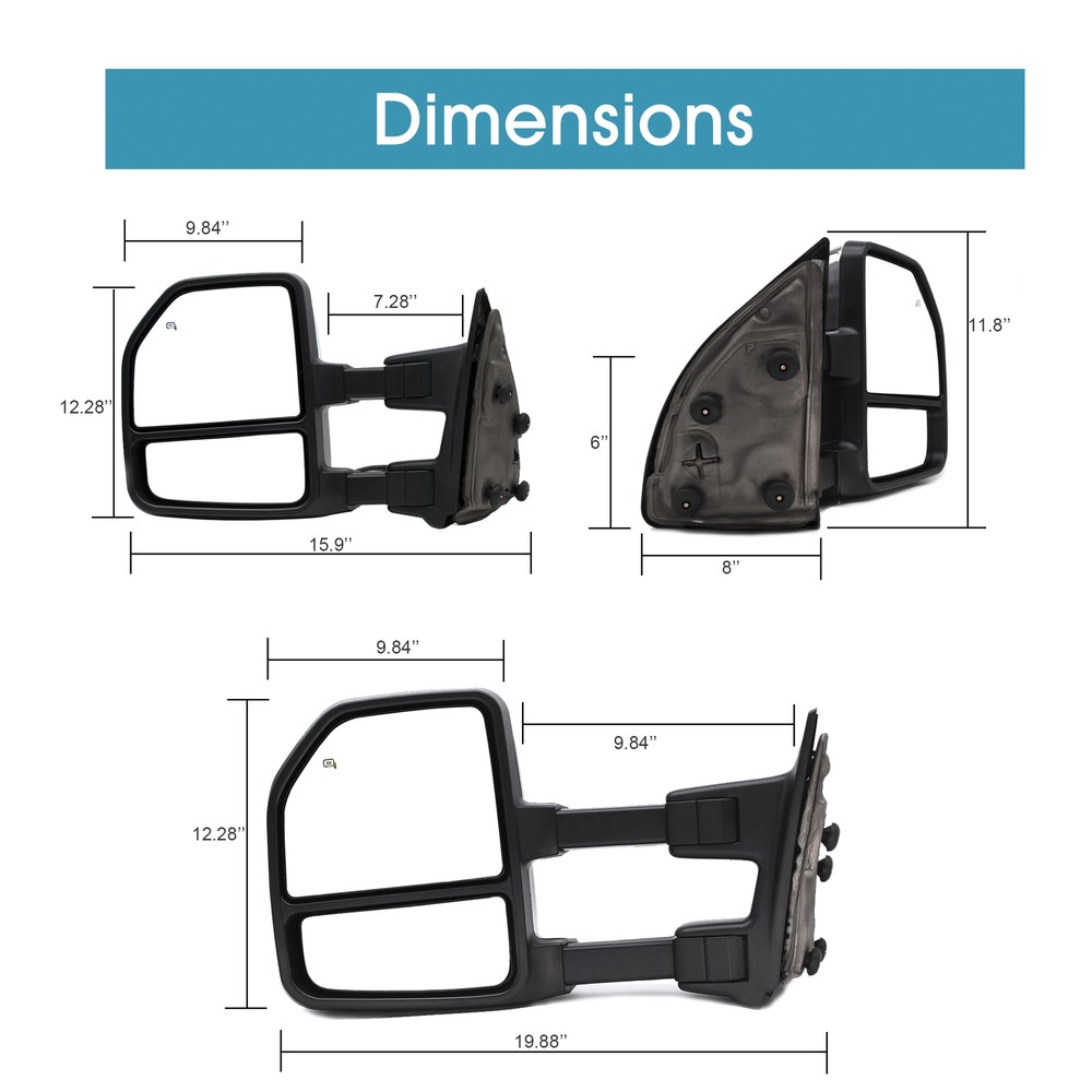 Product Description Detailed description of the product Specifications : Condition New Number Of Pieces 2 Fold Away Manual Fold Warranty 1 Year Color Chrome Location Passenger Right + Driver Left Side Features: A Pair of Tow Mirrors(Passenger Right Side and Driver Left Side) Direct Replacements Manual Adjustable Towing Mirrors Manual Extendable Arm Fits: 1999 2000 2001 2002 2003 2004 2005 2006 2007 2008 2009 2010 2011 2012 2013 2014 2015 2016 Ford F-250 F-350 F-450 F-550 Super Duty Towing Mirrors Note : These mirrors will only work properly on vehicles with these exact options. If your vehicle does not have the options listed, these mirrors may not function properly. No installation guide. Professional installation is highly recommended. In the event the item should fail due to manufacturing defects during intended use, we will replace the part by free.(1 Year Warranty) If you encounter any problems, please contact us and we will provide you with solutions. Thank you! Payment Shipping Returns Contact Us PayPal is our preferred method of payment for all of our eBay sales. For customer service please contact us via eBay MessagesImmediate payment via PayPal is required for all Buy It Now items. If you need special arrangements, please contact us through eBay messages. Generally, all goods will be shipped within 24 hours after the payment on the working day (except for goods sent from China). If you want to cancel the order or change the address, please contact us within 6 hours after payment, otherwise we will not be responsible. It takes 3-5 working days for logistics and transportation to be delivered. If you are not satisfied with your purchase, you may return it, for a refund or replacement - subject to the following: Contact us through eBay messages or the returns link to receive a Returned Merchandise Authorization (RMA) number to ensure proper handling of the return and/or replacement. In order to be eligible for a full refund, less shipping expenses, your returned merchandise must be in its original new condition, as shipped, with all packaging, manuals, and paperwork intact and unaltered. Items which have been opened are returnable, however they will carry a restocking fee. If that product is returned for a refund, the shipping expenses incurred, will be deducted from the refund. If an item is refused, the carrier bills us for shipping both ways, and these expenses incurred on your behalf need to be deducted from your refund If you have a question about a part you should contact us before buying.And If you have any questions after purchase, please contact us and we will provide a satisfactory solution. Payment PayPal is our preferred method of payment for all of our eBay sales. For customer service please contact us via eBay MessagesImmediate payment via PayPal is required for all Buy It Now items. If you need special arrangements, please contact us through eBay messages. Shipping Generally, all goods will be shipped within 24 hours after the payment on the working day (except for goods sent from China). If you want to cancel the order or change the address, please contact us within 6 hours after payment, otherwise we will not be responsible. It takes 3-5 working days for logistics and transportation to be delivered. Returns If you are not satisfied with your purchase, you may return it, for a refund or replacement - subject to the following: Contact us through eBay messages or the returns link to receive a Returned Merchandise Authorization (RMA) number to ensure proper handling of the return and/or replacement. In order to be eligible for a full refund, less shipping expenses, your returned merchandise must be in its original new condition, as shipped, with all packaging, manuals, and paperwork intact and unaltered. Items which have been opened are returnable, however they will carry a restocking fee. If that product is returned for a refund, the shipping expenses incurred, will be deducted from the refund. If an item is refused, the carrier bills us for shipping both ways, and these expenses incurred on your behalf need to be deducted from your refund Contact Us If you have a question about a part you should contact us before buying.And If you have any questions after purchase, please contact us and we will provide a satisfactory solution. Related Products Chrome Tow Mirrors Power Turn Signal For 2017-20 Ford F350 F450 Super Duty LH+RH Towing Mirrors Power Heated For 2008-2016 Ford F350 Super Duty LH+RH Chrome Cap Chrome Towing Mirrors Power For 1999-2001 Ford F250 F350 F450 F550 SD Left+Right Pair Side Tow Mirrors Power Heated Fits Fits 2007 Ford F350 F450 F550 SD Chrome Towing Mirrors Manual Fold For 1999-2016 Ford F250 F350 F450 SD Left Right Side Towing Mirrors Power Turn Signal For 1999-2016 Ford F-350 F-450 SD LH RH Chrome Heated √ √ √ √ NO √ Power √ √ √ √ NO √ Turn Signal Light √ √ √ √ NO √ temperature sensor √ NO NO NO NO NO Puddle Light NO √ √ √ NO √ Clearance Light √ √ √ √ NO √ housing color Chrome Chrome Chrome Chrome Black Chrome folding Manual Manual Manual Manual Manual Manual fit for 17-20 Ford F-250 F-350 F-450 F-550 08-16 Ford F-250 F-350 F-450 F-550 99-01 Ford F-250 F-350 F-450 F-550 99-07 Ford F-250 F-350 F-450 F-550 99-16 Ford F-250 F-350 F-450 F-550 99-16 Ford F-250 F-350 F-450 F-550 [22 Pin Plug] On Dec 6, 2024 at 10:26:10 PST, seller added the following information:
