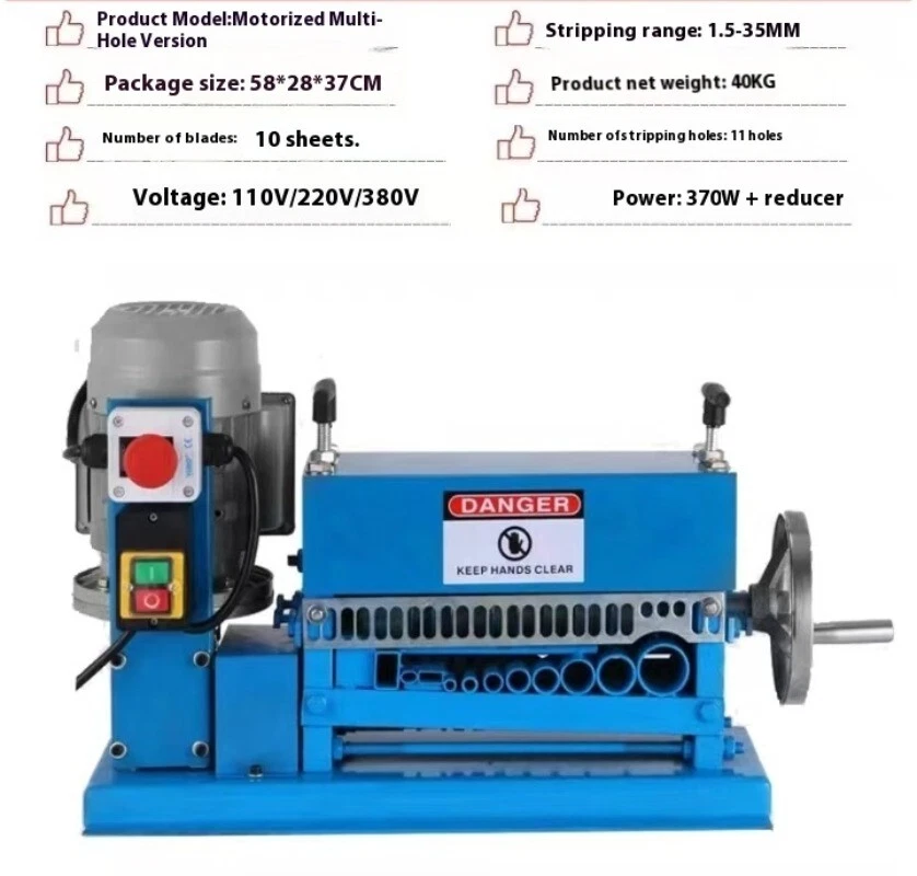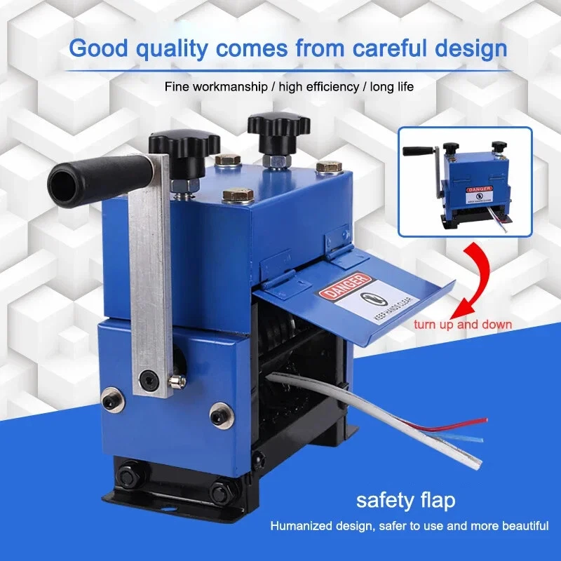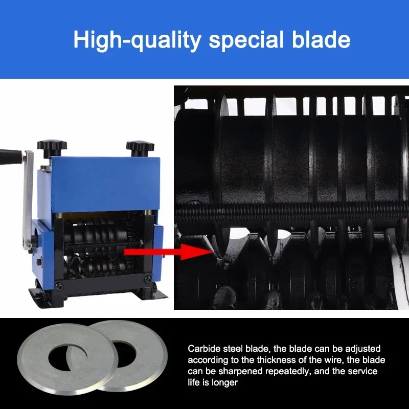 Manual stripping machine porous small home hand cranked peeling machine scrap copper wire peeling machine Product Model:Blue Porous Version Stripping range:1.5-15 MM Package Size:22*13*25.5CM Net weight:10KG Number of blades:6 Number of holes:5 round holes+1 flat hole