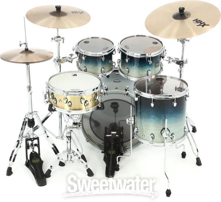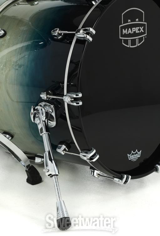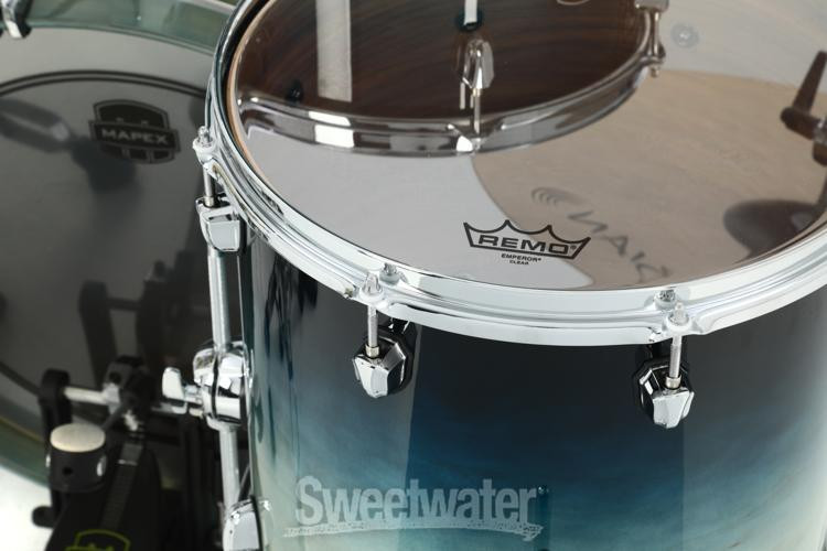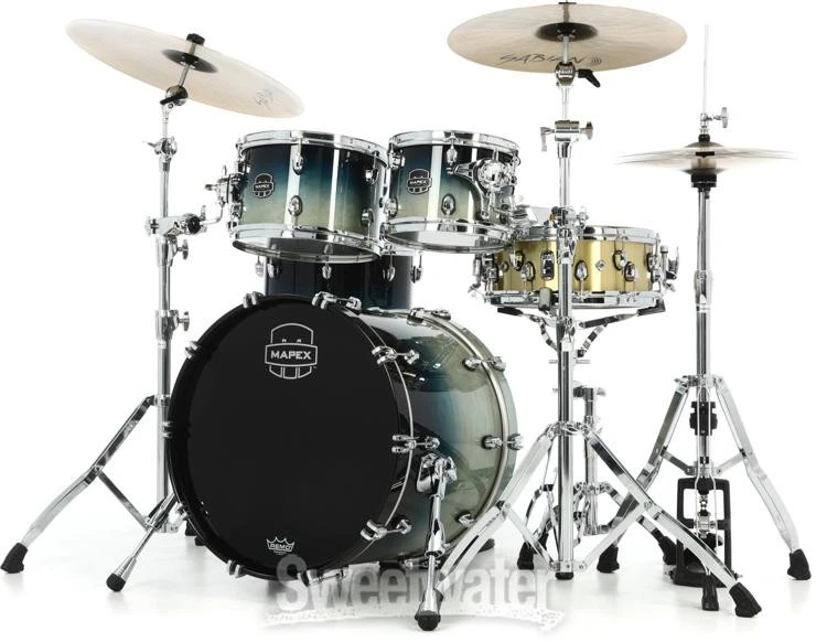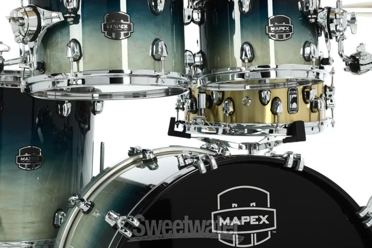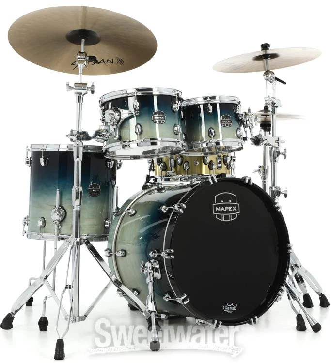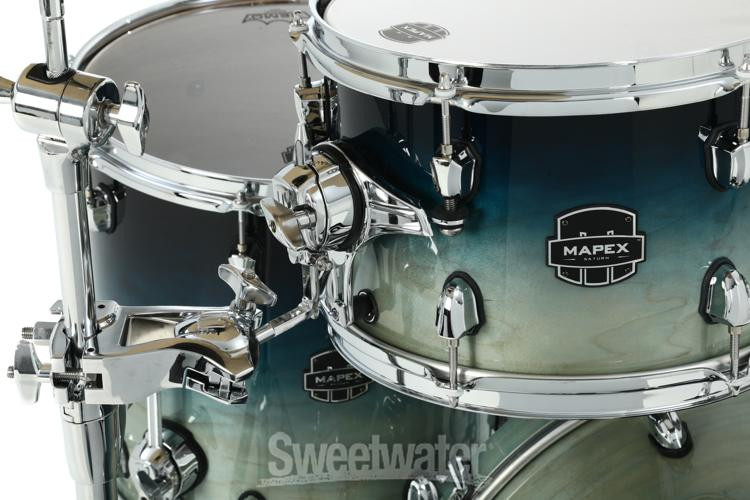 The Classic Saturn Sound — Now Better Than Ever The latest Mapex Saturn Series shell packs blend time-honored maple/walnut shells with bleeding-edge shell tech borrowed from the Black Panther Design Lab — along with enough jaw-dropping finish options to please a wide range of drummer tastes. Each piece in this set has been molded to meet the needs of demands of stage and studio professionals. You get thin, 6-ply hybrid shells crowned with Mapex's precision SONIClear bearing edges, Remo USA heads, and Mapex Power Hoops to deliver great tone and tuneability from day one. You also get Mapex's advanced shell venting, suspension tom mounting, and floating SAS floor tom legs for excellent note length and projection. Factor in those iconic Saturn Series badges and lugs, and the Mapex Saturn from Sweetwater is a clear winner in its class.Saturn Shell Technology 6-ply maple/walnut shells The secret to the classic Saturn sound Sweetwater is an Authorized Mapex Dealer Genuine New Item Sweetwater's 2-year warranty Mapex Saturn SR504X 4-piece Fusion Shell Pack - Teal Blue Fade 4-piece Maple/Walnut Shell Pack with 10" and 12" Toms, 14" Floor Tom, and 20" Bass Drum - Teal Blue Fade The Classic Saturn Sound — Now Better Than Ever The latest Mapex Saturn Series shell packs blend time-honored maple/walnut shells with bleeding-edge shell tech borrowed from the Black Panther Design Lab — along with enough jaw-dropping finish options to please a wide range of drummer tastes. Each piece in this set has been molded to meet the needs of demands of stage and studio professionals. You get thin, 6-ply hybrid shells crowned with Mapex's precision SONIClear bearing edges, Remo USA heads, and Mapex Power Hoops to deliver great tone and tuneability from day one. You also get Mapex's advanced shell venting, suspension tom mounting, and floating SAS floor tom legs for excellent note length and projection. Factor in those iconic Saturn Series badges and lugs, and the Mapex Saturn from Sweetwater is a clear winner in its class. Saturn Shell Technology 6-ply maple/walnut shells The secret to the classic Saturn sound is the thin maple-walnut shell formulation. The 4-ply maple exterior supplies ample cut and projection in a live setting. And the 2-ply walnut core provides a chewy darkness and growling resonance to serve drummers in the studio. In concert, these tonewoods give each shell in the Saturn shell pack a strong attack and rich, lingering sustain. SONIClear bearing edges Better tone and easier tuning — that's what you can expect across the range of Saturn series toms and kick drums. Mapex's precision SONIClear bearing edges allow heads to sit flatter and thus make better contact with the shell. This results in better seating and a stronger, deeper fundamental. In our experience, just finger-tightening heads was enough to make these Saturn drums sing. This widens the tuning range for players who like deeper toms and kick drums while producing purer musical pitches in higher registers. Mapex Power Hoops Rugged steel 2.3mm triple-flanged Power Hoops give each Saturn Series shell a commanding voice and presence, along with enough durability to survive a national tour. Black Panther Design Lab Hardware Nodal Line Air Flow Venting Scheme When it comes to drums, feel is every bit as important as tone. The Mapex Saturn shell pack features vents placed along the nodal line of every shell — a concept borrowed from the Black Panther Design Lab. This gives each drum an open, lively response while serving to maximize the shell's natural resonance in any tuning register. SAS Static Floor Tom Legs "The shortest path between two points is a straight line." Remember that lesson from geometry class? Archimedes said it. And as it turns out, sound and vibrations work on the same principle. Mapex's SAS floor tom legs feature sharp 90° angles to increase distance from the floor to the shell. This allows less of your tom sustain to be absorbed into the floor, which means greater note length and a cleaner soundstage. Sonic Pedestal Floor Tom Feet Mapex's SAS floor tom feet — again borrowed from the Black Panther Design Lab — do a great job at floating floor tom shells in order to prevent the earth or stage from leaching away your hard-earned depth and resonance. Paired with the SAS 90° legs, it makes for an impressive nearfield response from behind the kit. SONIClear suspension mounts The Saturn Series's low-profile SONIClear suspension mounts prevent tom energy from being absorbed into the hardware, allowing the true voice of the heads and shells to ring out. These mounts don't touch the tension rods in any way. The advantages of this are threefold. Tom sustain never gets choked out by the hardware Heads stay in tune much longer Head changes are quicker, with no need to remove shells from mounts Ready to Rock with Remo USA Heads Your Saturn shell pack includes a full set of Mapex-branded Remo heads for an accurate representation of the tones that lie within. Sweetwater couldn't have picked a better pairing ourselves. Toms come crowned with two-ply Emperor Clear batter heads for a time-honored studio tone. The bass drum is treated to a Powerstroke P3 Clear batter head for a modern attack and lasting life. Mapex Saturn Fusion 4-piece Shell Pack Features: The classic Saturn sound — now better than ever Jam-packed with Black Panther Design Lab features and hardware 6-ply maple/walnut shells boast a strong attack and growling sustain SONIClear bearing edges maximize tone and tuning range Nodal Line Air Flow Vents improve resonance and response Tone-enhancing SONIClear tom hardware lets shells and heads ring true Toms include Remo Emperor Clears for a time-honored studio tone Kick drum includes a Remo Powerstroke P3 Clear for a modern attack Includes suspension tom mounts and floor tom legs; all other hardware sold separately Cymbals, stands, and snare not included Specification Detail Finish Teal Blue Fade Configuration Shel