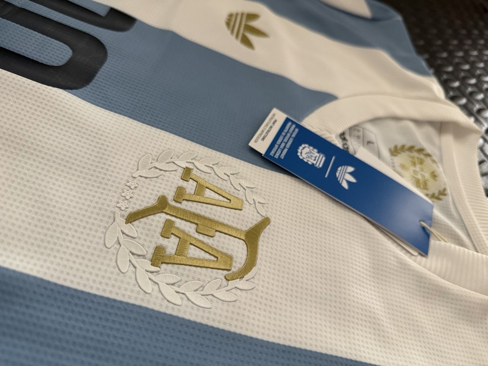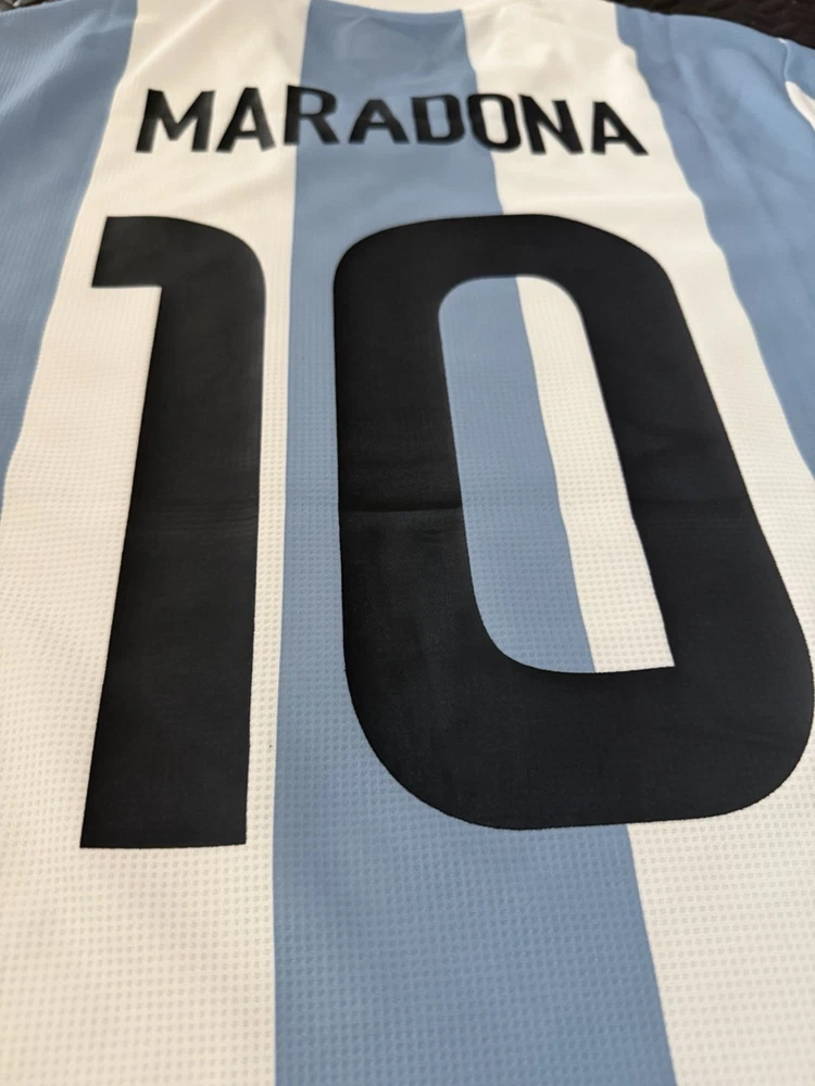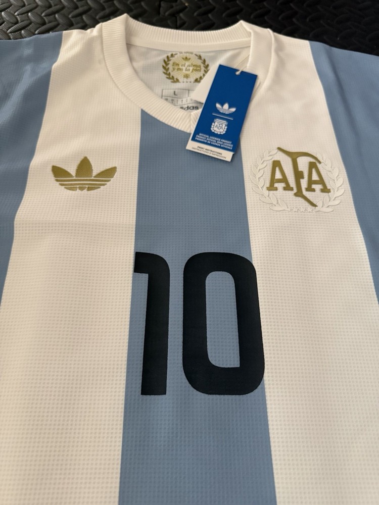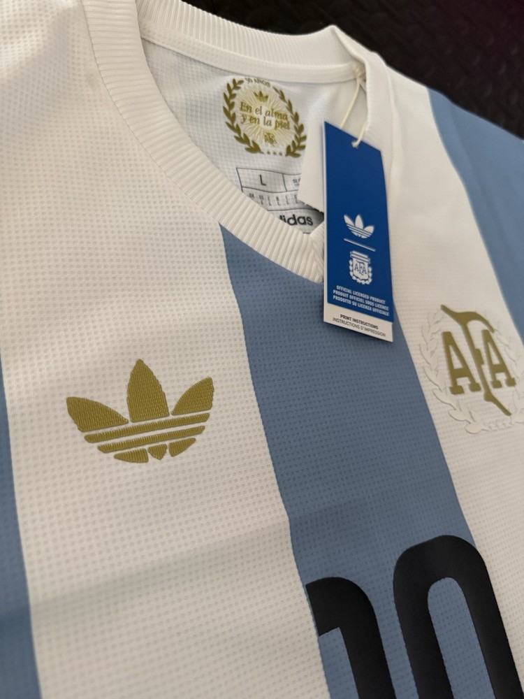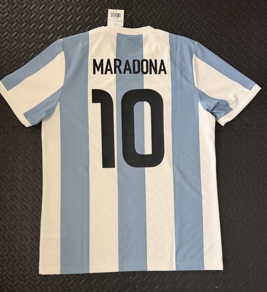 The Maradona Argentina Aniversario 50 Years Soccer Jersey by Adidas is a vintage style t-shirt in size L featuring short sleeves and a crew neck design. It is made of jersey fabric in a blue color, suitable for summer and spring seasons. This regular fit shirt is machine washable and perfect for any man looking to celebrate the legacy of Argentine soccer legend Diego Maradona.