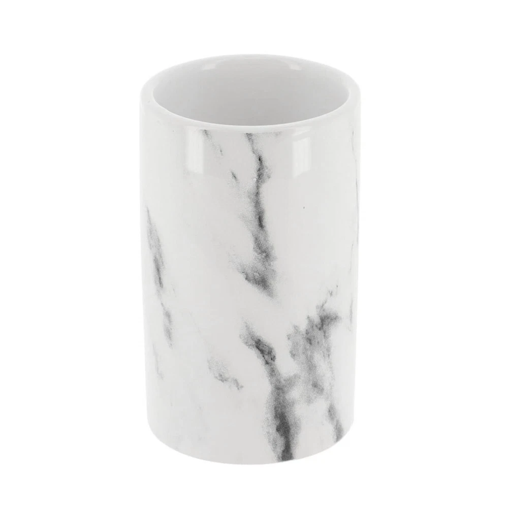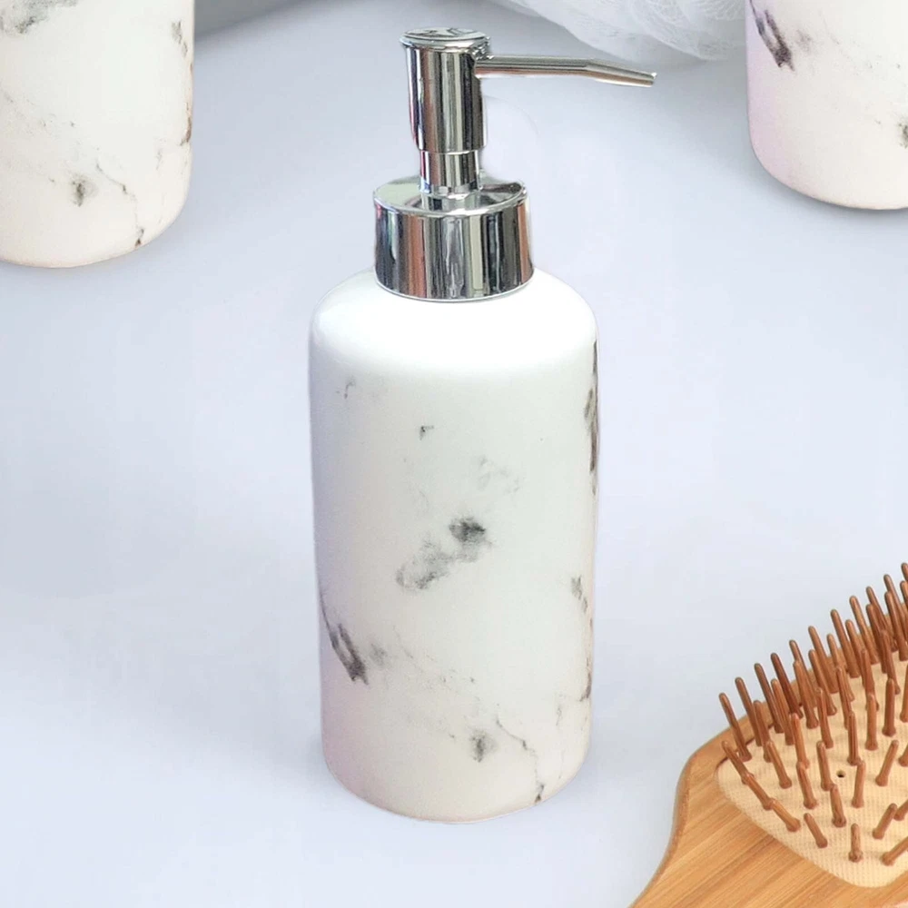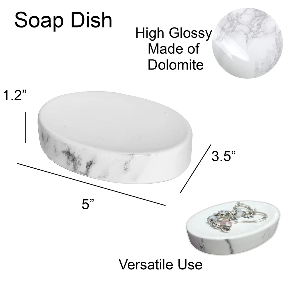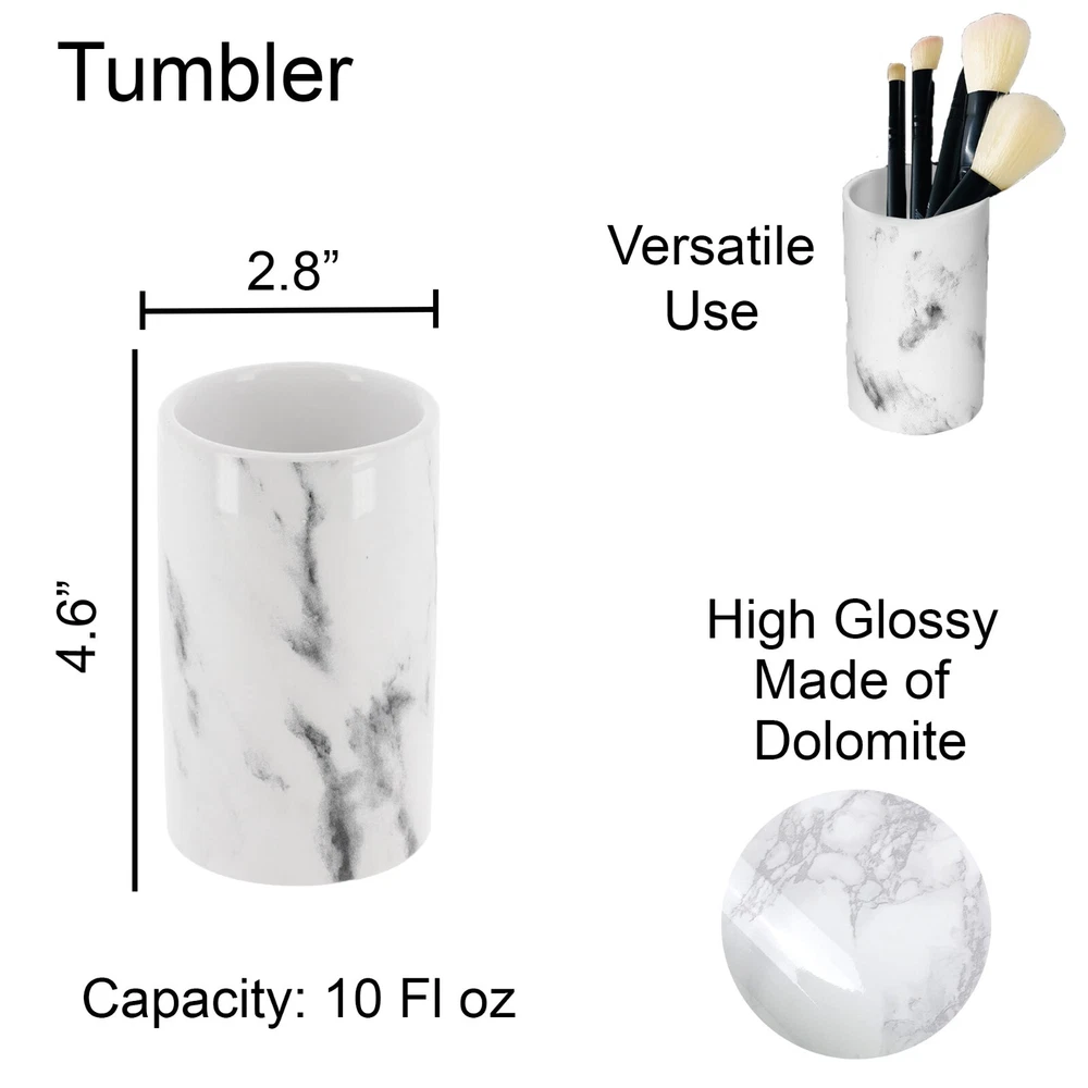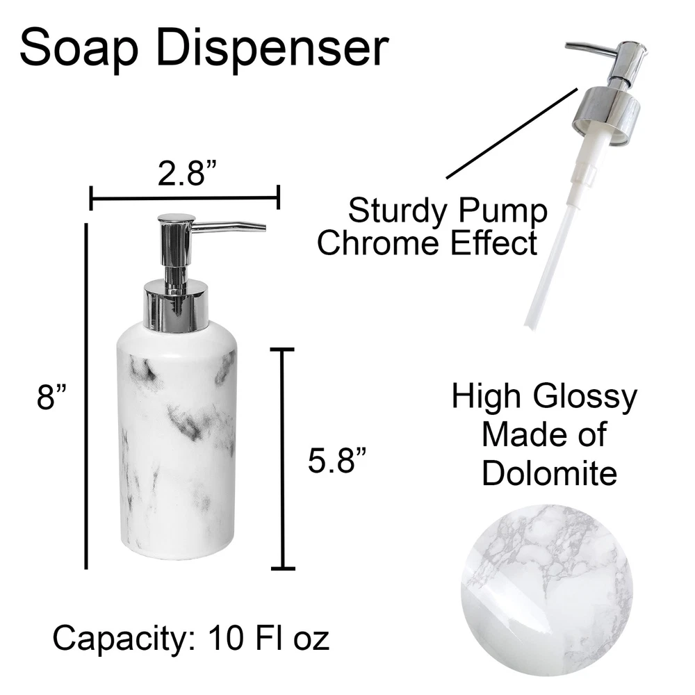 Choose the piece you need or the full set MARBLE EFFECT DESIGN: Enjoy the unique combination of the shiny smooth surface and the printed marble design of this bathroom accessory set which brings a sophisticated and modern style to your bathroom. 4 PIECES MATCHING COLLECTION: Complete your bathroom countertops with those accessories featuring a tumbler, a soap dispenser, a toilet brush with holder and a soap dish cup HIGH-QUALITY: Enjoy the sturdy construction of this set of 4 pieces, this bathroom set is made of durable polyresin which is rust free, the bottom is textured to avoid any slippage from the counter top or from the floor. This lovely bathroom accessories set will last for years on any bath, kitchen counter top, vanity or bath floor VERSATILE: The perfect decoration accessories set for master, guest or kids bath. Add a nice touch to your counters, kitchen, laundry or vanity. Also suitable for commercial use PERFECT GIFT: For its stylish design and the convenience it brings, this bathroom accessory set is an ideal gift for ladies and girls for Christmas, New Year, Valentine's Day, Mother's Day, Birthday or Party. Grace your bathroom vanities with elegance and modern style using this Marble effect bath accessory Set 4-pieces . If your bathroom counters look a little cluttered, you may need to upgrade your space with these bathroom accessories. Stop throwing your bathroom essentials all over the counter and use one of these convenient sets instead. Actually Evideco's bath sets are designed to be enjoyed individually or as a whole. With offerings such as soap dispenser, tumbler, toothbrush holder, soap dish cup, vanity tray, waste basket or toilet brush holder. Indeed, adding style to your bathroom, kitchen, laundry or for your vanity décor is easier than ever. A collection of useful holders, trays and organizers makes getting through morning and evening routines joyful and easy. Moreover, our bathroom accessories sets offer style and décor, no matter what design you love. Plus, they're durable and made with easy-to-clean materials. We offer plastic, ceramic, bamboo, acacia and stainless steel materials that won't rust after use .In short, our bath accessory set will complete your new bathroom look in seconds. But also, it will allow you to neatly arrange your bath essentials with style. Enjoy this Marble bath accessory Set 4-pieces to freshen up your countertops and bring style to your home in seconds."