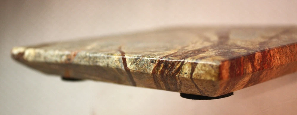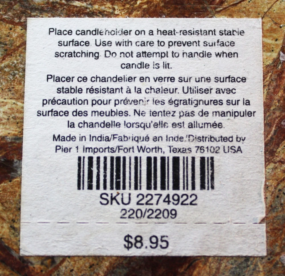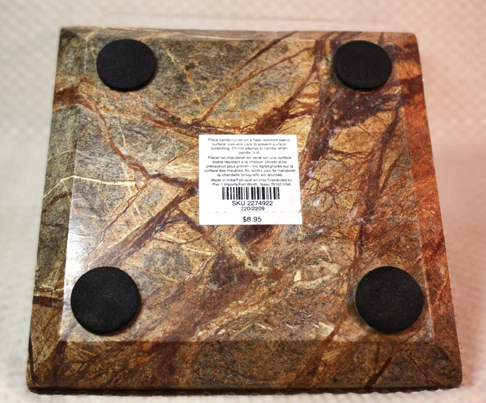 This Pier 1 trivet is made of marble in India, featuring a beige/brown color with beveled edges. Measuring 6 inches square, it doubles as a candle holder or a heat-resistant surface for pots and pans. The trivet is equipped with padded feet to protect surfaces from scratches and heat damage, making it a versatile and stylish addition to any kitchen or dining space.