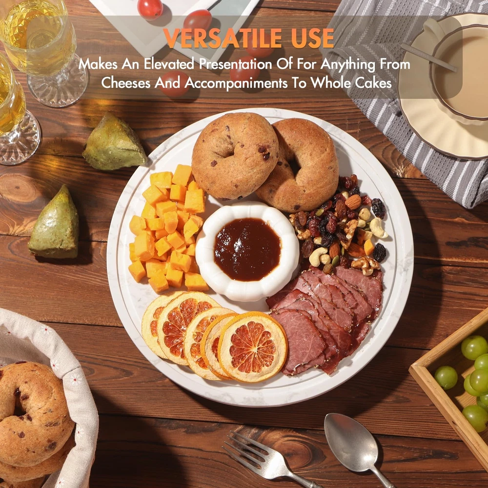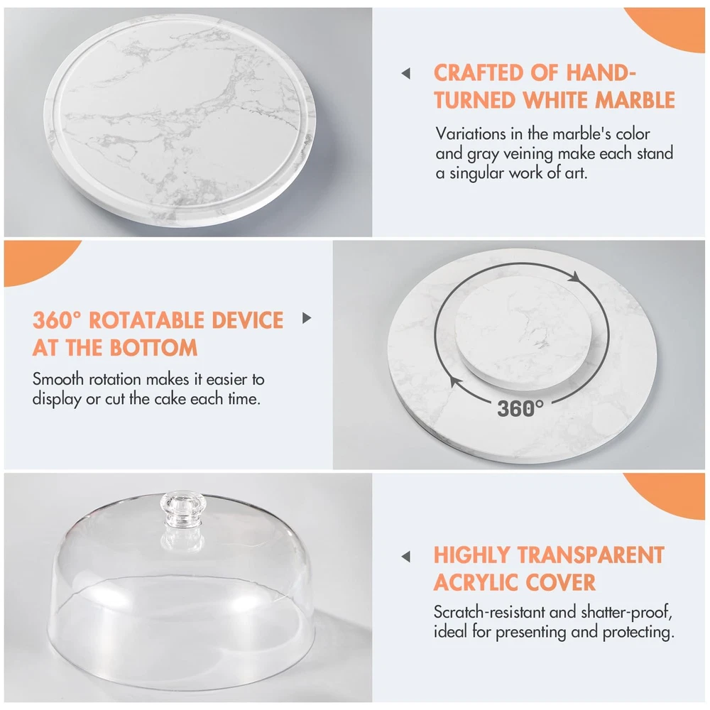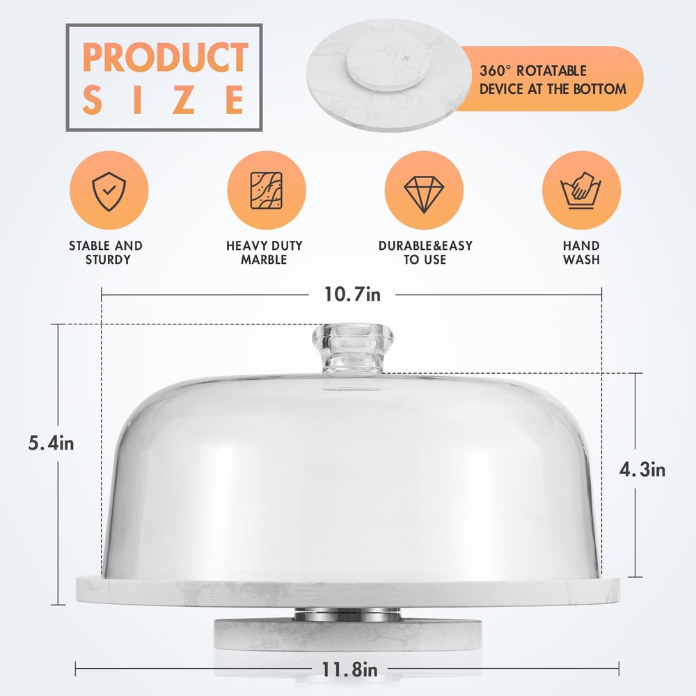 Simple styling and rotatable design make this marble cake stand an elegant choice for presenting cakes, desserts or appetizers.A great hostess gift, it highlights the natural beauty of artisanal desserts. 360° ROTATABLE CAKE STAND:Simple styling and rotatable design make this marble rotatong cake stand an elegant choice for presenting cakes, desserts or appetizers.A great hostess gift, it highlights the natural beauty of artisanal cakes and desserts. CRAFTED OF HAND-TURNED BEAUTIFUL WHITE MARBLE:Handcrafted from solid and heavy duty white marble, this stand makes an elevated presentation of for anything from cheeses and accompaniments to whole cakes to hors d'oeuvres and confections. Variations in the stone's natural gray veining make each stand unique. CLEAR ACRYLIC DOME:The rounded acrylic dome balances luxurious quality and fresh modern style and is topped with a ball lid for easy grip.Acrylic is characterized by a high degree of transparency and it is shatter-proof. STYLISH AND VERSATILE:With its cool touch and natural elegance, our white marble cake stand makes a stunning presentation at the table.Whether displaying cakes,cucakes,pastries, small sandwiches or decadent desserts, this elegant stand brings a touch of whimsy to special gatherings.The stand coordinates perfectly with your beautiful dinnerware and pairs easily with other table settings. IDEAL FOR GIFTING:Each piece is a reminder how a special gift can create memories, 'make the moment’ and be treasured forever.Makes for an excellent baking gift for birthdays, weddings, and any occasion where smiles and sweetness are desired.We believe that the person who loves baking receives this cake stand will definitely use it every day with joy!