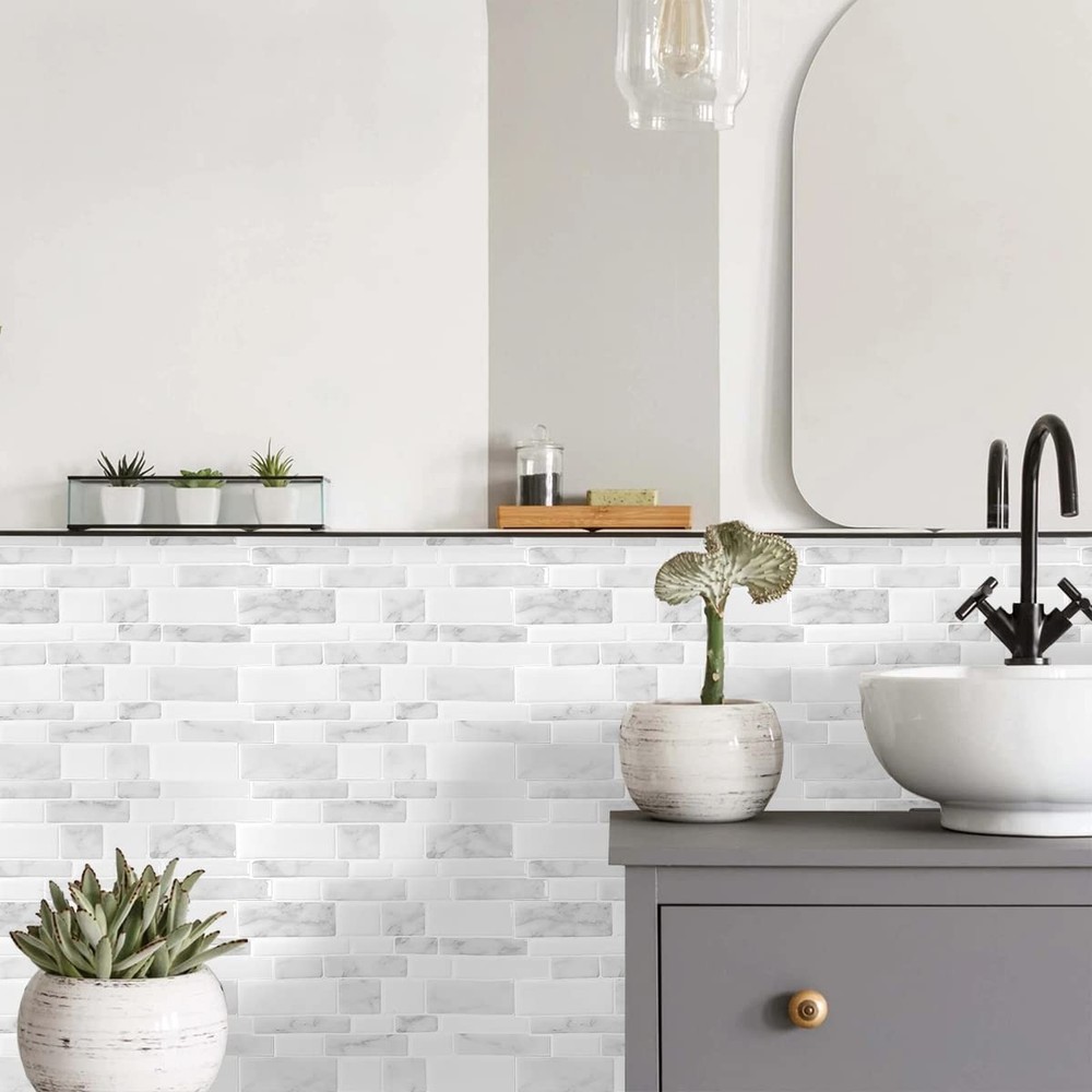 Peel and Stick Backsplash 3D Gel-like Surface The peel and stick backsplash with a realistic and non-transparent tile look ditional tiles(real ceramic tile), our tiles are thin, lightweight, yet durable. They are easy to install Easily cut and trim with a blade cutter or scissors for your space, perfect for, kitchen and bathroom backsplash, wall, fireplace, rv. Due to different shooting methods and display screen resolution setting, the actual color of the product may be different from that on the website. If there has any questions or concerns by received product and product installation, please contact us in time. Features Easy cut and trim, heat shield, waterproof Easy DIY, peel and stick on backplash Stronger adhesive, no extra glue or grout required Light-weighted, soft and elastic, flexible Easy clean and maintenance(maintain with a damp cloth or sponge.) How to Install Before you use this project, clean the wall surface before installing and make sure that the wall is dry. Used on the surface of your flat and smooth, non-porous, and non-crumbling wall surfaces space including kitchen, bathroom, laundry room, worktop, etc. DO NOT APPLY on uneven, textured surfaces, greasy, oily, brick, porous wood, or gypsum walls directly. NOTE: The new painting wall need to dry for 3 weeks before install peel and stick tile. NOT all the latex/repainted walls can be installed directly, for rough surfaces and heavy textured walls, please follow the instruction: 1.Sand the surface with sanding paper or spackling paste 2.Clean the wall with damp cloth 3.Wait until the wall is totally dry Spray the adhesive more on the joint area on both wall and tiles