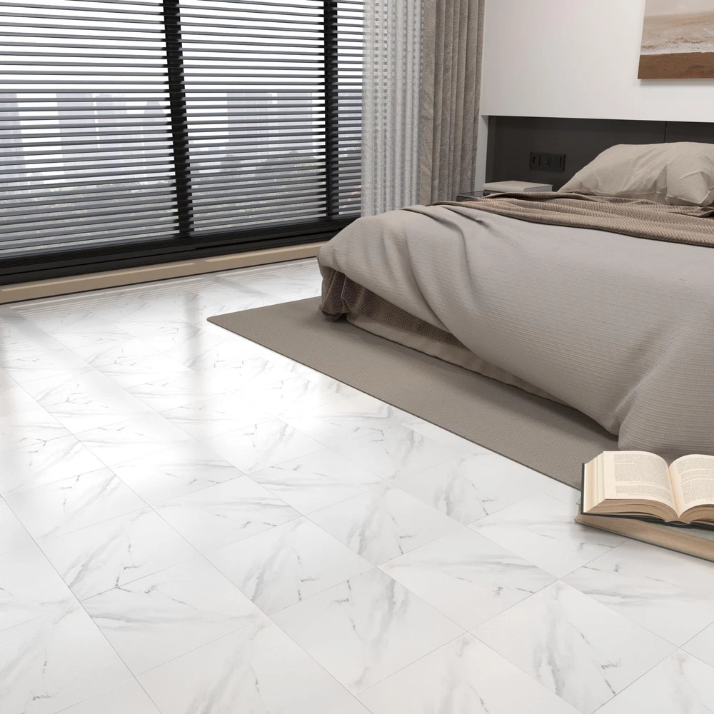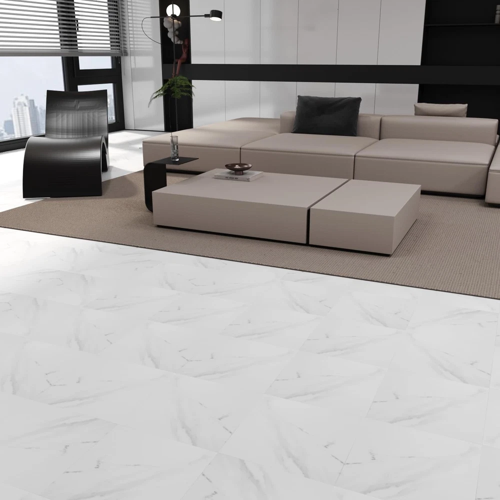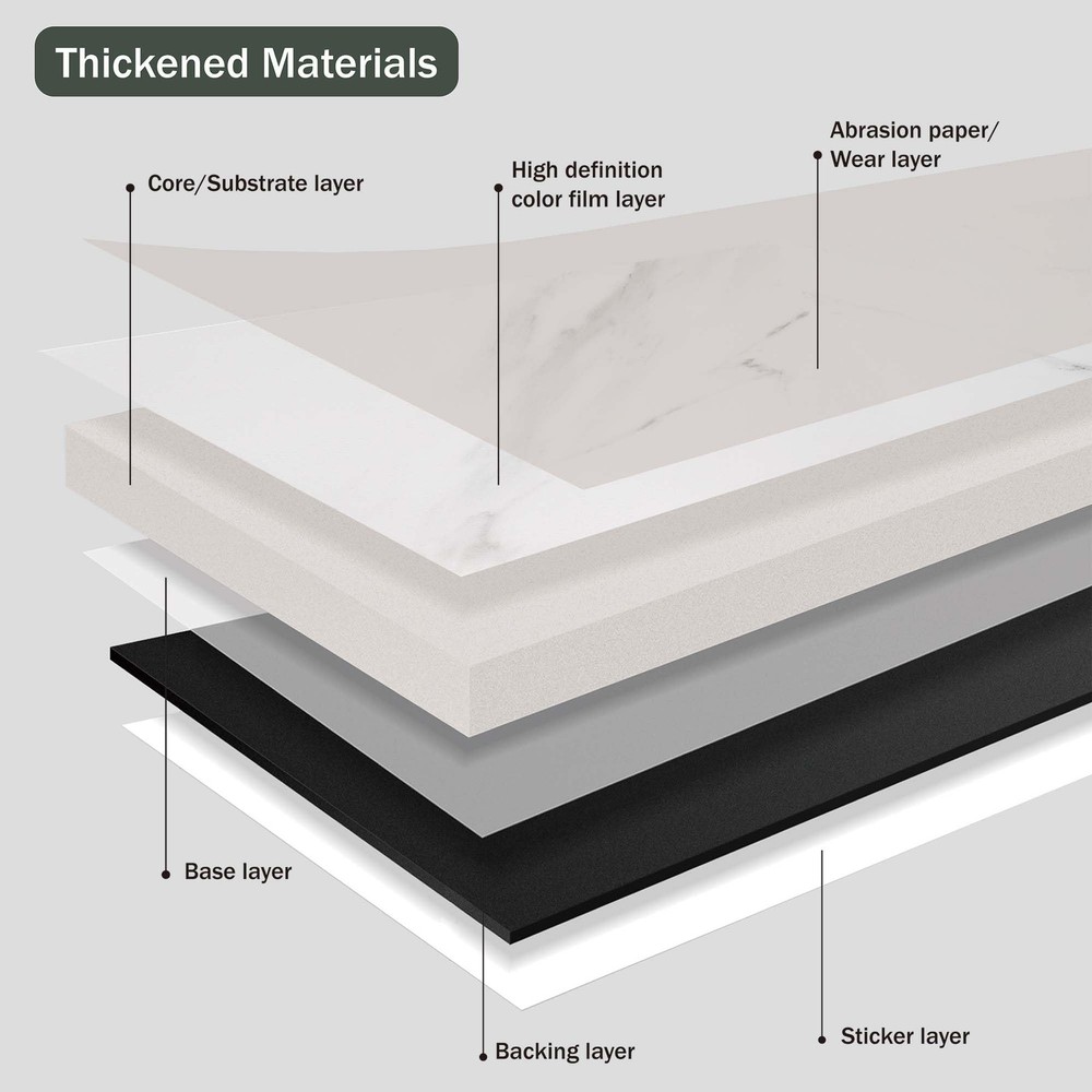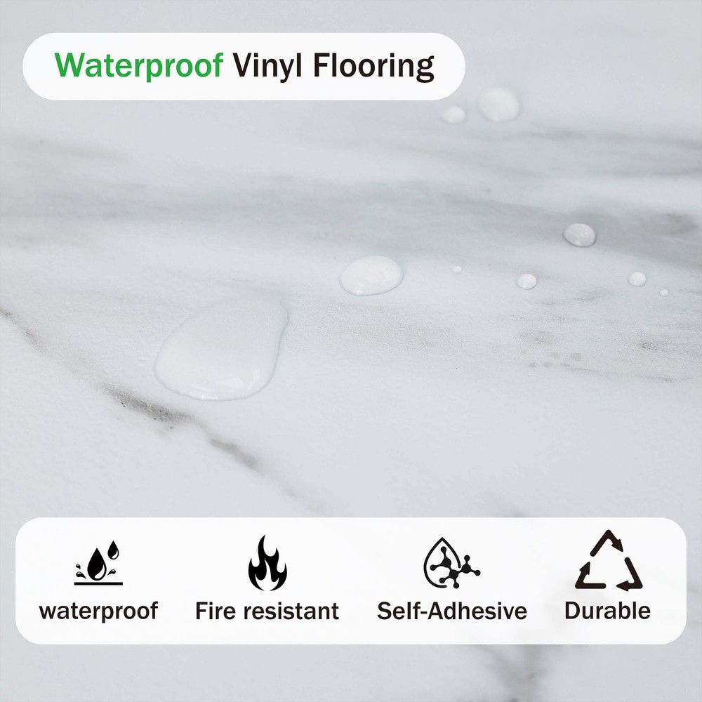 peel and stick marble floor tile 12" W x 12" L x 0.05" T36-Pack DIY waterproof vinyl flooring for Bedroom, Kitchen, Living Room,White Marble,36 Sq.Ft 【About color】: White Marble,There may be color differences when displaying this product on different computers and mobile phones. To save you time, it is recommended to order one item for first order to confirmation the color. 【Excellent Quality】:Peel and Stick Vinyl Flooring Tiles are high-quality, the wear, scratch, and abrasion-resistant properties ensure longevity, while the high strength guarantees no expansion and stability. 【Dimensions】: Each peel and stick floor tile measures 12 x 12 inches and 1.3mm thick. Therre are 36 tiles per box, which will cover 36 square feet. 【Easy Diy】: Vinyl flooring is peel and stick, very easy to install. No additional adhesives or complicated tools are needed, just peel off the backing and stick it to a clean and dry surface, saving your time and energy. 【Multi-Functional】: These self-adhesive peel & stick tiles are ideal for bathrooms, kitchens, dining rooms, and bedrooms, adding warmth and character to any space. And the peel-and-stick floor tile is an excellent choice for both renters and homeowners. 【About 】's product line, especially vinyl flooring products, stands out in the market with its diversity, technological innovation, and environmental characteristics. The realistic wood grain texture, waterproof design, easy installation, and diverse aesthetic choices of the product meet the needs of modern consumers.