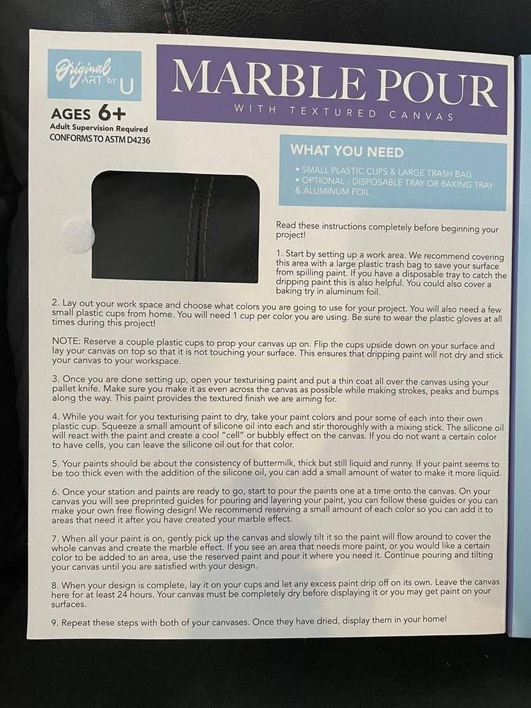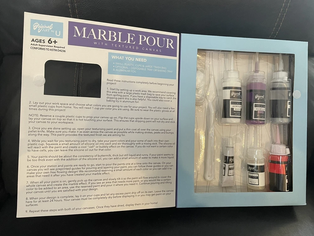 Marble Pour Abstract With Textured 2 Canvases Wall Original Art By U Painting Kit Ages 6+ Adult Supervision Required CREATE BEAUTIFUL WORKS OF ART! TEXTURE! POUR! DISPLAY! PLEASE VISIT OUR EBAY STORE FOR MORE GREAT ITEMS & GREAT PRICES: http://stores.ebay.com/Tyger16 PAYMENT INSTRUCTIONS: The following payment methods, which are offered at eBay checkout, are allowed: PayPal PayPal Credit Credit card or debit card Apple Pay Google Pay SHIPPING INFORMATION: Items are usually shipped the same day if payment is received by 1:00 PM (Monday through Friday) EST . All Shipping is done through USPS with tracking. CONTACT US: Please email us if you have any questions... YES, WE SHIP INTERNATIONALLY. FEEDBACK: When you receive your item(s), please leave us a positive feedback and we will do the same for you.