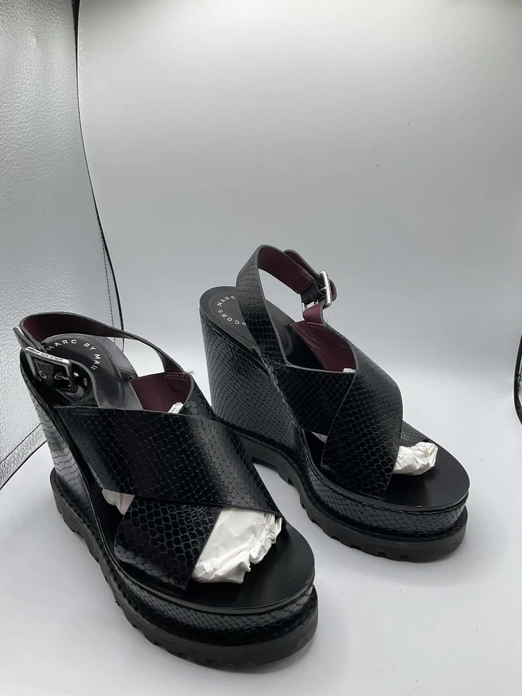 Elevate your shoe game with these stylish Marc By Marc Jacobs black patent leather wedges. With a snake look pattern and scalloped accents, these shoes are perfect for any occasion - from casual outings to cocktail parties. The adjustable ankle strap and buckle closure ensure a secure fit, while the 5 inch wedge heel provides a comfortable and trendy lift. These shoes are a must-have for any fashion-forward woman, and they come in a size 8. Made in Italy with high-quality materials, these shoes are built to last. Add a touch of designer flair to your wardrobe with these cute and stylish wedges.