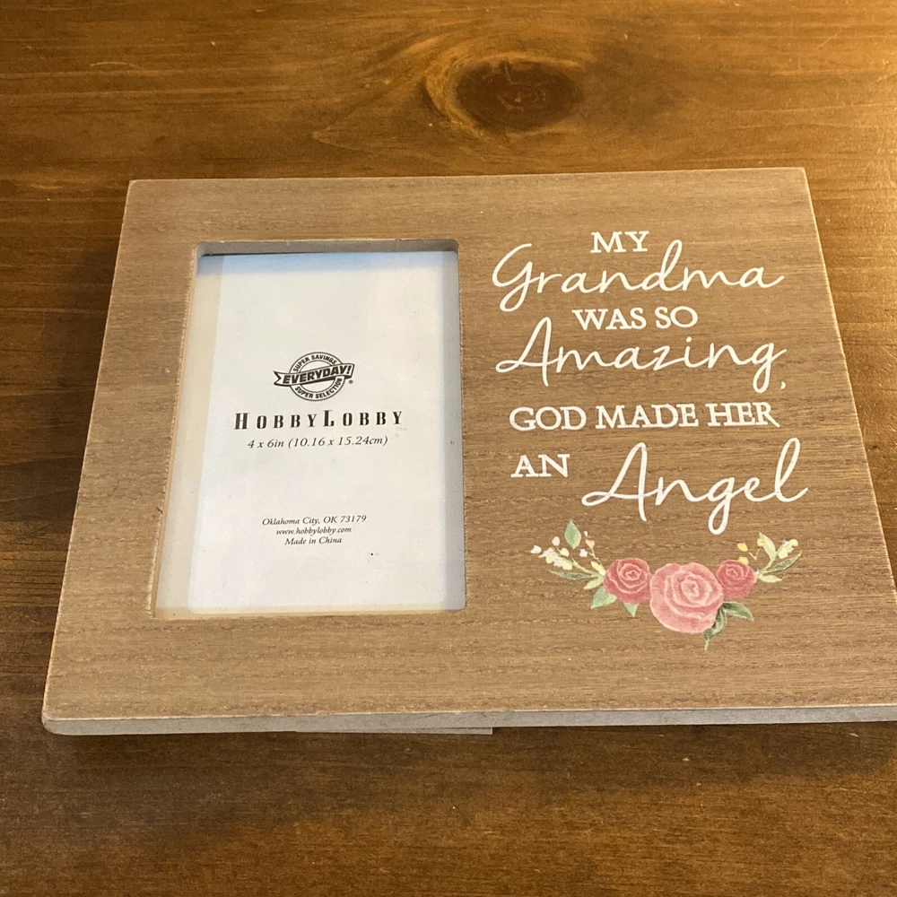 The Hobby Lobby home decor frame features a design that pays tribute to a beloved grandmother with the phrase "Grandma Was Amazing." The frame is a crisp white color, adding a touch of elegance to any home decor. Perfect for displaying cherished memories and honoring the special bond with a grandmother.