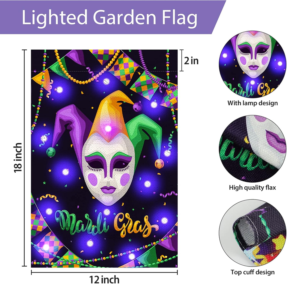 Menu Other Items Feedbacks About Us Contact Us Add To Favorites Mardi Gras Lighted Garden Flag 12X18 Double Sided Harlequin Mask Garden Flag Vertical Carnival Garden Flags for Mardi Gras Yard Outdoor Decoration Mardi Gras Lights Design: Our Mardi Gras garden banner is carefully designed by our designers, using classic elements of Mardi Gras. During the day, this Christmas outdoor garden banner will add eye-catching color to your outdoor patio decor. At night, this garden banner will emit lights to better create a festive atmosphere that complements your home garden. In addition, we have a variety of garden flags for you to choose from Quality Material: Our Mardi Gras Lighted Garden Flag is made of 100% durable burlap with double stitching all around for durability. The garden flag measures 12x18 inches and is suitable for decorating your home garden, flagpole not included Double Sided Printing: This Carnival Garden Flag Is Colorfast, Double Sided Design, Double Sided Printed Image, Visible On Both Sides, You Can Also Read The Text Correctly From Both Sides, So You Can Use It Again And Again Delightful Surprise: Our vertical holiday decoration yard banner consists of masquerade images and warm text, which are traditional elements of Mardi Gras, and can be a surprise for family and friends who love Mardi Gras decorations Great Decoration: This double-sided masquerade garden flag helps to create a joyful and warm holiday atmosphere, just hang it on your deck, patio, porch, backyard, lawn, garden or other places, it is also a good decoration for carnival parties, carnivals and more Features: Delightful Surprise: Our vertical holiday decoration yard banner consists of masquerade images and warm text, which are traditional elements of Mardi Gras, and can be a surprise for family and friends who love Mardi Gras decorations Great Decoration: This double-sided masquerade garden flag helps to create a joyful and warm holiday atmosphere, just hang it on your deck, patio, porch, backyard, lawn, garden or other places, it is also a good decoration for carnival parties, carnivals and more Specifications: Material: Sackcloth Size:16x12inch Theme:Mardi Gras Notes: Manual measurement, please allow slight errors on size. The color may exist a slight difference due to different screen displays. Item Specification Item model number -8 Color Style 2 Country of Origin China Item Weight 2.08 ounces Theme Christmas Recommended Uses For Product Outdoor Package Dimensions 11.89 x 9.06 x 0.75 inches Shipping FREE FREE SHIPPING We are always working hard to ensure your package arrives as soon as possible. Please understand that some factors like weather, high postal traffic, and the performance of shipping companies are outside of our control. We offer free shipping to the lower 48 states. We do not accept P.O. Boxes. Please provide a physical address. If you have a problem or question regarding your transaction please contact us immediately. We will work with you to resolve any problem you may have. Thank you