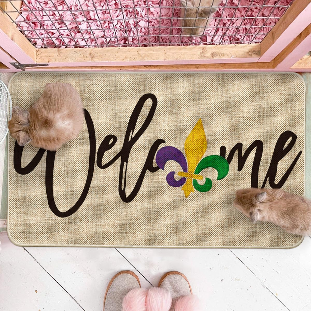 This Mardi Gras doormat is a festive and fun way to welcome guests! The colorful irises and carnival design add a cheerful pop to any entryway, and the low-profile rug stays firmly in place with its non-slip backing. Perfect for indoor or outdoor use, it’s durable, easy to clean, and just the right size. Love how it brightens up my porch—great quality and fast shipping too!