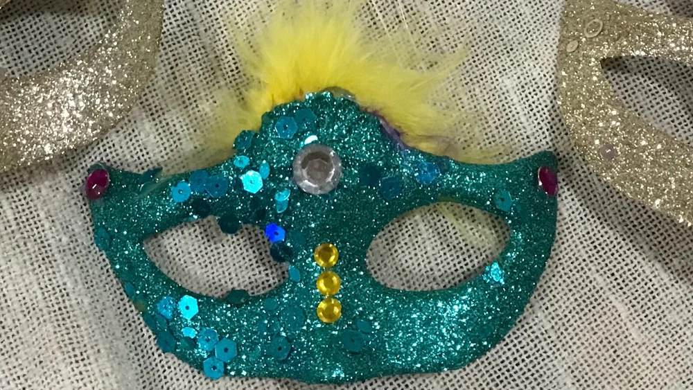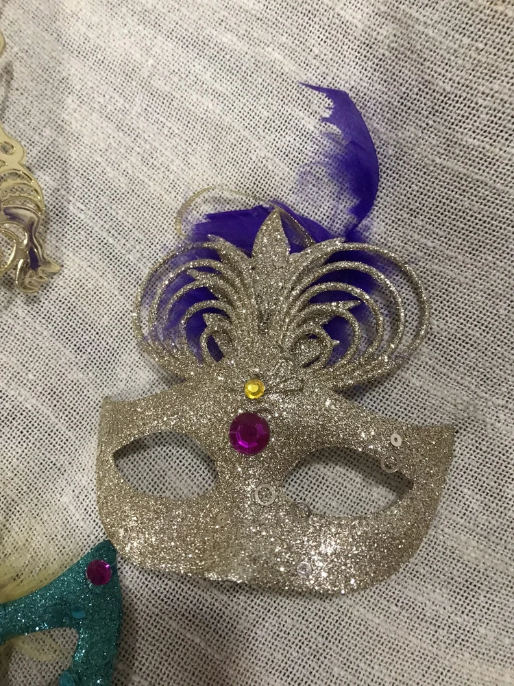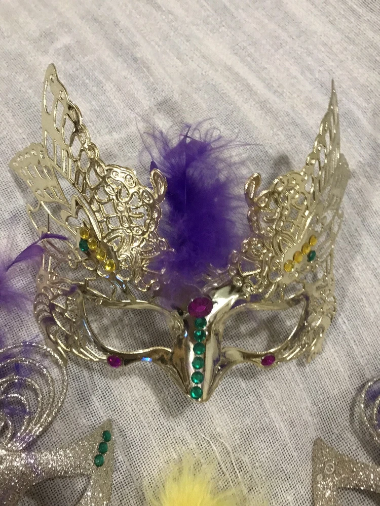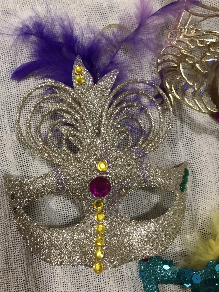 Get ready for Mardi Gras with this beautiful decoration set! The set includes a handcrafted mask and beads in vibrant colors, perfect for adding a festive touch to your home or costume. Whether you're celebrating the holiday with friends or attending a parade, this set is a must-have for any Mardi Gras enthusiast. The mask and beads are intricately designed with attention to detail, making them a true work of art. Add them to your collection of holiday decor or give them as a gift to a fellow Mardi Gras lover. With their stunning design and high-quality materials, they are sure to bring a touch of elegance to any occasion. Hand decorated masks.
