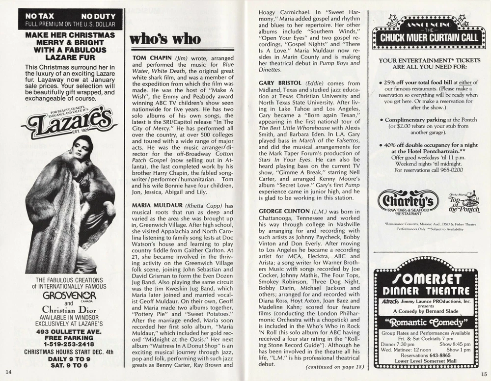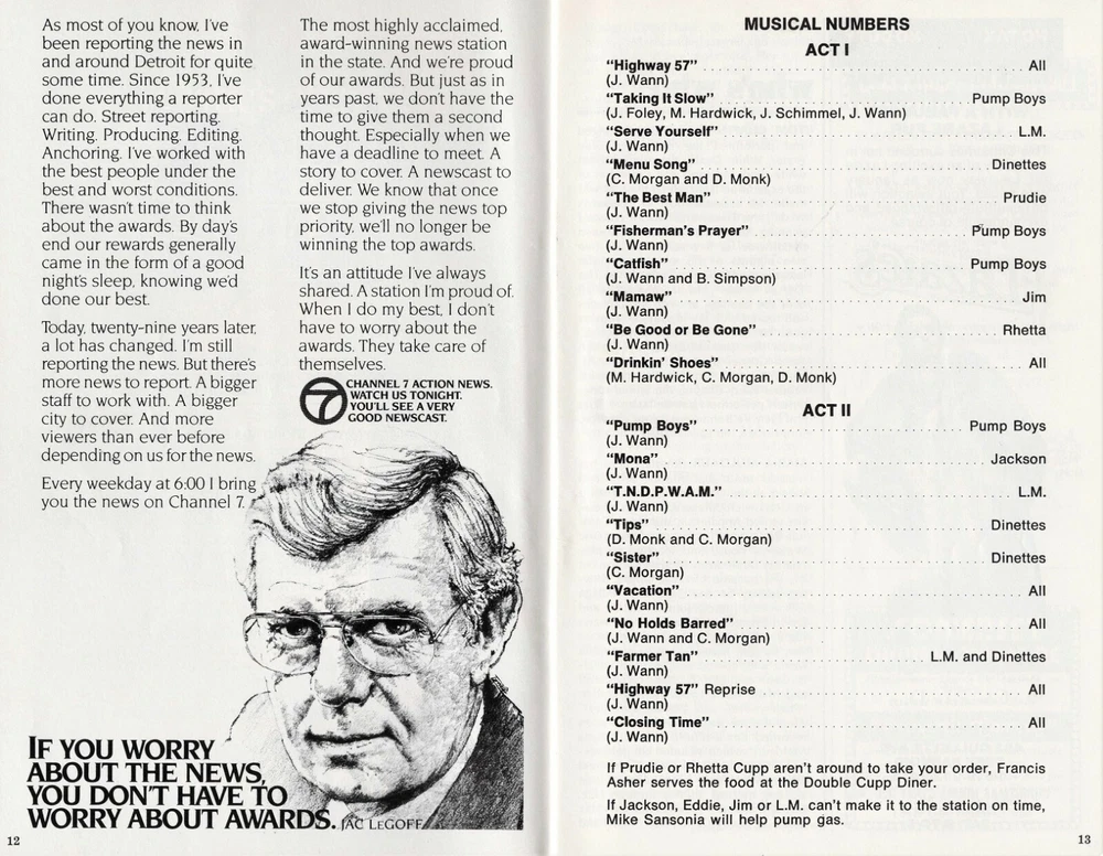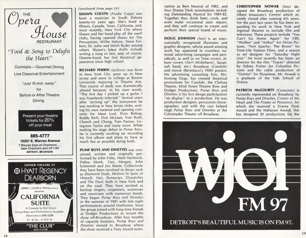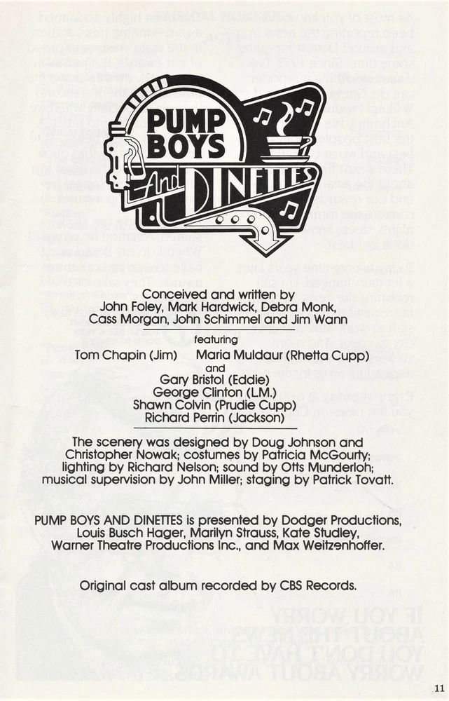 This is a rare October 29th, 1982 "Stage" playbill from the National Tour engagement of the musical comedy "PUMP BOYS and DINETTES" at the Fisher Theatre in Detroit, Michigan. ( The Original Broadway production opened February 4th, 1982 at New York's Princess Theatre and closed June 18th, 1983 after 573 performances. The Detroit engagement opened October 29th, 1982 and played five weeks, closing December 2nd, 1982. ) ..... The ensemble cast included TIM CHAPIN, MARIA MULDAUR, GARY BRISTOL, GEORGE CLINTON, SHAWN COLVIN and RICHARD PERRIN ..... CREDITS: Book, Music and Lyrics by JOHN FOLEY, MARK HARDWICK, DEBRA MONK, CASS MORGAN, JOHN SCHIMMEL and JIM WANN; Sets designed by DOUG JOHNSON and CHRISTOPHER SHRIVER; Costumes designed by PATRICIA McGOURTY; Conceived by JOHN FOLEY, MARK HARDWICK, DEBRA MONK, CASS MORGAN, JOHN SCHIMMEL and JIM WANN ; Directed by PATRICK TOVATT; Produced by DODGER PRODUCTIONS, LOUIS BUSCH HAGER, MARILYN STRAUSS, KATE STUDLEY, WARNER THEATRE PRODUCTIONS INC. and MAX WEITZENHOFFER ..... DETAILS: The 32 page playbill measures 5 1/2" X 8 1/2" inches and includes full production credits, cast list, musical numbers and bios of each of the actors and members of the creative team as well as five production photos ..... CONDITION: With the exception of a clipped corner to the cover and slight surface rubbing, this rare playbill is in excellent condition and will make a wonderful addition to the collection of any musical theatre aficionado or historian. This item will be carefully packaged in a protective, carded sleeve and backed by stiff cardboard.