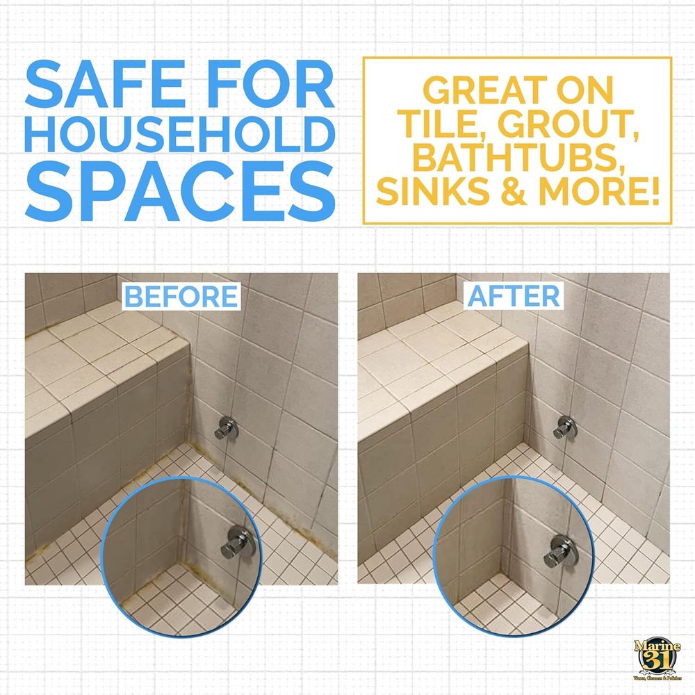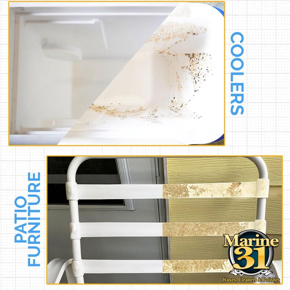Marine 31 Mildew Stain Remover & Cleaner - Marine & Boat, Home & Patio, Bathroom & Shower Cleaner (128oz (Gallon)) Product Details Manufacturer: Marine 31 Brand: Marine 31 Model: Marine 31 Mildew Stain Remover Item Weight: 8 pounds Package Dimensions: 13.86 x 11.93 x 5.63 inches Item model number: M31-372 Manufacturer Part Number: M31-372 Special Features: Concentrated Brand: Marine 31 Item Form: Spray Scent: Unscented Specific Uses For Product: Sink, Tile, Deck, Shower, Bathtub Material Feature: Unscented EASY TO USE: Simply spray the product directly onto the surface and allow to sit for 1 to 3 minutes. Agitate the surface with a brush or terry cloth towel and then thoroughly rinse and dry the surface. MULTIPLE USES: Safe for Boats, Vinyl, Tile, Grout, Patio, Coolers, and just about anywhere else that may accumulate stains. Marine 31 Mildew Stain Remover works like no other! SAFE: Erase these unwanted stains without the risk of discoloring, dulling or drying out vinyl seats or other fabrics. Even the most severe stains are no match for the cleaning power of Marine 31 Mildew Stain Remover. FAST WORKING: Marine 31 Mildew Stain Remover will quickly erase stains from marine surfaces including vinyl seat cushions, rubber fenders, fiberglass, gel coat, canopies & more without the need of abrasive power washing and/or scrubbing.