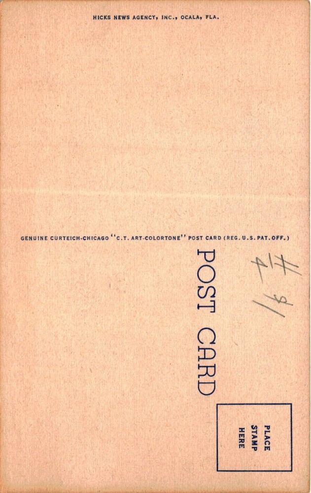 The front of the postcard features a picture of the Marion County Courthouse in Ocala, Florida. Ocala is known as In the Kingdom of the Sun. The postcard is a genuine Curteich-Chicago C.T. Art-Colortone postcard, produced by Hicks News Agency, Inc. in Ocala, Florida.