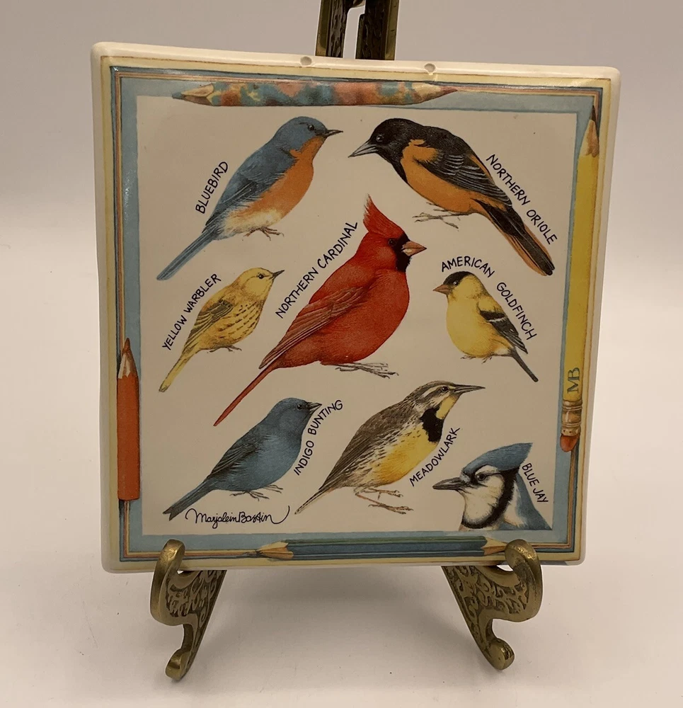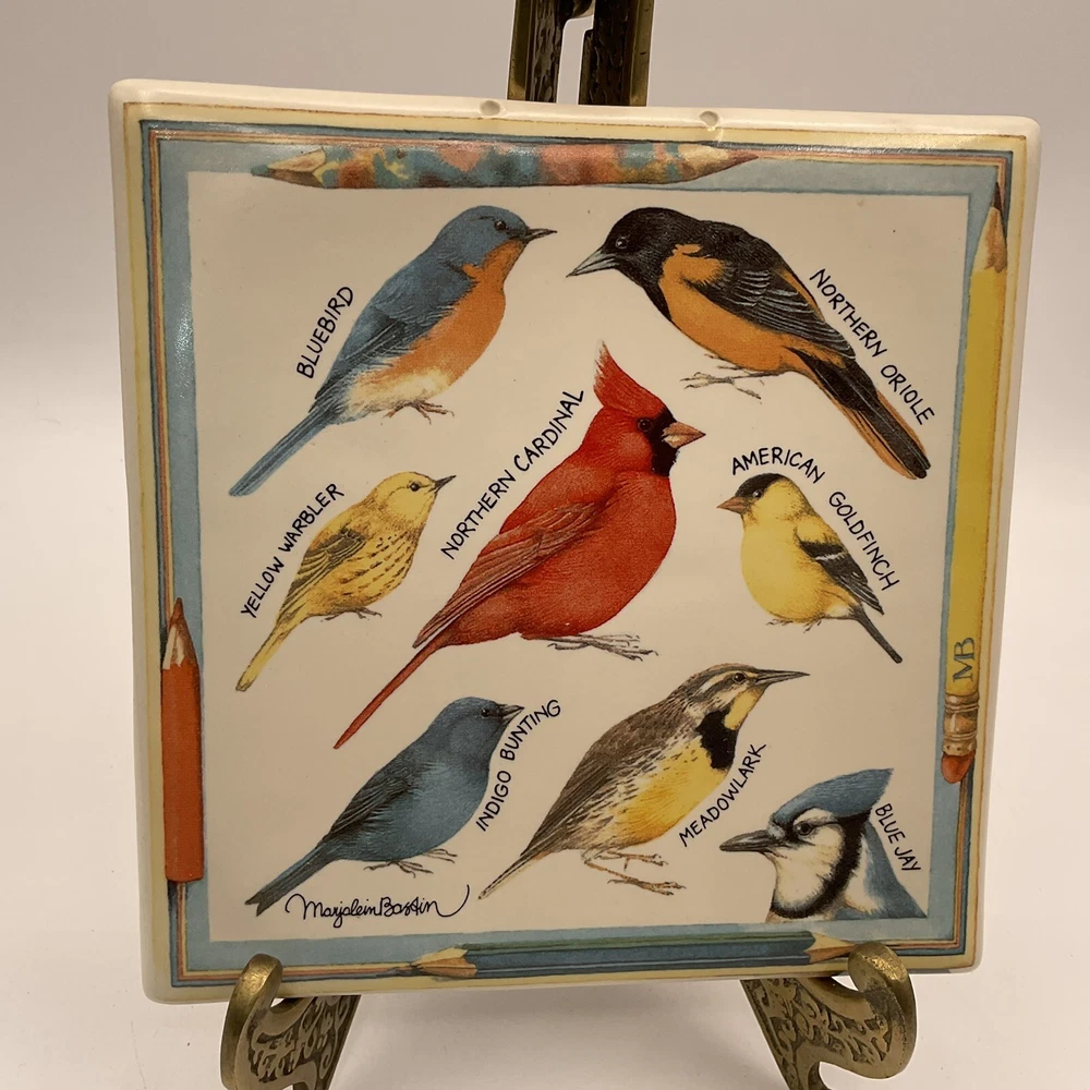 The Marjolein Bastin Hallmark Tile features artwork of North American Birds by the renowned artist. This ceramic square tile measures 6 inches in length and width, making it suitable for use as both a wall decoration and a trivet. The multicolor design showcases 7 different bird species in an American style, adding a touch of nature-inspired beauty to any space. Perfect for collectors and bird enthusiasts alike, this piece is a charming addition to any home decor. No chips. See pictures as part of description.