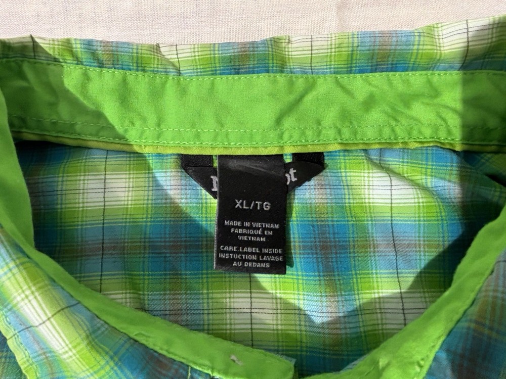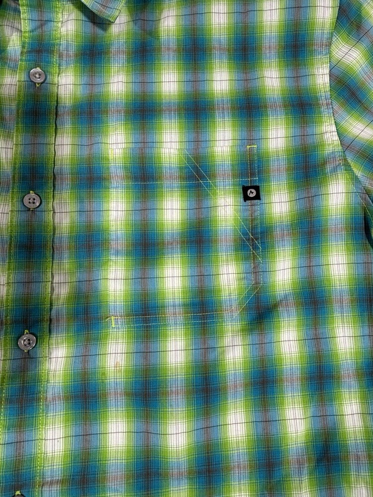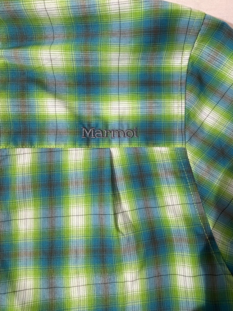 The Marmot Men's Plaid Short Sleeve Camp Shirt in size Extra Large is a perfect choice for outdoor activities like hiking. Made of lightweight polyester material, this button-up shirt features a collared neckline and a regular fit. The multicolor plaid pattern adds a stylish touch to this casual shirt, ideal for wearing during the summer, fall, and spring seasons. Easy to care for with machine washable instructions, this shirt from the reputable brand Marmot offers comfort and functionality for any casual occasion.