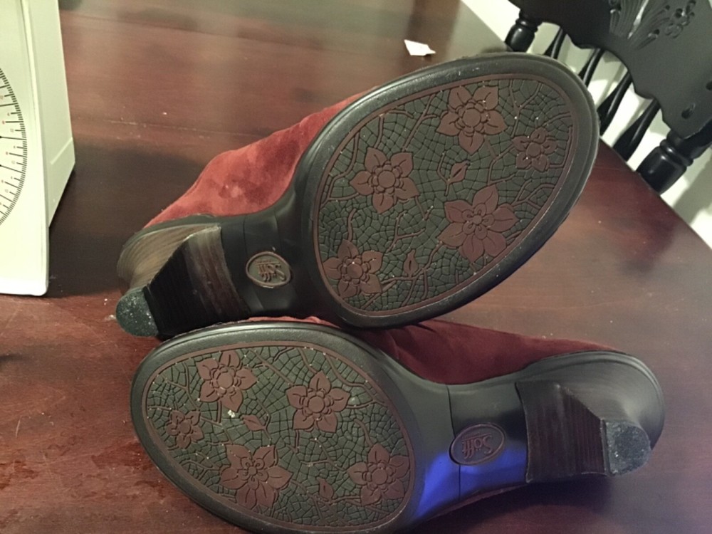 Step into effortless style with these maroon suede leather mule heels, perfect for adding a touch of elegance to any outfit. The slip-on design offers convenience while the embroidered accents provide a distinctive flair, making these shoes a versatile addition to your wardrobe. Crafted with comfort in mind, they feature a supportive wedge heel and are lined, insole, and outsole with premium leather. Available in size 8m, these shoes are a blend of contemporary design and timeless appeal, suitable for various occasions, from office wear to casual outings.