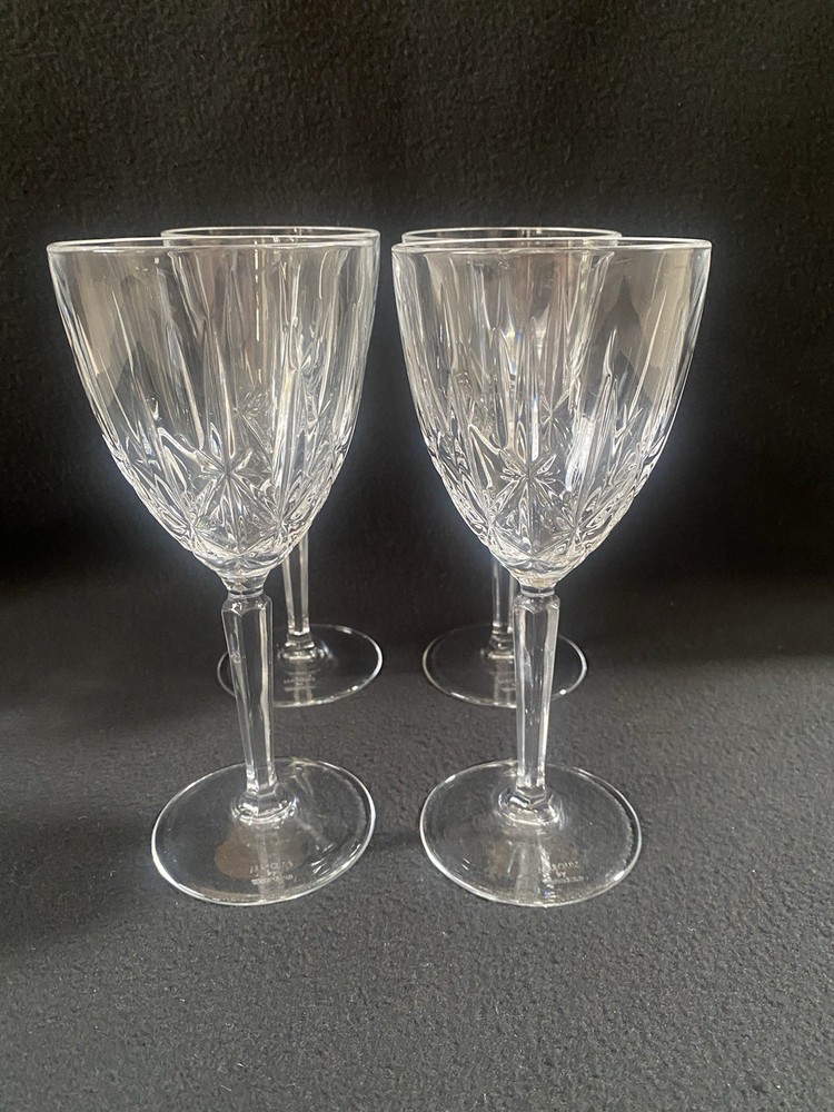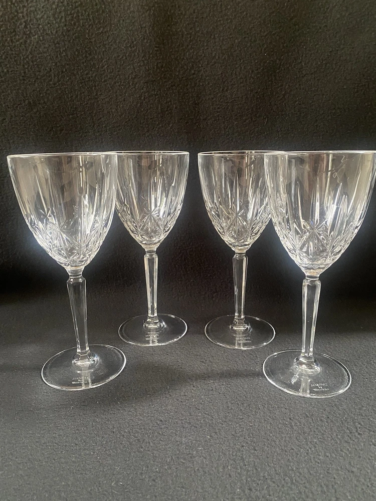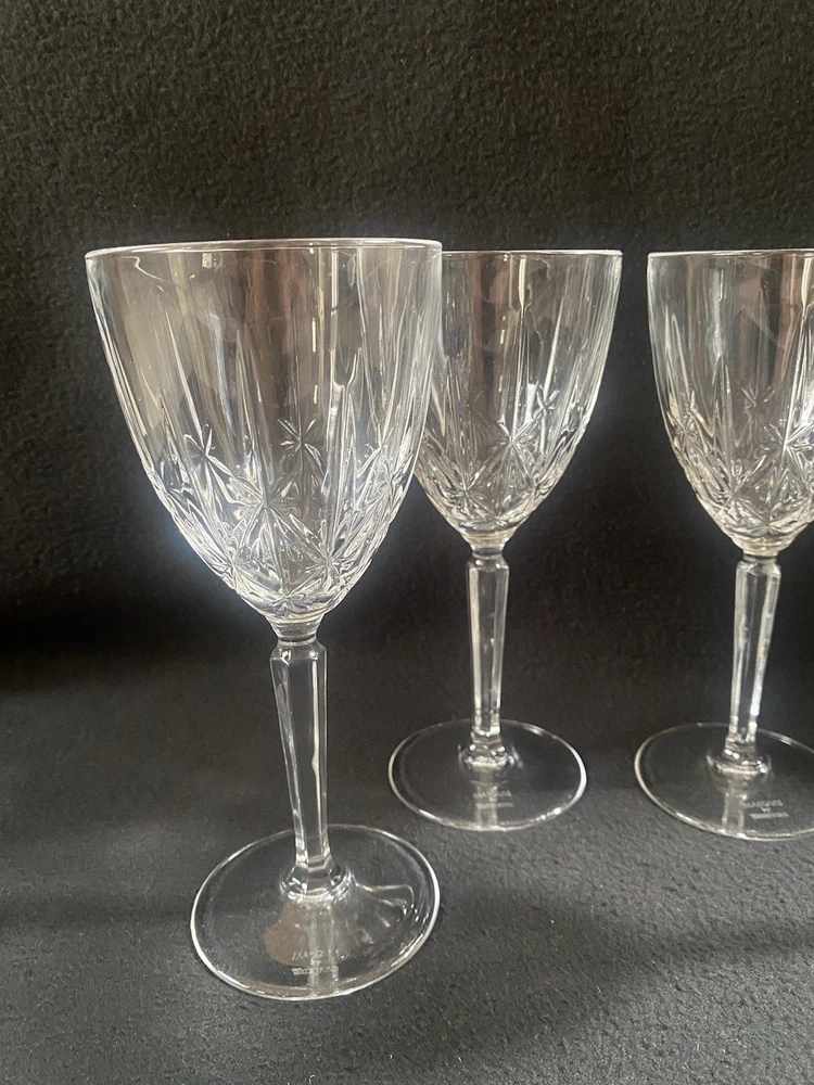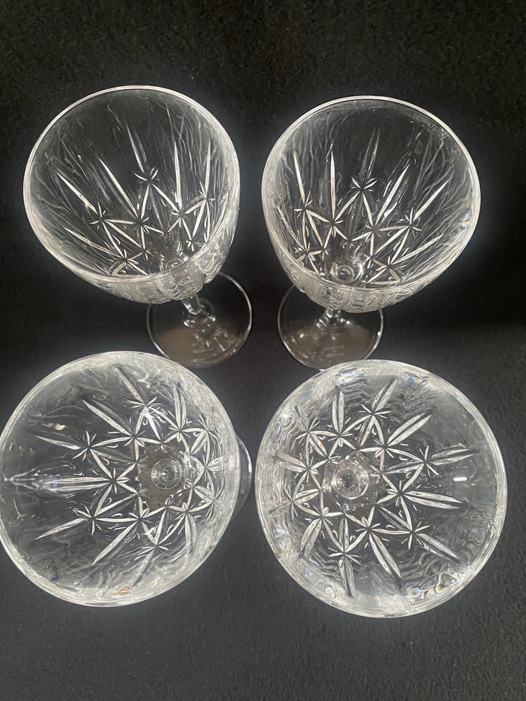Elevate your drinking experience with these exquisite Marquis by Waterford crystal wine goblets. The set of four round goblets are hand blown in Italy and feature a stunning sparkle pattern, adding a touch of elegance to any occasion. Each goblet stands at 8 inches tall and is signed by the renowned Marquis by Waterford brand. Crafted with the finest materials and production techniques, these goblets are a must-have for any mid-century modern enthusiast. They are perfect for all occasions, whether it be a romantic dinner or a festive party. With an etched backstamp and original design, these goblets are a unique addition to any drinkware collection.