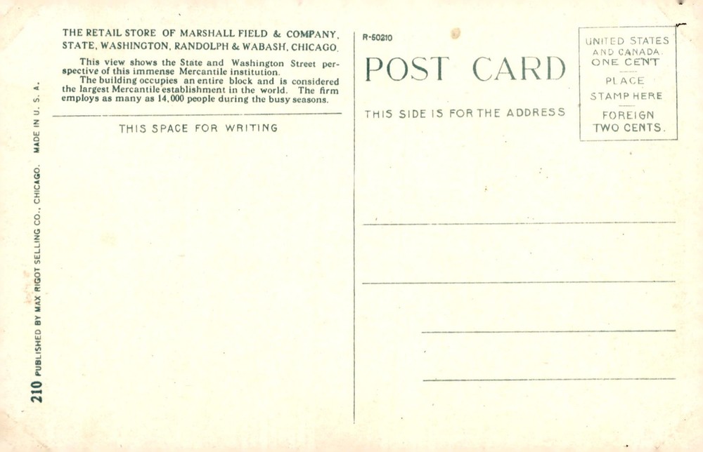 The postcard showcases Marshall Field & Co.'s massive retail store at State, Washington, Randolph & Wabash in Chicago, known as the world's largest mercantile establishment employing up to 14,000 people.