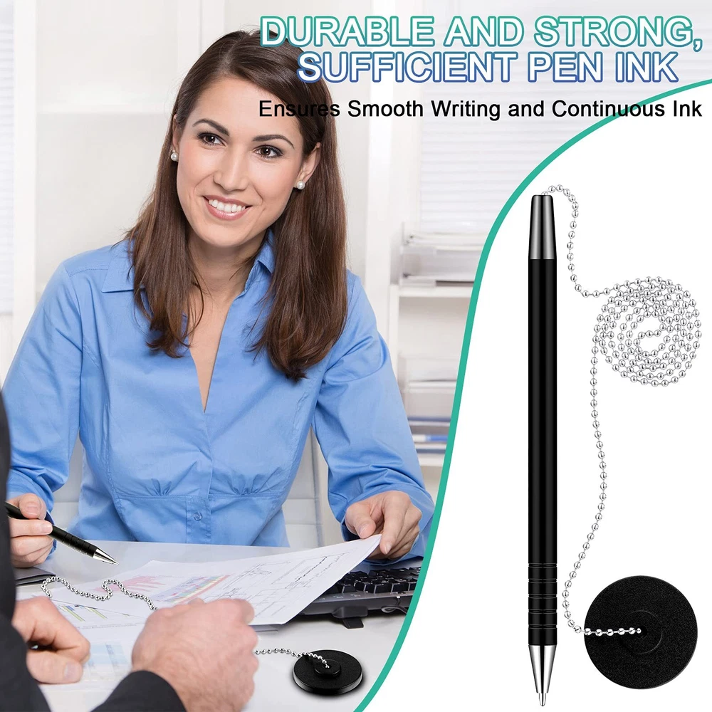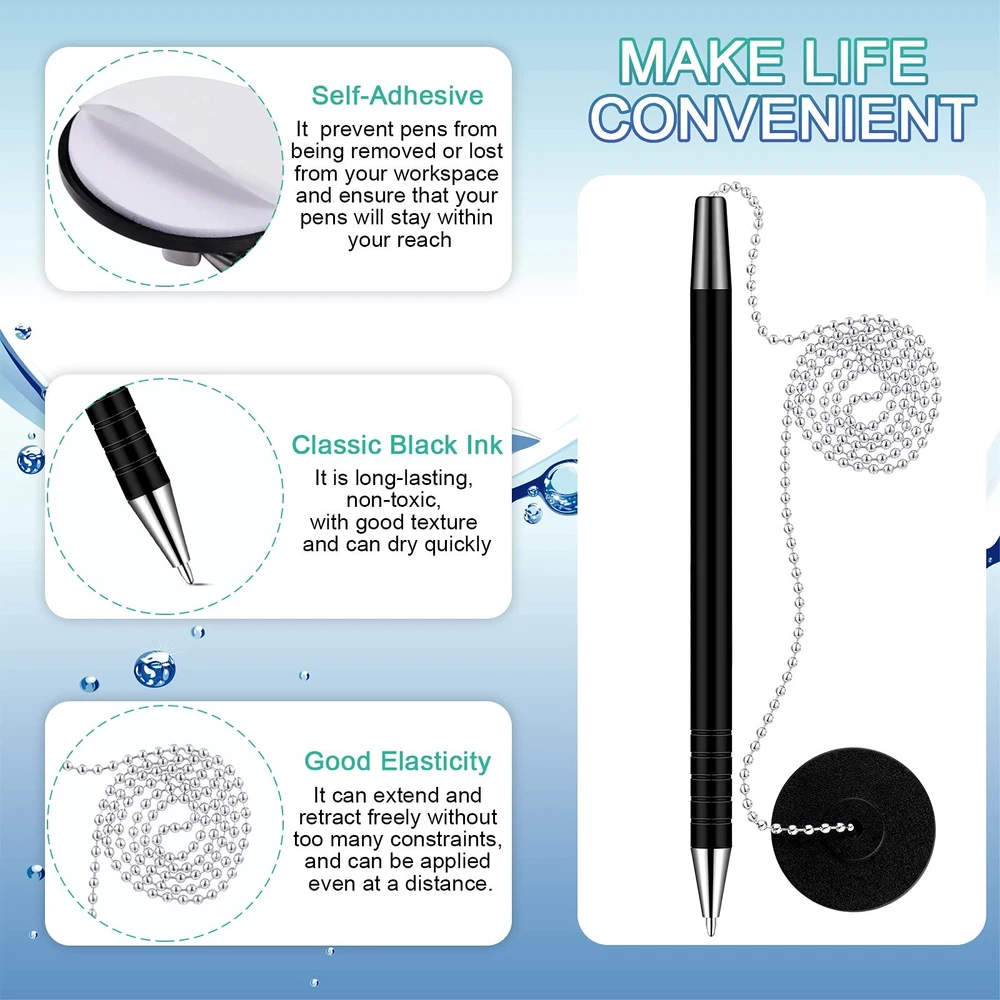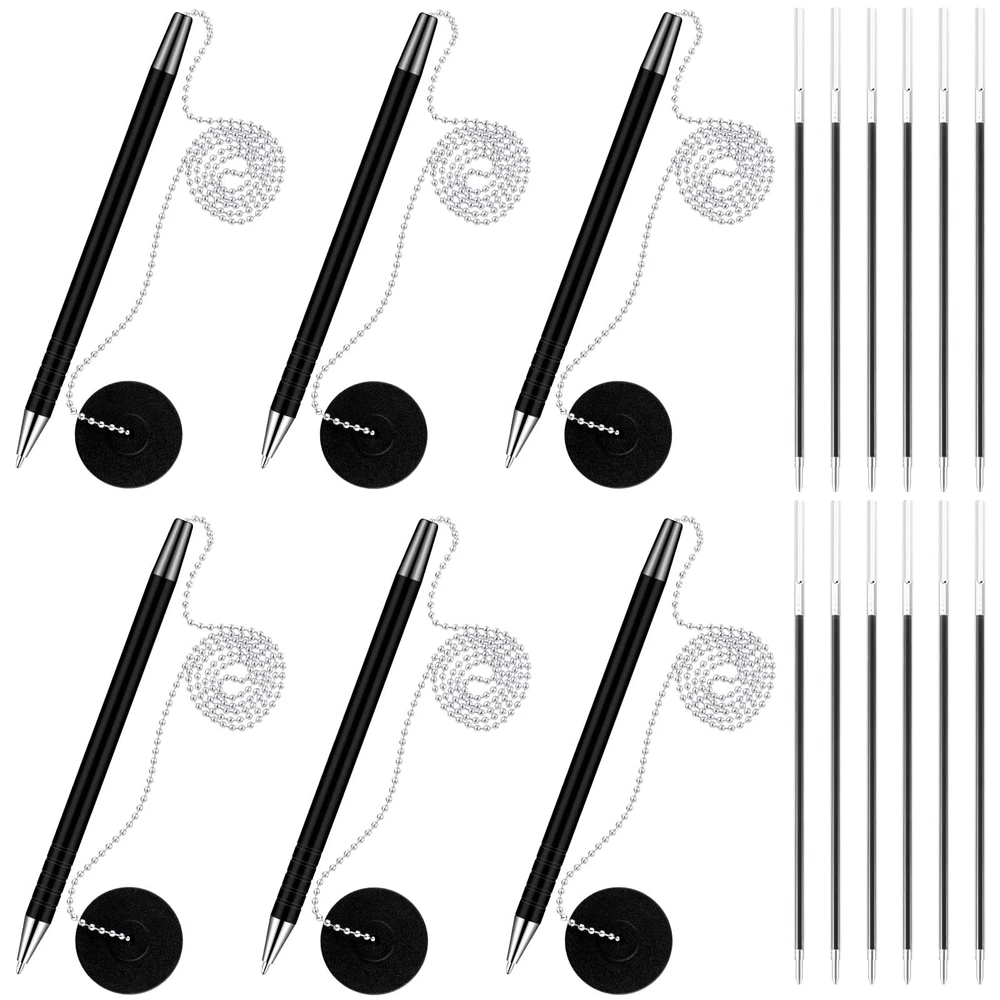 Features: Classic black ink can be applied to writing most documents with long-lasting, safe and reliable, with good texture, the ink able to dry quickly, and you'll love to hold the pens as they touch comfortably in your hand. These security pens are easy to refill with black ink when the ink runs out, and the pens come with reliable, quality black ink that dries quickly. You and people around you can use these pens at ease. Specifications: Material: metal Color: black Sizes: Secure pen: 5.8 inches in length Refill: 5.3 inches in length Pen safety chain: 23 inches in length Package includes: 6 x Secure pens 12 x Pen refills Notes: Manual measurement, please allow slight errors in size. The color may exist slight difference due to different screen displays. Complete set: the package comes with 6 pieces of secure pens with pen chains and security pen holders, also includes 12 pieces blank ink refills, a chain and a pen holder for each pen, a total of 18 pieces; The quantity is enough and convenient for your daily study or work needs Quick to dry black ink: the classic black ink of these pens with chains is long-lasting, safe for human body, with nice texture and can dry quickly, so you can use them to writ most documents, such as composition, notes, diaries, etc.; In addition, these black safety pens are comfortable to hold and write, making you fall in love with writing Make the work go smoothly: the secure pens with chains can stay fixed and standing, just reach out your hand and quickly pick it to use at anytime and and anywhere, making your workday smoother; It may be a little inconvenience but losing your pen several times a day may to a bad mood; These security pens will make the day run smoothly Chain size: the pen safety chain can extend to 23 inches, long enough to fit on most desk tops; The round black pen holders can stick firmly to smooth surfaces and won't come off easily, so you can use them with confidence Wide applications: the counter pens with chains are suitable for office, study, reception desk, hospital, school, bank or other occasions of daily use, etc.; Thanks to the strong adhesive holders, these pens will stick to the counters and will not move; These pens can be shared with everyone, but they will stay with you forever
