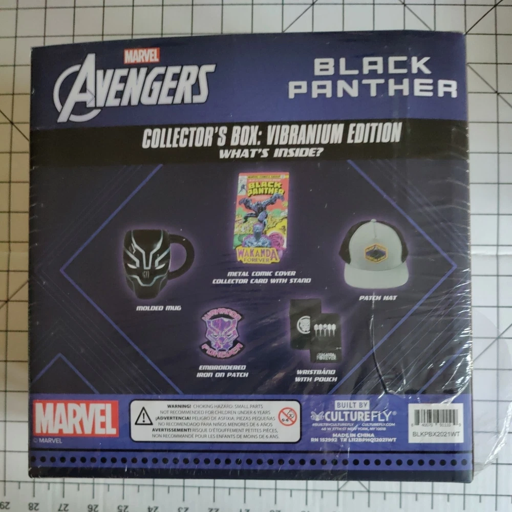 This limited edition Marvel Avengers Black Panther Collector's Box is a must-have for any fan of the franchise. The Vibranium Edition includes 5 items that are perfect for display or use. The box features the iconic character Black Panther and is branded with the Culture Fly logo. The box is made in China and includes items that are not signed. It is a great addition to any collection of collectibles, comic books, or merchandise. Get your hands on this amazing piece of Marvel Avengers memorabilia today!