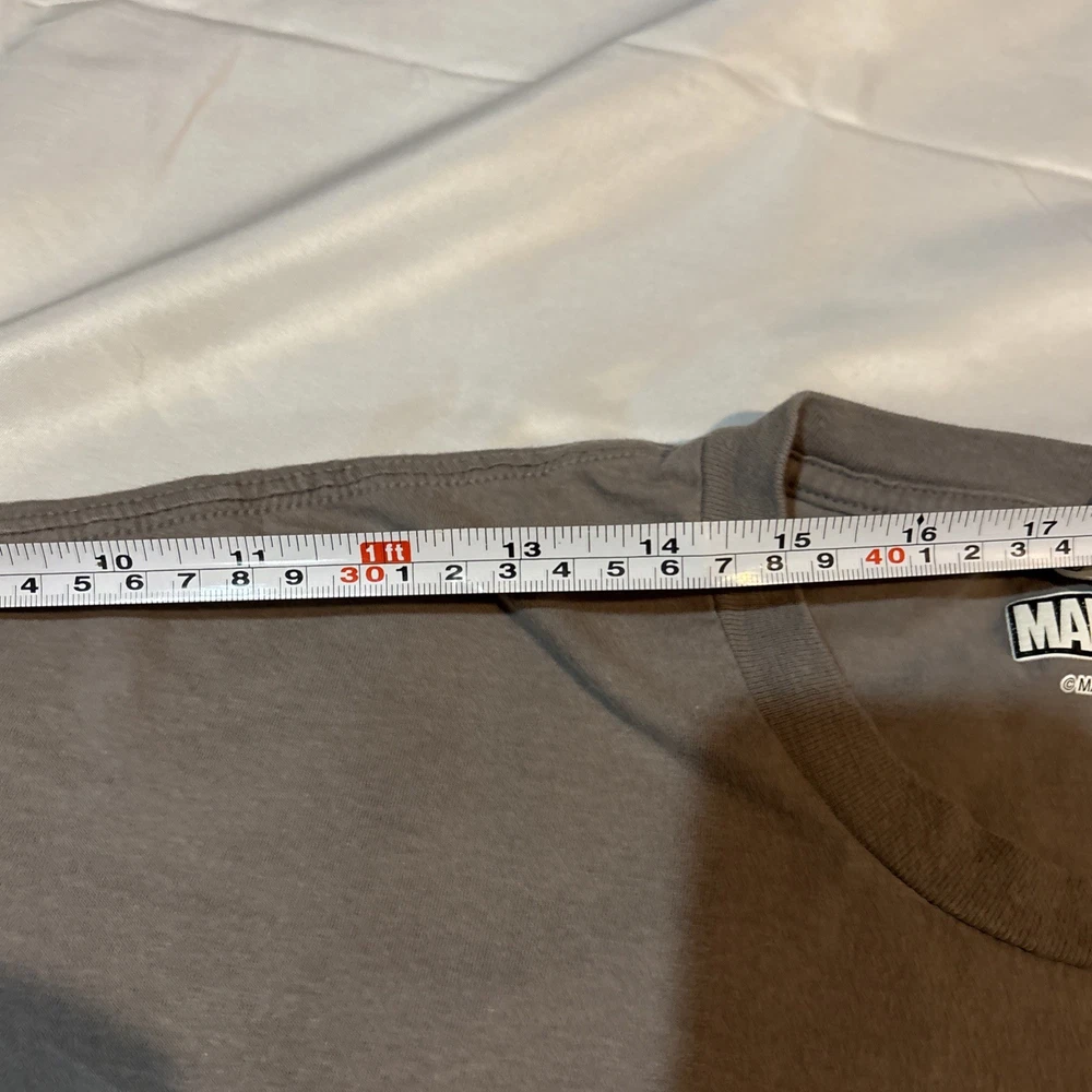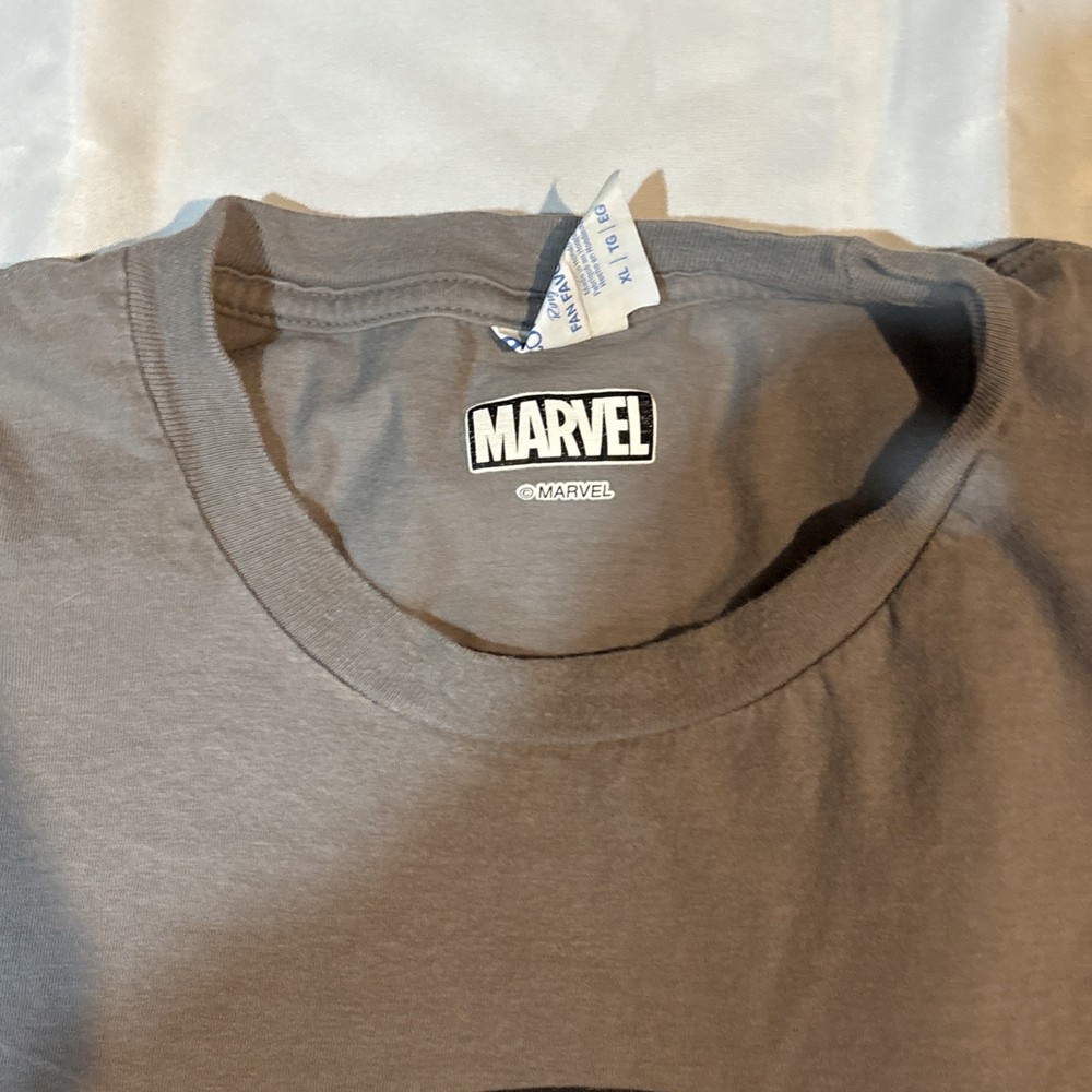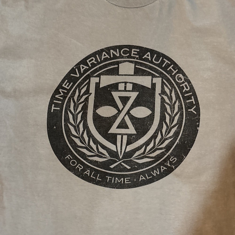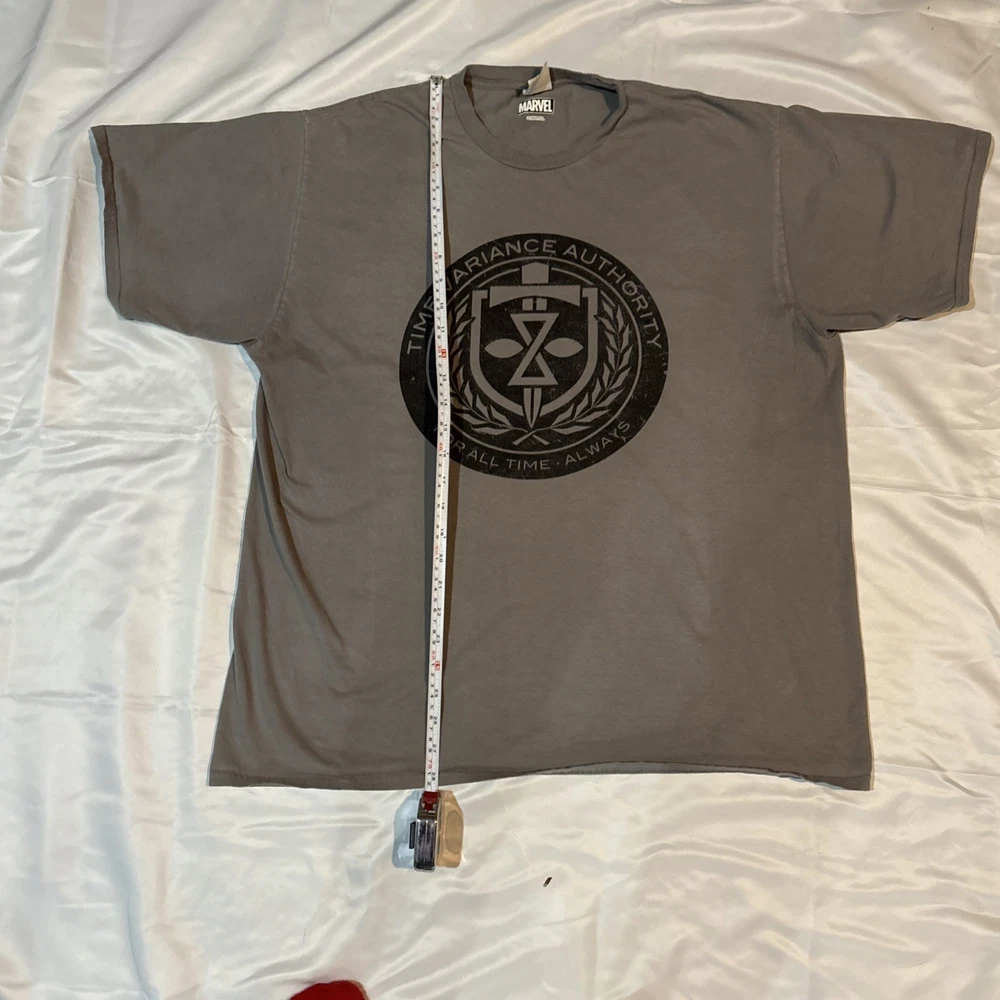 This Marvel Loki Time Variance Authority Logo T-Shirt in XL is a pre-owned, very good condition gray shirt featuring a solid pattern with a short sleeve crew neck design. Made of cotton knit fabric, this regular fit shirt showcases the iconic Loki character from the Marvel Universe. Ideal for any season, this heavyweight shirt with logo accents is a must-have for fans of Loki and Marvel. Perfect for those who appreciate easy care and comfortable wear, this shirt is great for showing off your love for the Time Travel theme in style.