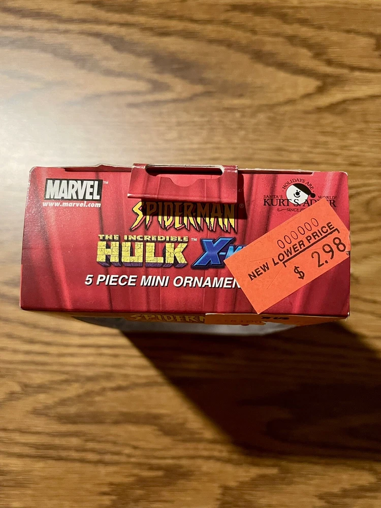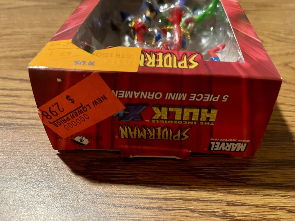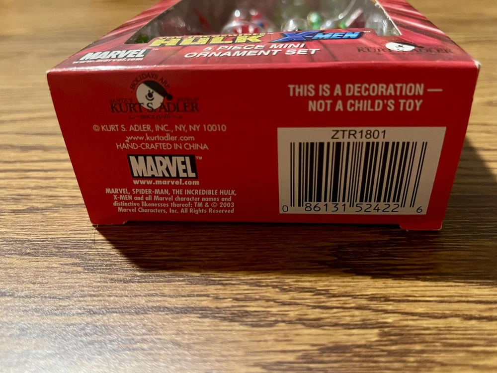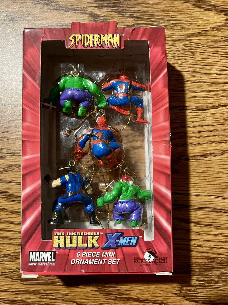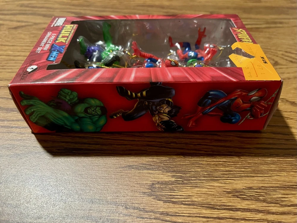Add some superhero flair to your holiday decor with this 5-piece mini ornament set featuring Marvel's Spiderman, The Incredible Hulk, and X-men. The ornaments are vintage and were manufactured in 2003. The set is used, vintage and comes in its original box. The multicolor ornaments are perfect for any occasion, especially Christmas. The set is a must-have for any Marvel collector and is sure to impress.