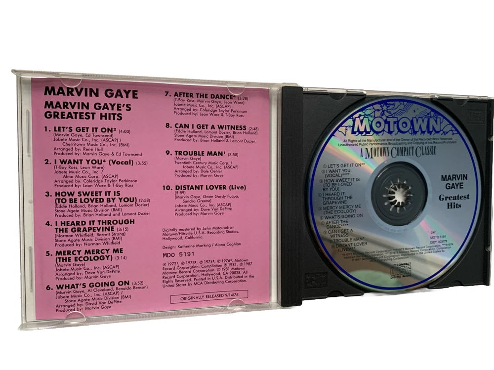 Marvin Gaye - Greatest Hits (CD, 1987, A Motown Compact Classic) For fans of classic R&B and soul music, this CD is a must-have. Featuring the greatest hits of Marvin Gaye, this album showcases the talent and artistry of this Motown legend. With songs like "What's Going On" and "Let's Get It On," listeners will be transported back to the 1970s when Gaye ruled the airwaves. The CD itself is in excellent condition (rated as "EX"), and comes in a standard jewel case with very good (VG) case condition and excellent (EX) inlay condition. This 1987 release is a Motown Compact Classic edition. Don't miss your chance to own this piece of music history.