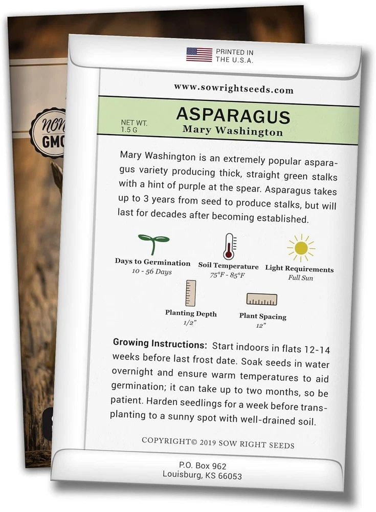 Mary Washington Asparagus Seed for Planting - Non-GMO Heirloom Packet with Instructions to Plant an Outdoor Home Vegetable Garden - Classic Perennial Stalks with Hearty Flavor 1 Beautiful - Large premium seed packet of Mary Washington Asparagus (Asparagus officinalis) seeds. An extremely popular asparagus variety producing thick, straight green stalks with a hint of purple at the spear. Minimum of G per packet (about 80 seeds). Productive - Asparagus germinates in 10-56 days when soil temps are 75-85°F. Plant 1/2” deep and space 4-6” apart in an area with full sun. This variety will grow 3-4’ tall with a spread of 30”. Asparagus is slow to mature and you will get a good harvest in 2-3 s. Plant in USDA zones 4-9. Perennial Crop - Asparagus is a perennial crop that will feed your family for s to come. Make tasty roasted asparagus, or try grilling your harvest with some parmesan cheese. This vegetable is even super tasty when eaten fresh and is packed with nutrients! Easy To Grow - Instructions included on each packet. Plus, we are available to answer all your questions. If these seeds don’t germinate, we will happily make it right for you. Safe and Sustainable - Our operation is fully solar powered, and has taken the Safe Seed Pledge to sell only fresh Non-GMO heirloom seeds for you and your family.