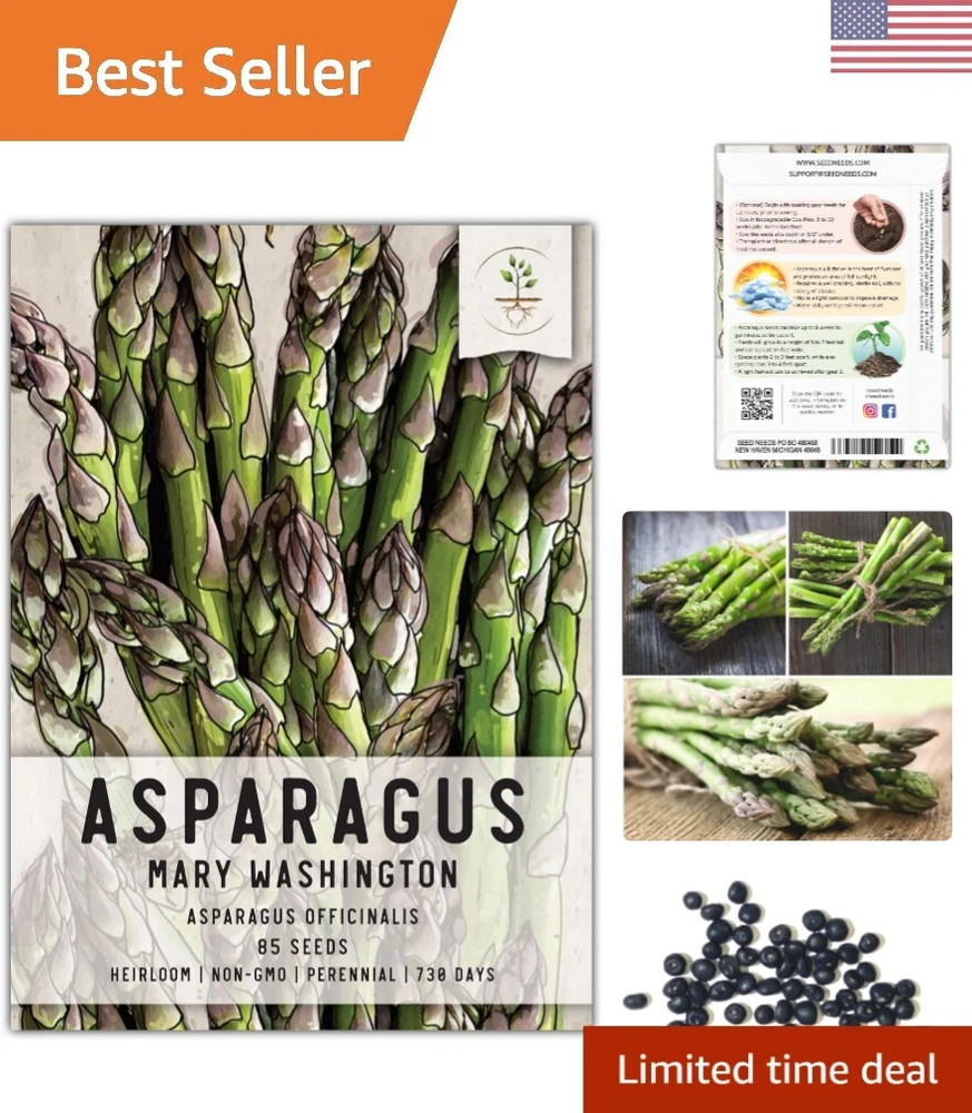 Mary Washington Asparagus Seeds - 85 Heirloom Seeds for Planting Asparagus officinalis - Perennial Crops for an Outdoor Garden, Non-GMO & Untreated 1 Pack QUALITY - All seeds packaged by are intended for the current and the following growing seasons. All seeds are stored in a temperature controlled facility that is free of significant amounts of moisture. QUANTITY - Seed packets by offer generous quantities. You can share with friends and family, or save your extra seeds until the next season, if properly stored. PACKETS - Each packet displays a beautiful illustration of the variety to be grown, as well as detailed seed sowing information on the reverse side as well. Measures ” wide by ” tall. PROMISE - will never knowingly supply GMO based seed products. The vast majority of our seeds are open pollinated & heirloom, with the exception of a few hybrids. GERMINATION - packets contain some of the freshest seed available. Direct from the growers. If sown correctly, you will begin seeing results in only a matter of days. PACKAGING - All seeds are packed in tear resistant and moisture resistant packaging. Keeping them fresh longer than the competition.
