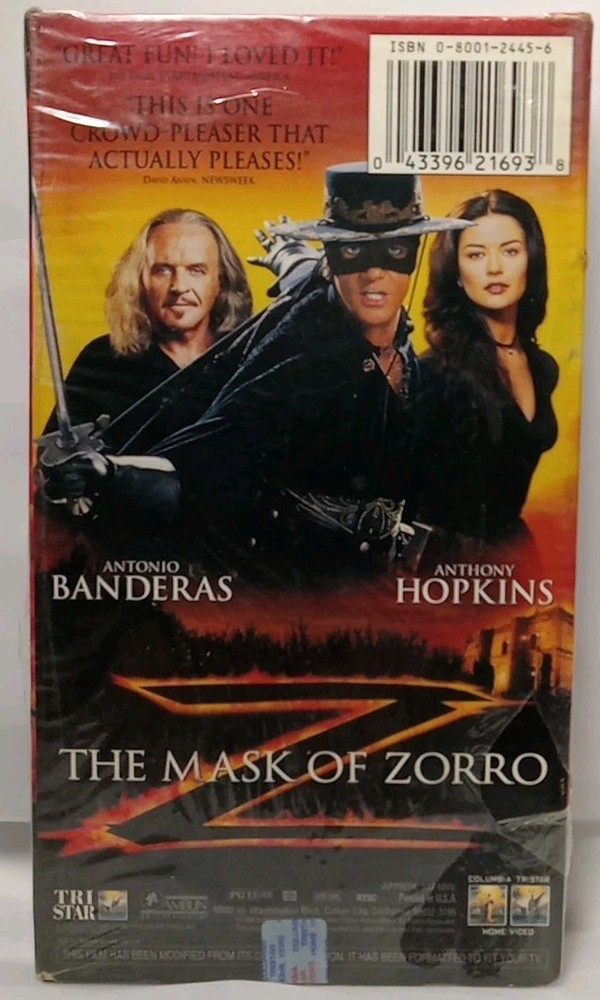 The "Mask of Zorro" VHS tape from 1998 is sealed, making it a collector's item for fans of action and adventure movies. This PG-13 rated film, produced by Sony Pictures, tells the story of the iconic character Zorro in a thrilling and entertaining way. Perfect for those who enjoy classic tales of daring escapades and swashbuckling heroes, this VHS tape offers a nostalgic viewing experience for fans of the genre.