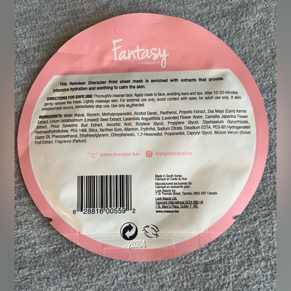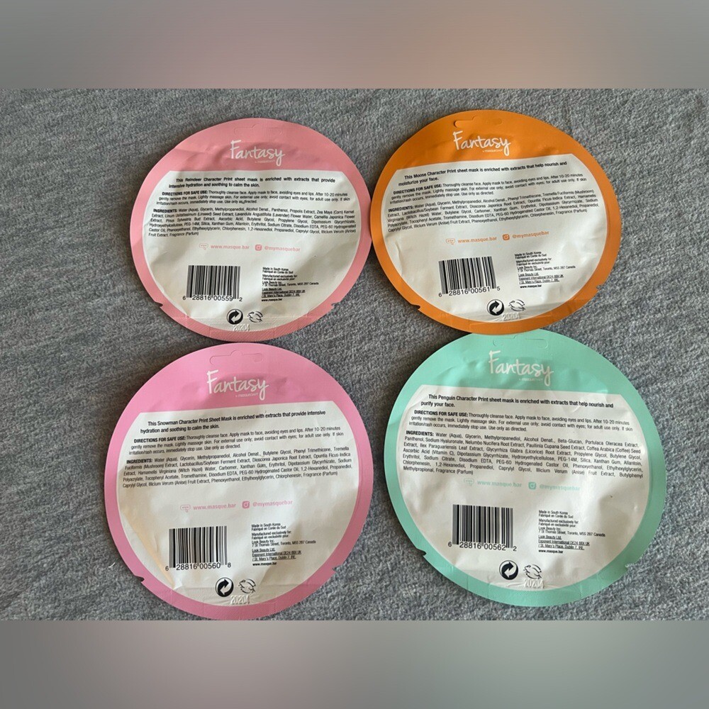 Fantasy by Masque Bar Set of 4 Sheet Face Masks Skincare DIY Feminine New Set of four Fantasy by Masque Bar themed sheet masks. Includes Reindeer, Moose, Snowman, and Penguin designs. Perfect for a fun DIY at home skincare routine. -Reindeer- calming - Propolis/Lavender extract -Snowman -hydrating-witch hazel water /anise fruit extract -Moose-moisturizing-mushroom extract and which hazel water -penguin-purifying-coffee seed and licorice extract Condition- new in packaging Size-one size fits most See photos for additional information My items are primarily thrifted and I do my very best to note any imperfections/callouts. Wash to wear - use measurements provided and match to clothes you currently own to determine best size match Ships Next Day Monday - Friday My items are stored in a pet/smoke free home Thanks for stopping in and looking! Lisa