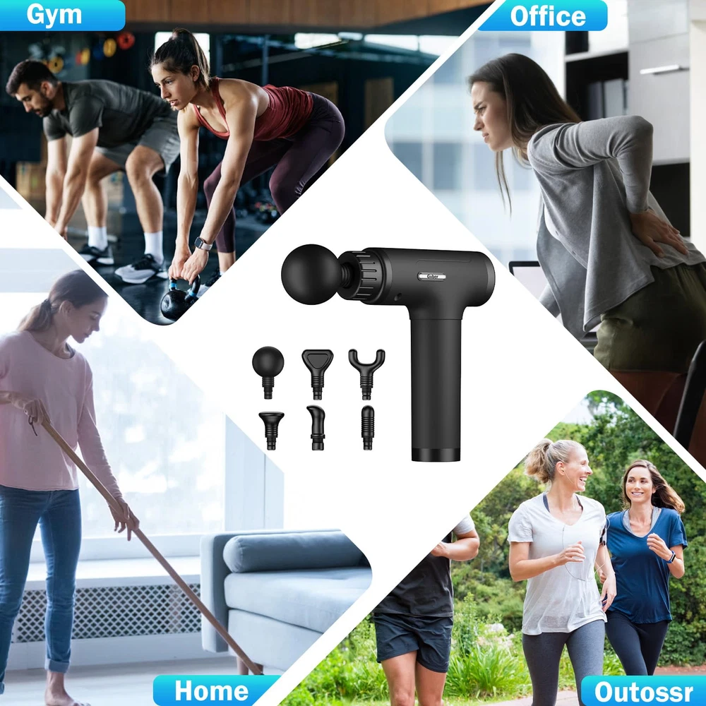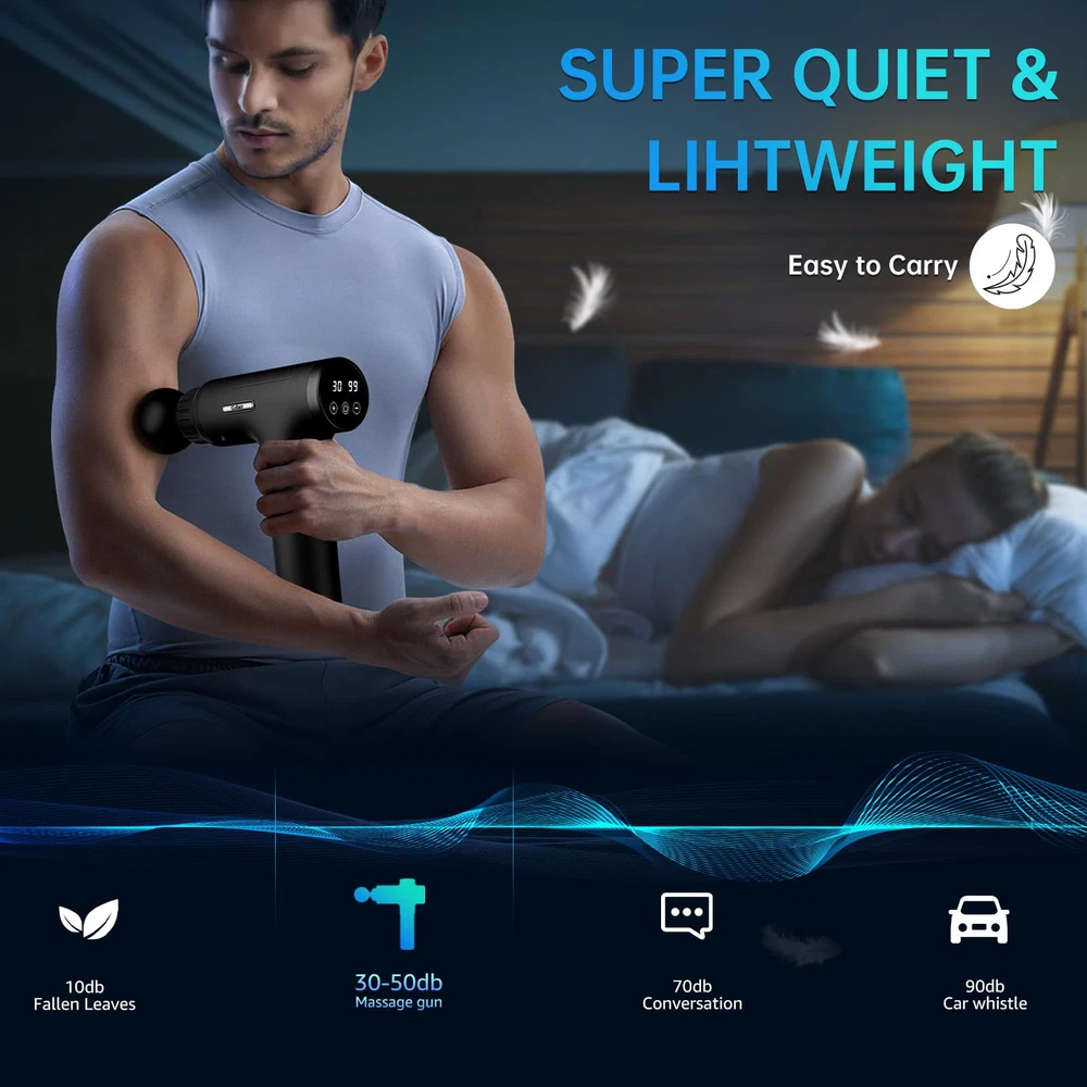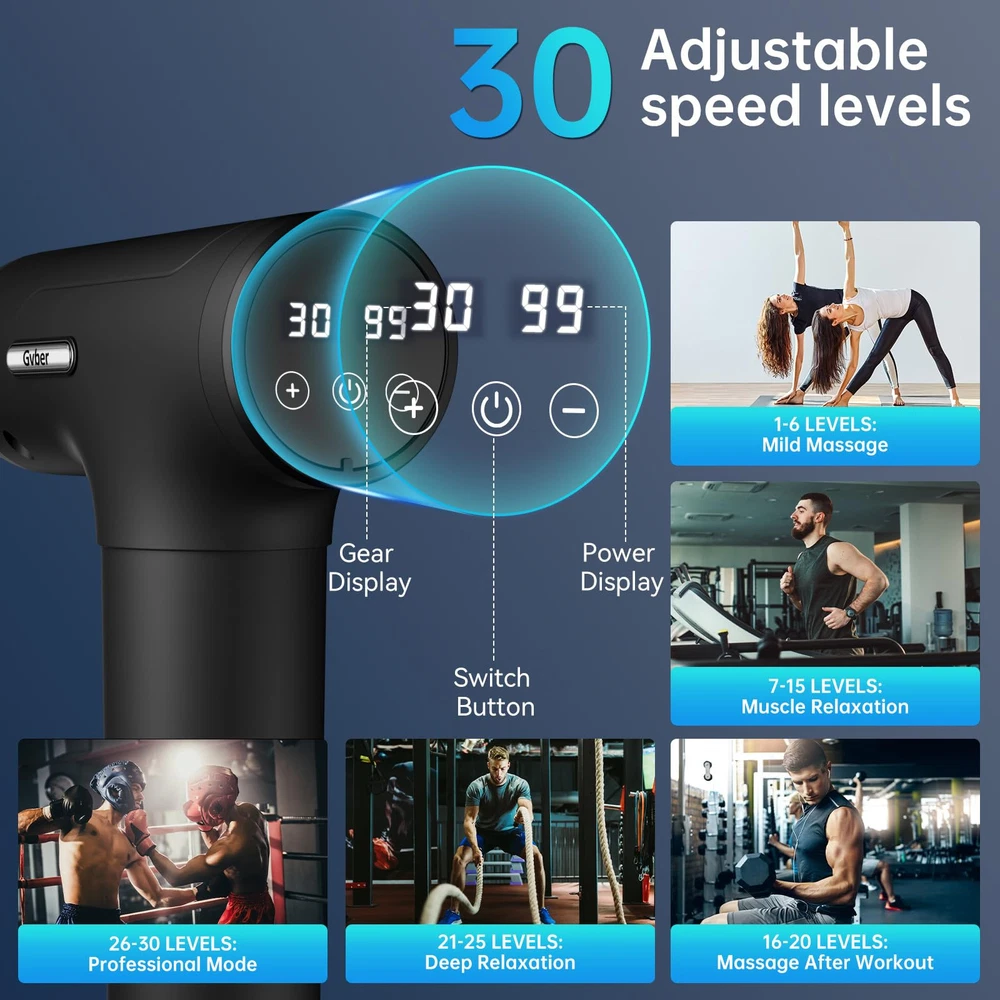9 Massage Heads: This massage gun features 6 interchangeable massage heads (D-shaped, bullet, flat, thumb, U-shaped) designed to target different muscle groups and provide customized relief through percussion massage technology Relieve Soreness & Back Pain and Stress: 30-speed levels, you can easily customize the intensity of your massage, ranging from gentle awakening of muscles to a deep, professional-like massage. Including options for deep tissue. Ideal for use in your legs, arms, back, torso and neck shoulder Features: Built with high-quality materials for durability, this massage gun features a smart LED display showing speed and battery levels, along with a simple on/off button operation Powerful Yet Quiet: Featuring a lightweight and ergonomic design, this massage gun is an ideal travel companion, allowing you to take it with you to the gym, office, or on vacation. It works silently so you can use it without disturbing others Extended Battery Life: Constructed with high-quality materials, Mini Massage Gun is built to last. With rechargeable battery & smart LED display: Powered by a rechargeable battery. The built-in display shows off speed and battery percentage, so you always know when to charge.(Note: The on button is on the LED screen, press and hold for 2 seconds to switch on, and press and hold for another 2 seconds to switch off)
