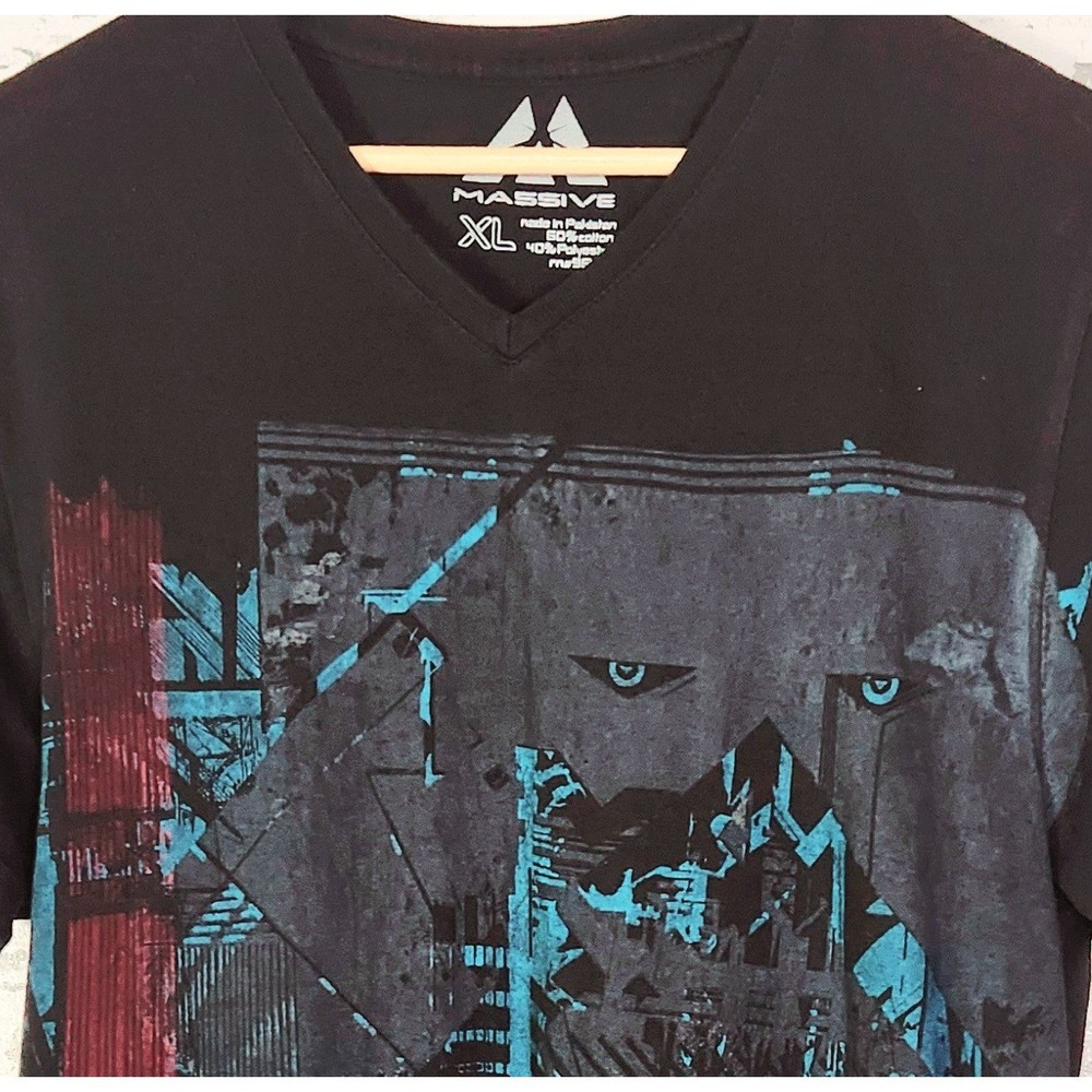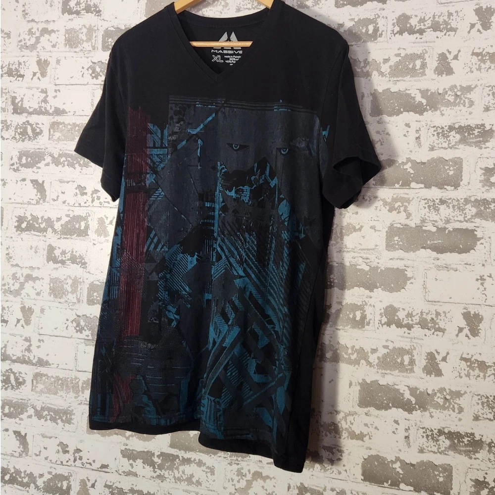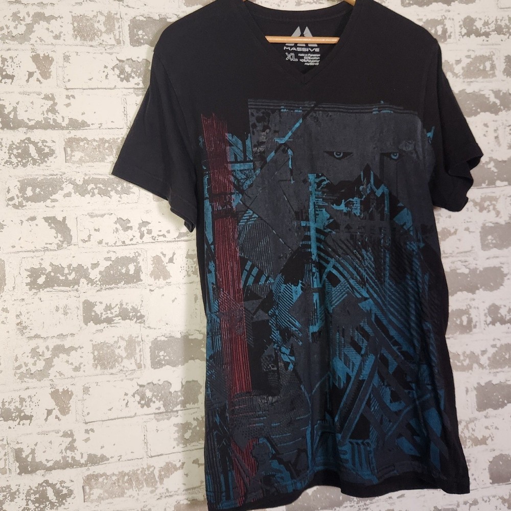 Brand: Massive Size: XL (Extra Large) Style: Short Sleeve V-Neck Material: 60% Cotton / 40% Polyester Color: Black with Blue and Red Graphic Art Condition: Pre-owned in good condition. Please see photos for exact details. Design Features This unique "Massive" brand tee features a bold, industrial-style abstract graphic. The print includes a stylized face with piercing blue eyes set against a geometric, architectural background in blue and red tones. It's a soft, breathable cotton blend perfect for casual wear or as a statement piece. Measurements (Lying Flat) Pit to Pit: Approx. 23 inches Length: Approx. 27 inches Please review measurements in the photos to insure a good and proper fit. Care Instructions: Machine wash cold with like colors. Tumble dry low. Note: Colors may vary slightly due to lighting and monitor settings. Please refer to the measurement photos to ensure a proper fit. Keywords: graphic tee, abstract print, V-neck shirt, short sleeve tee, mens casual wear, statement shirt, geometric design, urban style, streetwear, bold graphic, comfortable tee, versatile shirt We offer a 30-day money back refund, buyer pays return shipping. Orders will ship within 2 business days of order and payment. Thank you for your business and have a great day.