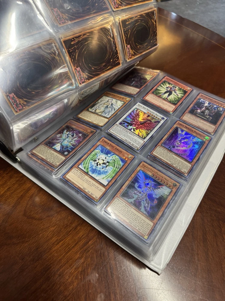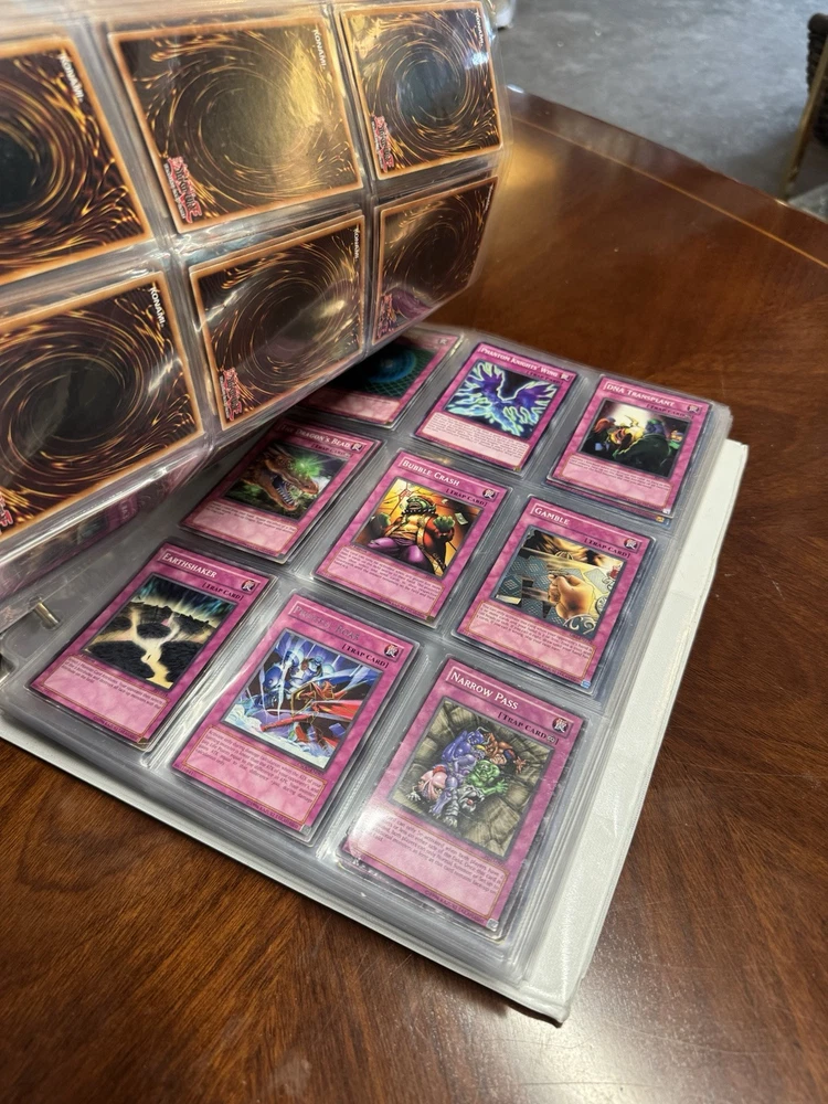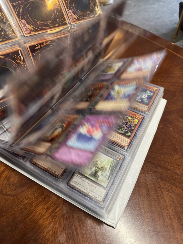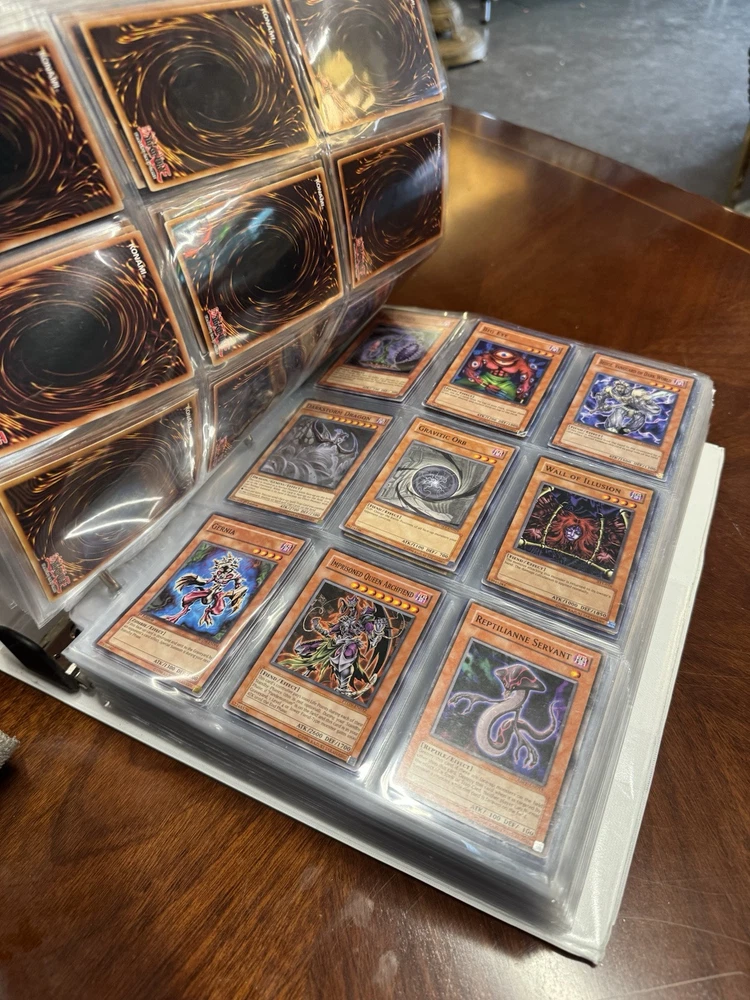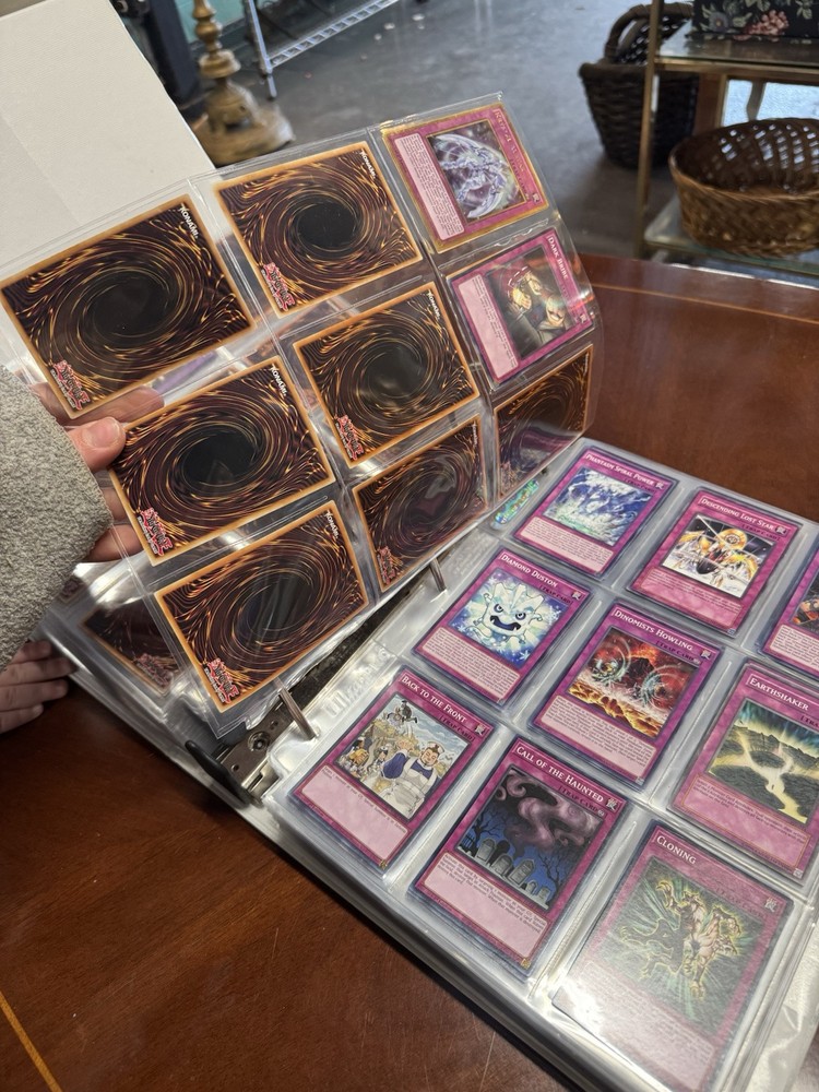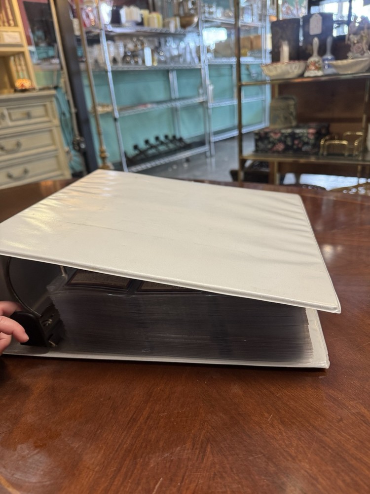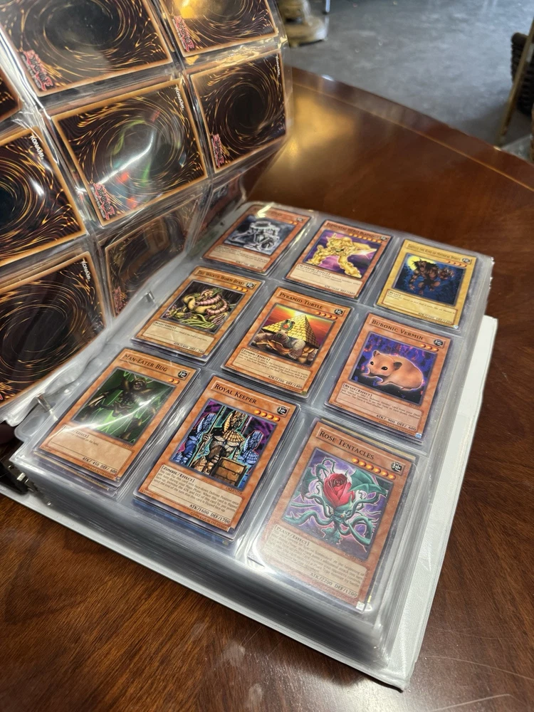 This is AS FOUND! There are at least 945 cards, I counted all the pages but left out the pages that were not 100% filled. Some pages may have 3-6 cards on them but that is very few pages and I did not include those in the total. This is a storage unit find, huge binder. All unsearched, I just don’t have the time. towards the back of the book there are many purple and green/teal cards. The majority are the classic colored cards lol, if you cant tell i have no idea about any of this stuff. MAINLY 1996 from what pages i saw, i did see a couple 2020. I did not look at each page