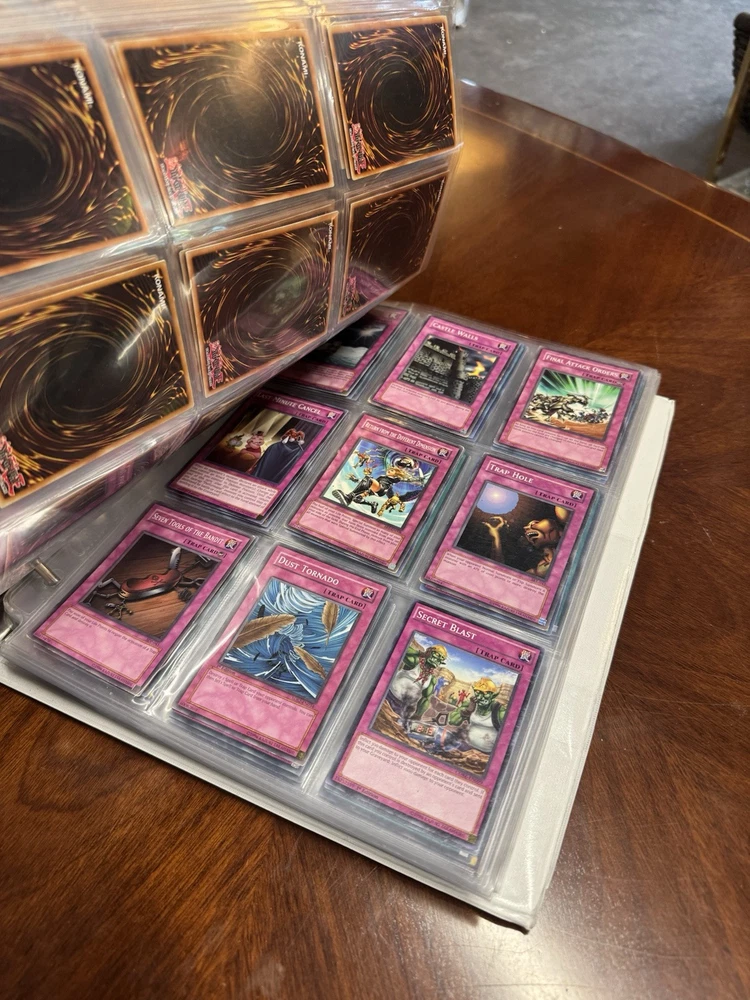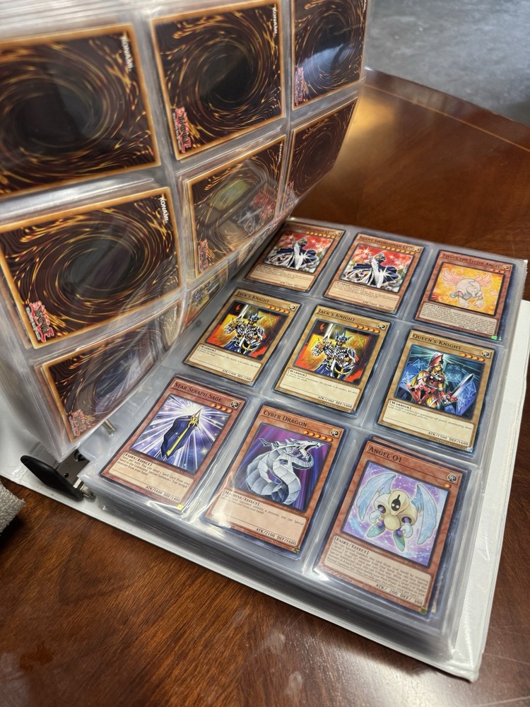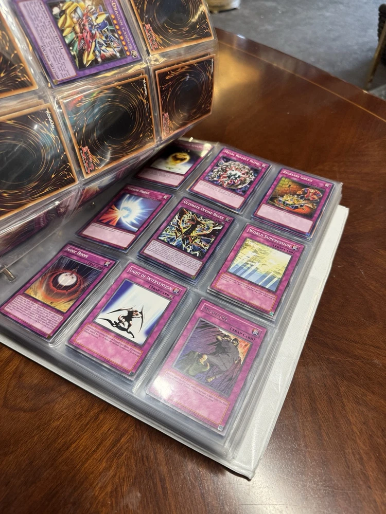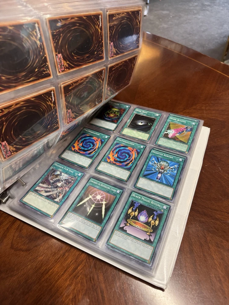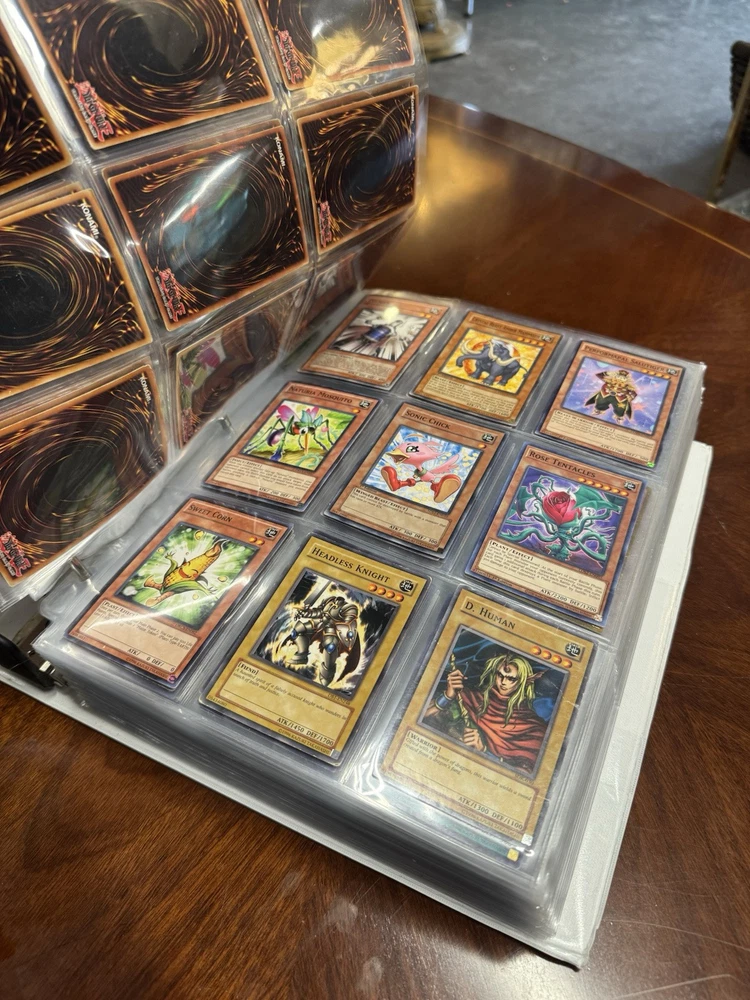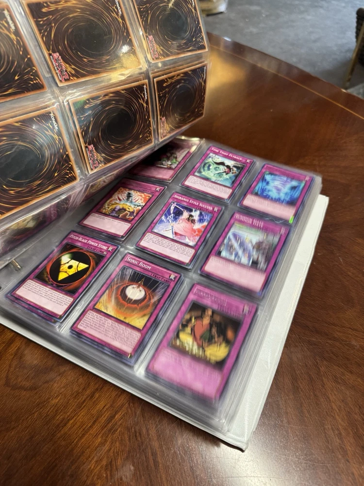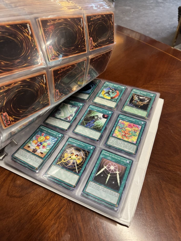 This is AS FOUND! There are at least 945 cards, I counted all the pages but left out the pages that were not 100% filled. Some pages may have 3-6 cards on them but that is very few pages and I did not include those in the total. This is a storage unit find, huge binder. All unsearched, I just don’t have the time. towards the back of the book there are many purple and green/teal cards. The majority are the classic colored cards lol, if you cant tell i have no idea about any of this stuff. MAINLY 1996 from what pages i saw, i did see a couple 2020. I did not look at each page