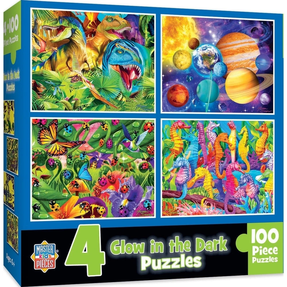 The MasterPieces Glow in the Dark (Blue) 4 Pack - 100 Piece Kids Jigsaw Puzzle will spark your childs imagination. This captivating set features four 8" x 10" glow-in-the-dark puzzles. Created by the renowned artist Michael Searle, each puzzle features a unique theme - seahorses, dinosaurs, the solar system, and a tangle of ladybugs. Designed for children aged 6 and up, these puzzles are not only brightly colored but also glow in the dark, adding an extra touch of magic to the playtime experience. Michael Alan Searle, a talented illustrator, and designer with a successful career spanning 25 years, has poured his creativity into these captivating puzzles. Masterpieces Glow In The Dark Jigsaw Puzzles 100 Piece 4 Pack Kids V2 The MasterPieces Glow in the Dark (Blue) 4 Pack - 100 Piece Kids Jigsaw Puzzle will spark your childs imagination. This captivating set features four 8" x 10" glow-in-the-dark puzzles. Created by the renowned artist Michael Searle, each puzzle features a unique theme - seahorses, dinosaurs, the solar system, and a tangle of ladybugs. Designed for children aged 6 and up, these puzzles are not only brightly colored but also glow in the dark, adding an extra touch of magic to the playtime experience. Michael Alan Searle, a talented illustrator, and designer with a successful career spanning 25 years, has poured his creativity into these captivating puzzles. Product Attributes: Weight (lbs.) : 0.75 lb UPC: 705988120251 Brand: MasterPieces