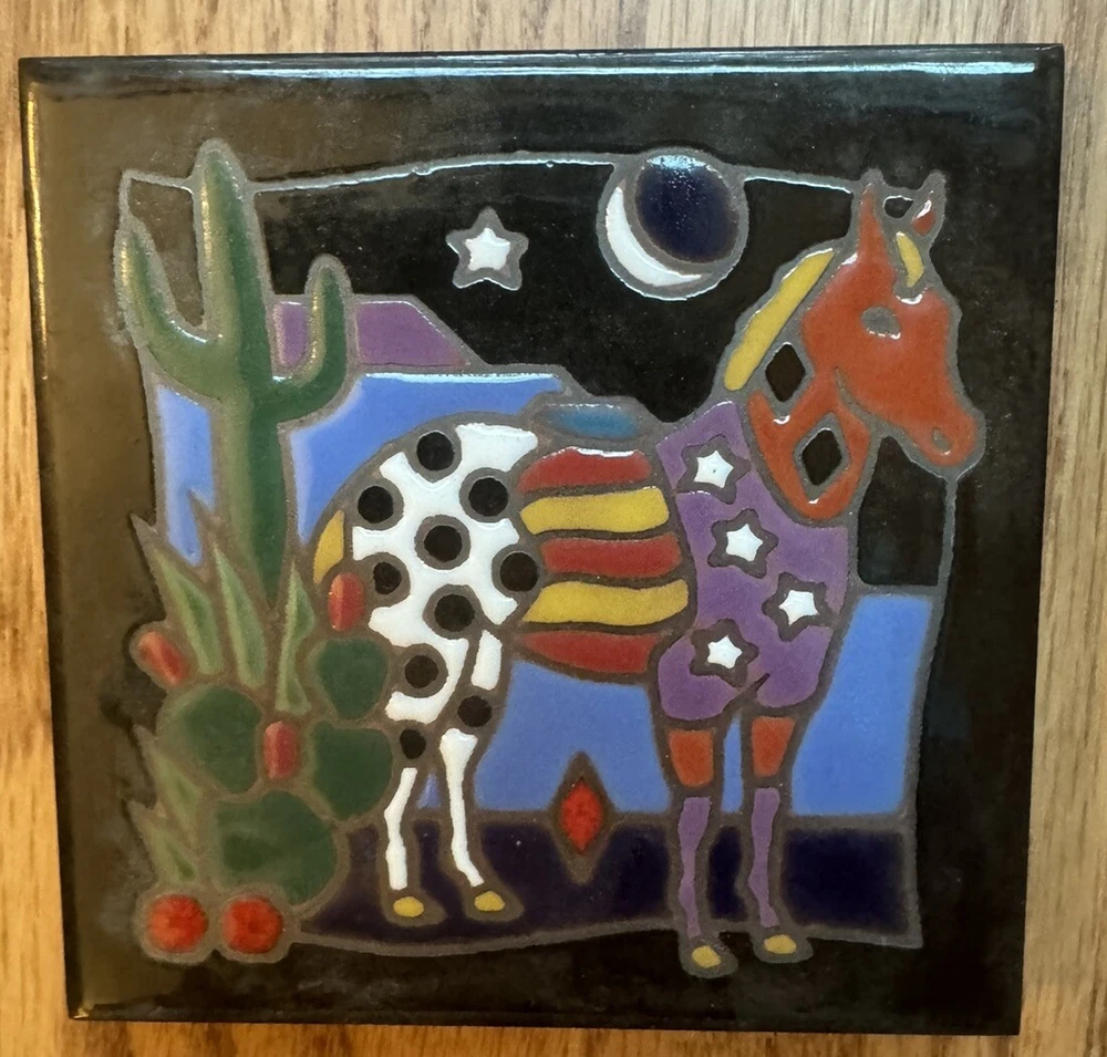 Masterworks Handcrafted Ceramic Art Tile Trivet Southwestern Donkey USA 4” X 4” This beautiful ceramic tile depicting a donkey in a Southwestern American scene can serve as a trivet, coaster or decorative item in your home. A skilled crafts person individually hand glazed this unique ceramic tile, and then carefully fired it to a glowing red hot 1850°F until the colors reached their present beauty and durability. This tile can safely take a hot dish if used as a trivet. It has particleboard backing and four cork feet. This intricate decorative tile was handcrafted in the United States of America.