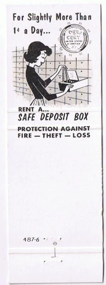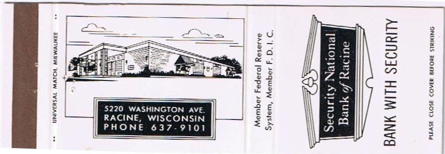 Matchbook Cover Security National Bank Of Racine WI Safe Deposit Box Matchbook Cover Security National Bank Of Racine WI Safe Deposit Box Very Good Vintage Matchbook. WE ANSWER ALL QUESTIONS WITHIN 2 BUSINESS DAYS. FOR AUCTION ITEMS, PLEASE DO NOT BID UNTIL WE HAVE RESPONDED TO YOUR QUESTION. PLEASE LOOK AT ALL PHOTOS AS THIS IS THE EXACT ITEM YOU ARE BIDDING ON OR PURCHASING. EXPECT ITEMS TO BE IN NORMAL VINTAGE USED CONDITION. WE TRY TO SPECIFY ALL FLAWS. IF THERE IS A PROBLEM WHEN YOU RECEIVE YOUR ITEM PLEASE CONTACT US BEFORE LEAVING FEEDBACK. INTERNATIONAL BUYERS are responsible for paying all import duty, tax and fees which may be collected by your country when the parcel arrives. To avoid any misunderstanding, we declare the exact purchase price as the value of the goods when completing the customs declaration. We will NOT check the "gift" box or under-declare the value . Listing and template services provided by inkFrog