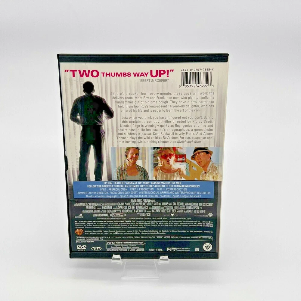 Director:Ridley ScottRating:PG-13Movie/TV Title:Matchstick MenRelease Year:2004Actor:Sam Rockwell, Nicolas CageUPC:0085392467723Genre:DramaEdition:WidescreenSeller Notes:“Tested and guaranteed to play.”gtin13:0085392467723Format:DVDFeatures:Widescreen