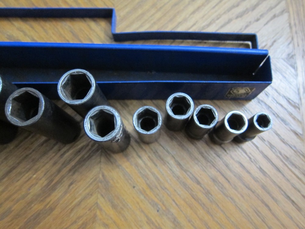 Matco 3/8 drive deep socket set with tray sizes are, 19mm, 18mm, 17mm, 16mm, 15mm, 14mm, 13mm, 12mm, 11mm, 10mm, 8mm, expect some wear corrosion usa shipping
